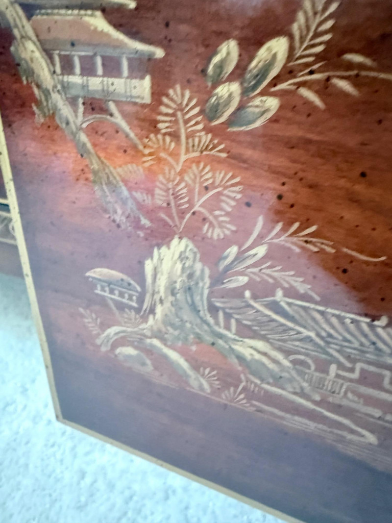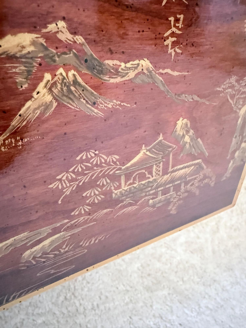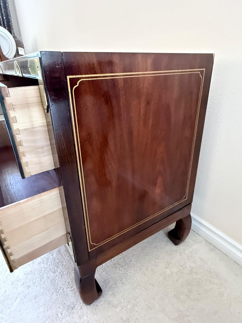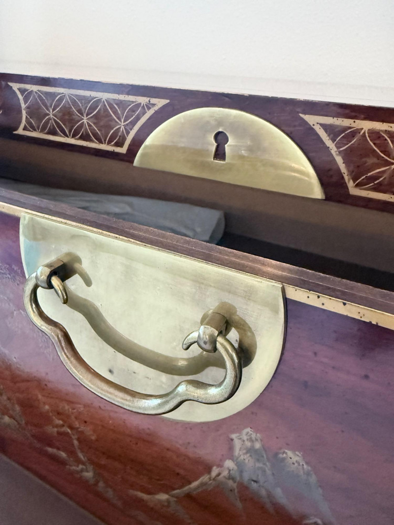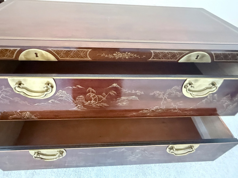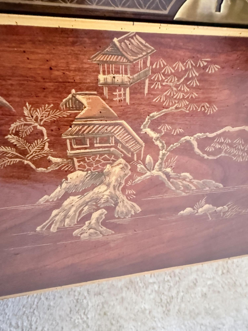 Pair of Vintage Korean Two-Drawer Chests A matching pair of two-drawer chests featuring etched landscape scenes across the drawer fronts. The designs depict architectural and mountain elements framed by geometric borders and brass corner plates. Each drawer includes circular backplates with drop handles and keyholes. The drawer boxes are joined with dovetail construction. The chests rest on shaped legs and show inlaid linework on the side panels. Dimensions (each):