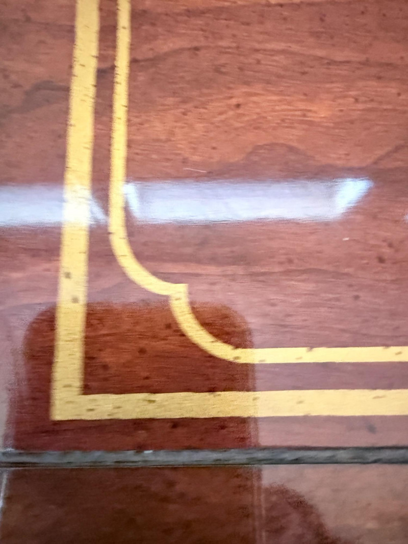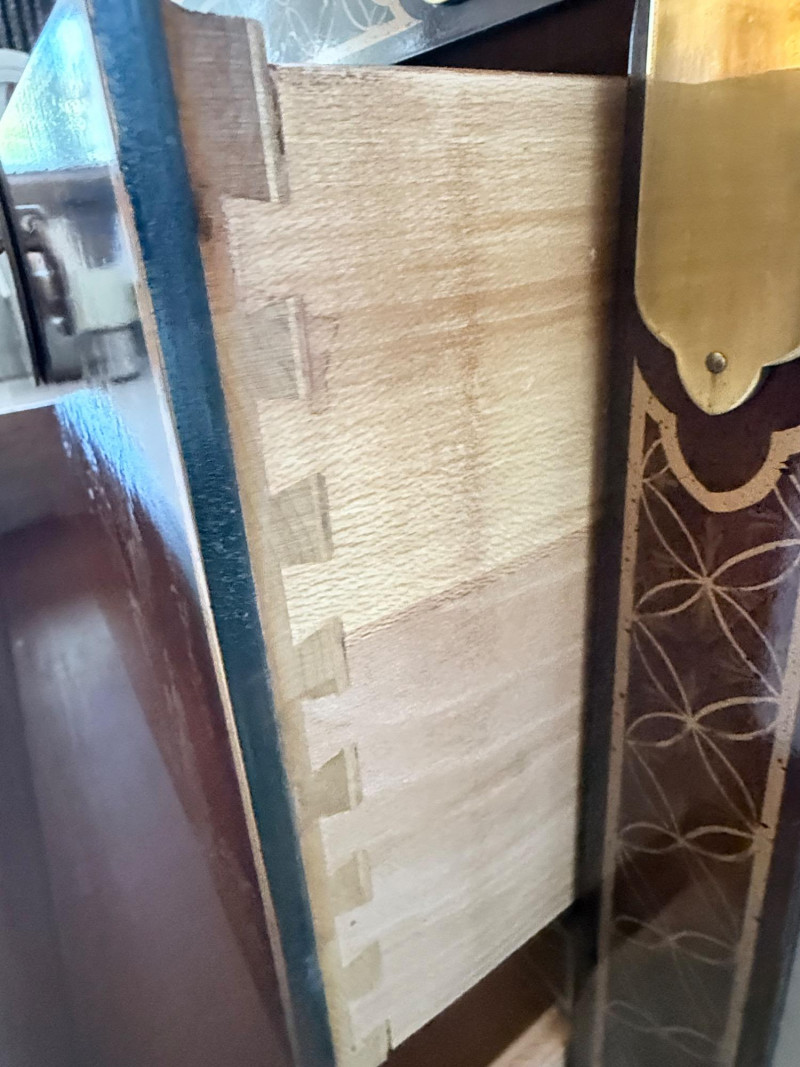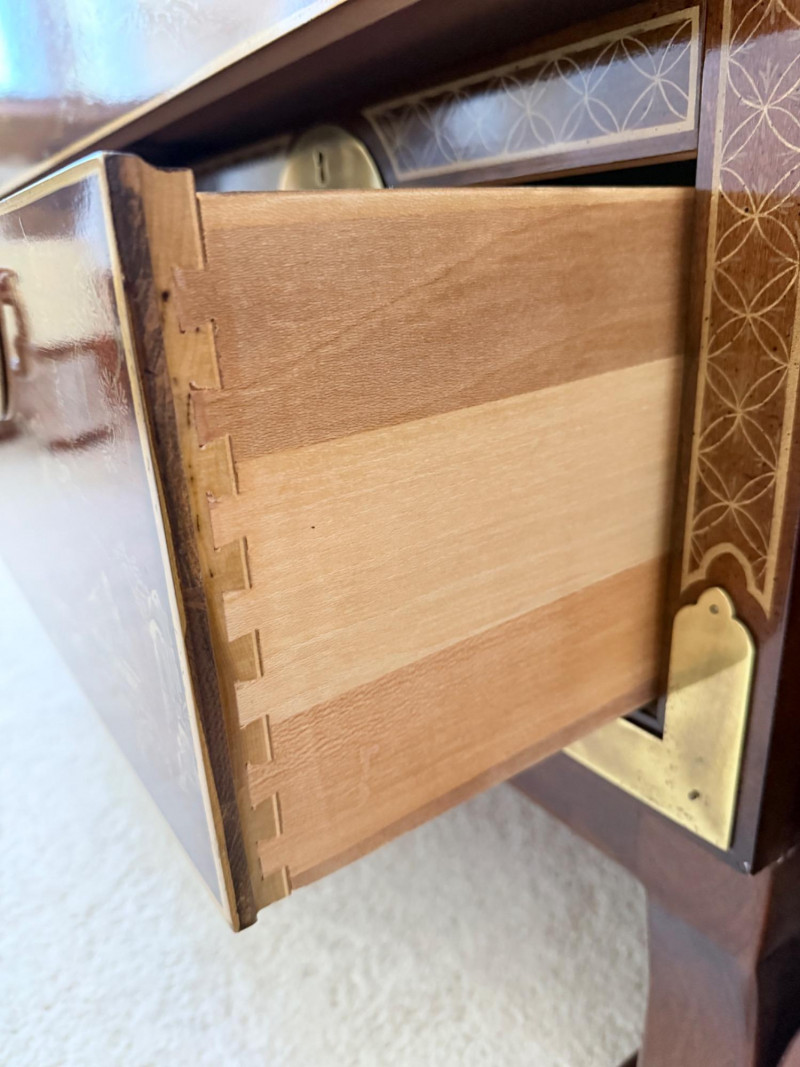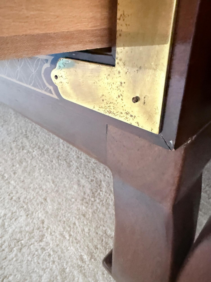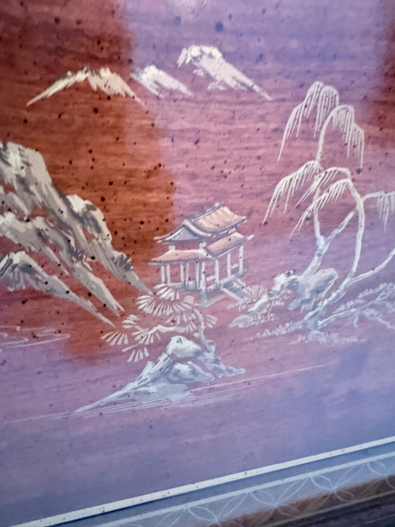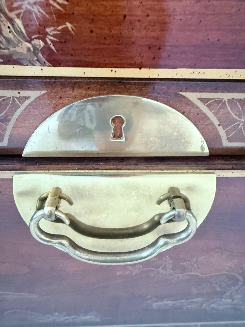 Pair of Vintage Korean Two-Drawer Chests A matching pair of two-drawer chests featuring etched landscape scenes across the drawer fronts. The designs depict architectural and mountain elements framed by geometric borders and brass corner plates. Each drawer includes circular backplates with drop handles and keyholes. The drawer boxes are joined with dovetail construction. The chests rest on shaped legs and show inlaid linework on the side panels. Dimensions (each):