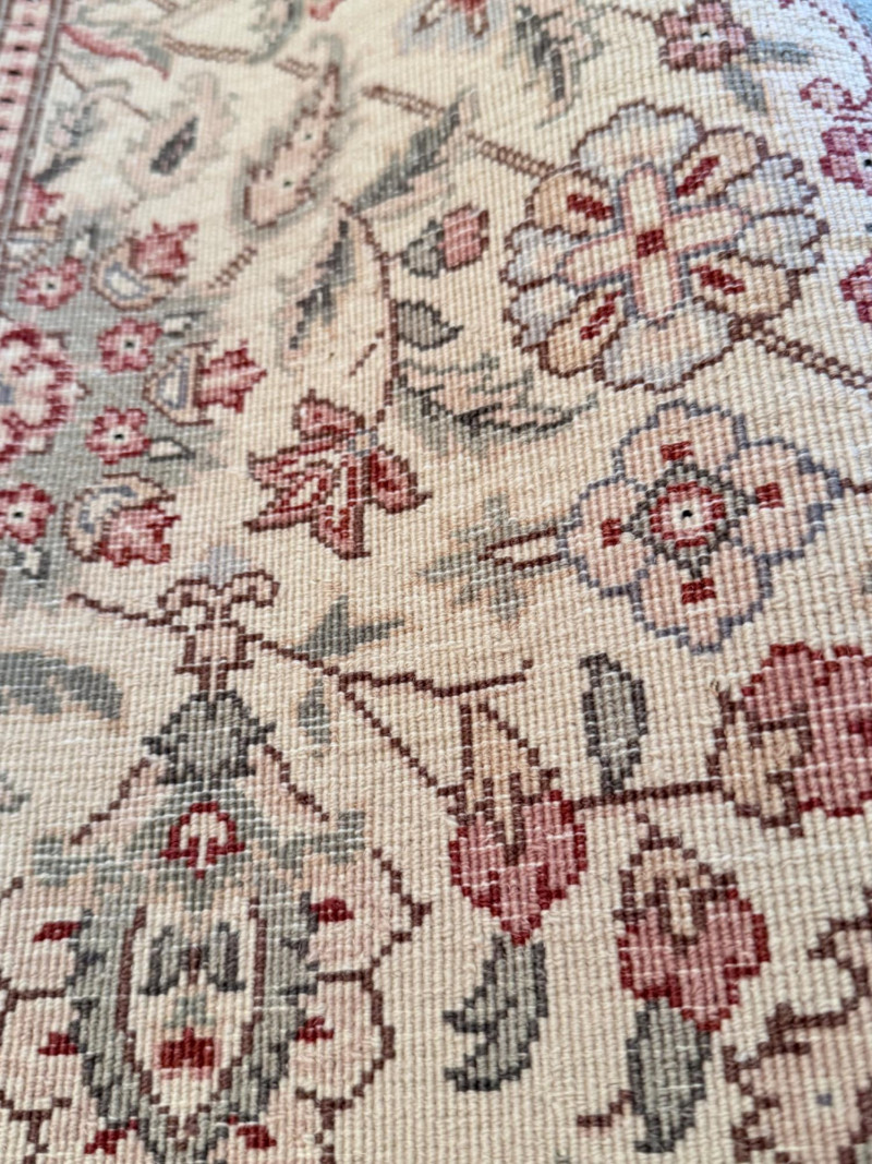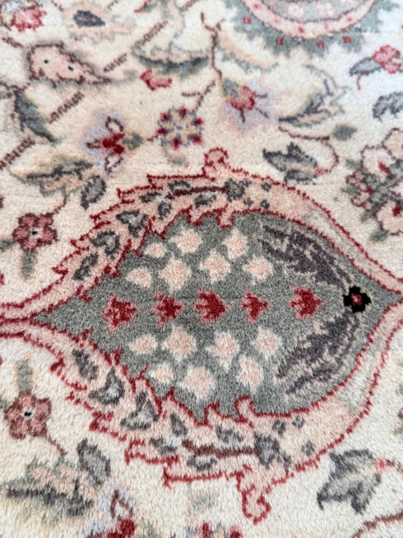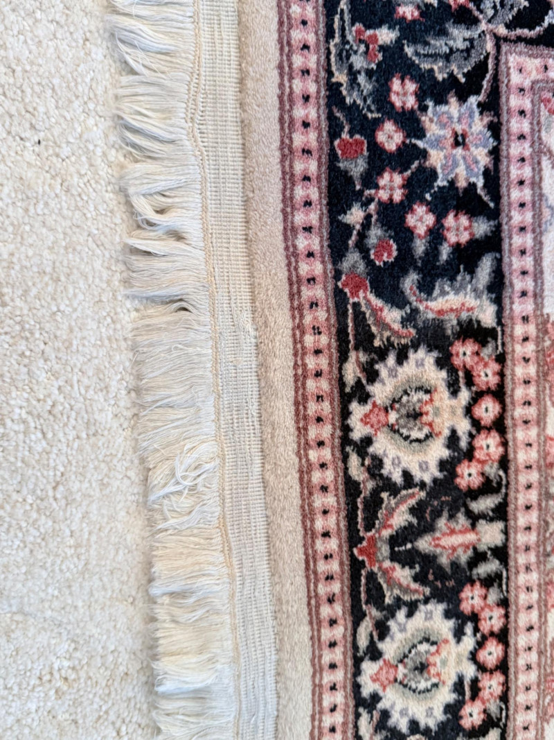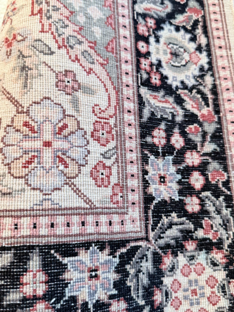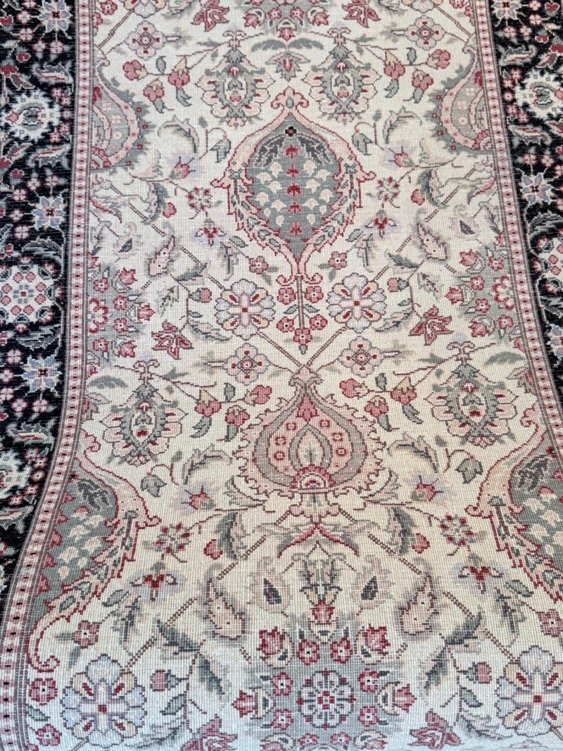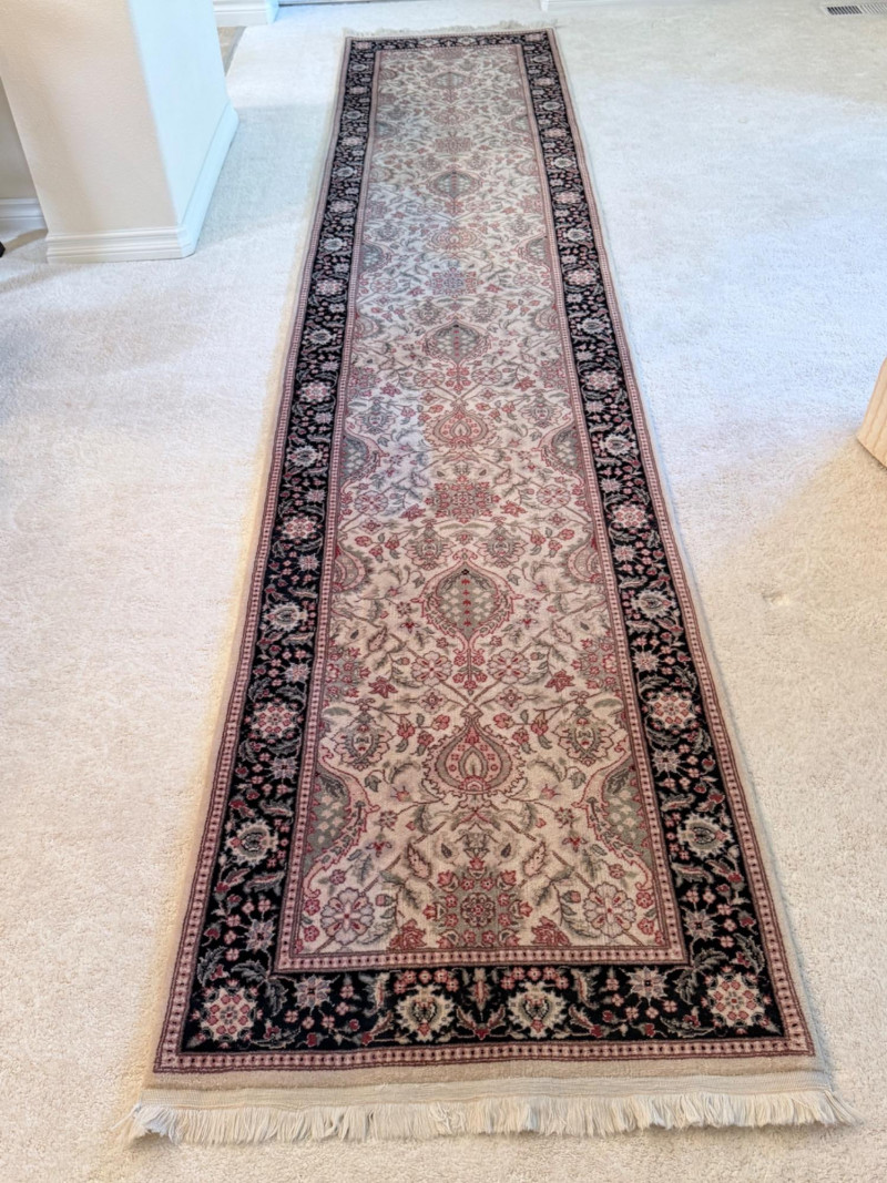 Persian-Style Runner Rug with Floral Medallion Pattern Hand-knotted runner featuring a central floral medallion layout surrounded by a repeating botanical field. The pattern is composed of palmettes, vines, and stylized blossoms across a neutral ground, with a contrasting border of dense floral motifs on a darker field. The rug includes a short fringe at each end, and the reverse reveals closely woven construction. Dimensions: