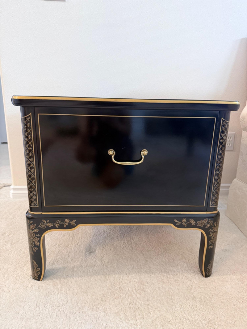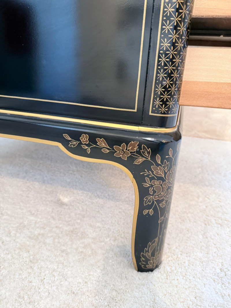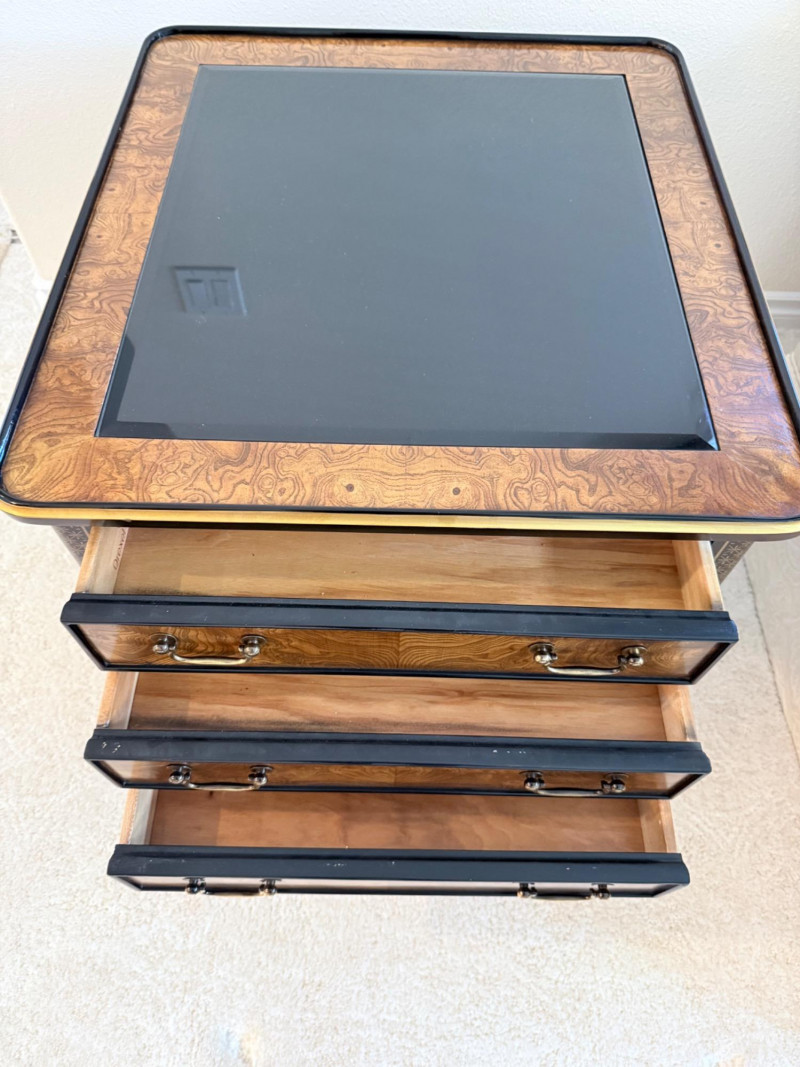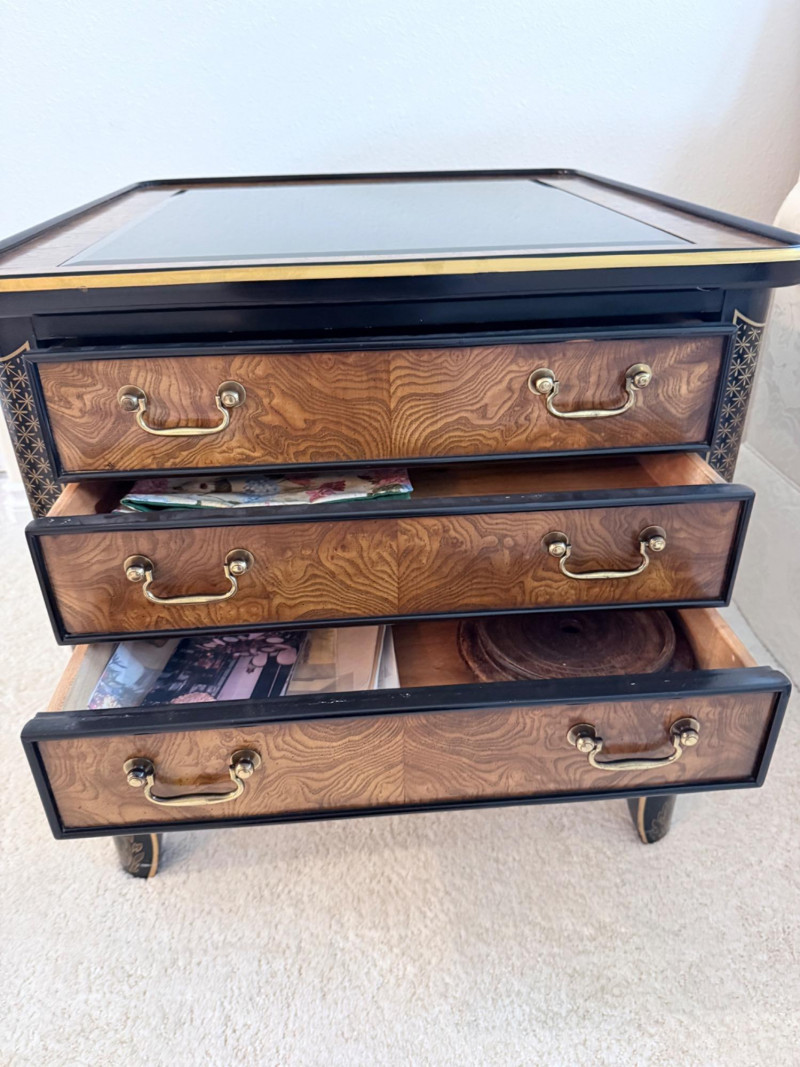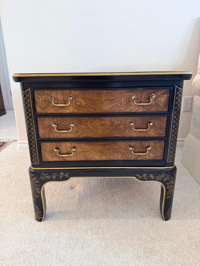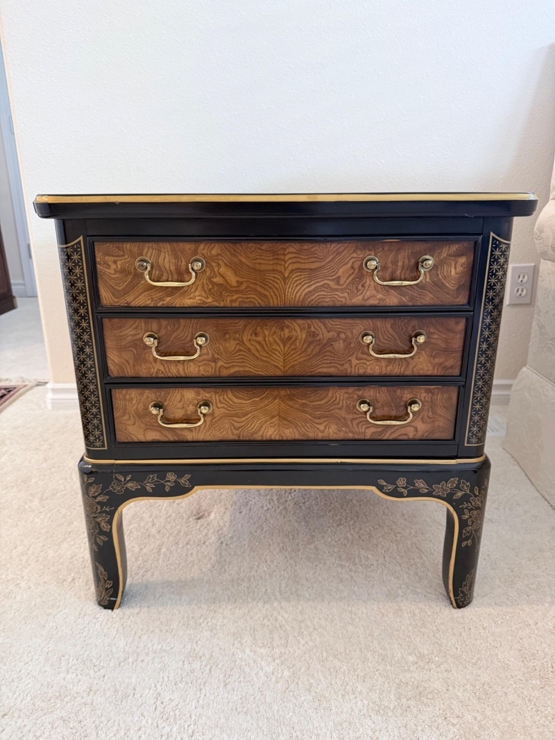 Drexel Heritage “Et Cetera” 3-Drawer Lacquered Side Table Side table with three drawers, finished in black lacquer with floral and geometric detailing along the legs and corners. The drawer fronts are veneered in patterned burl wood and fitted with brass handles. The top surface features a black lacquer center panel bordered by wood grain trim. The drawers open on wooden glides and are joined with dovetail construction. Possibly a Drexel Heritage “Et Cetera” piece. Dimensions: