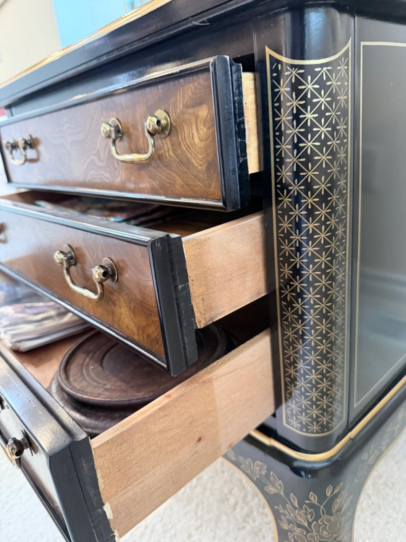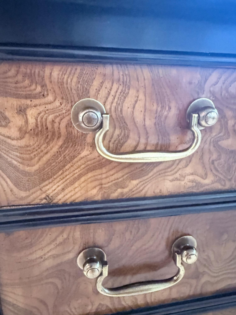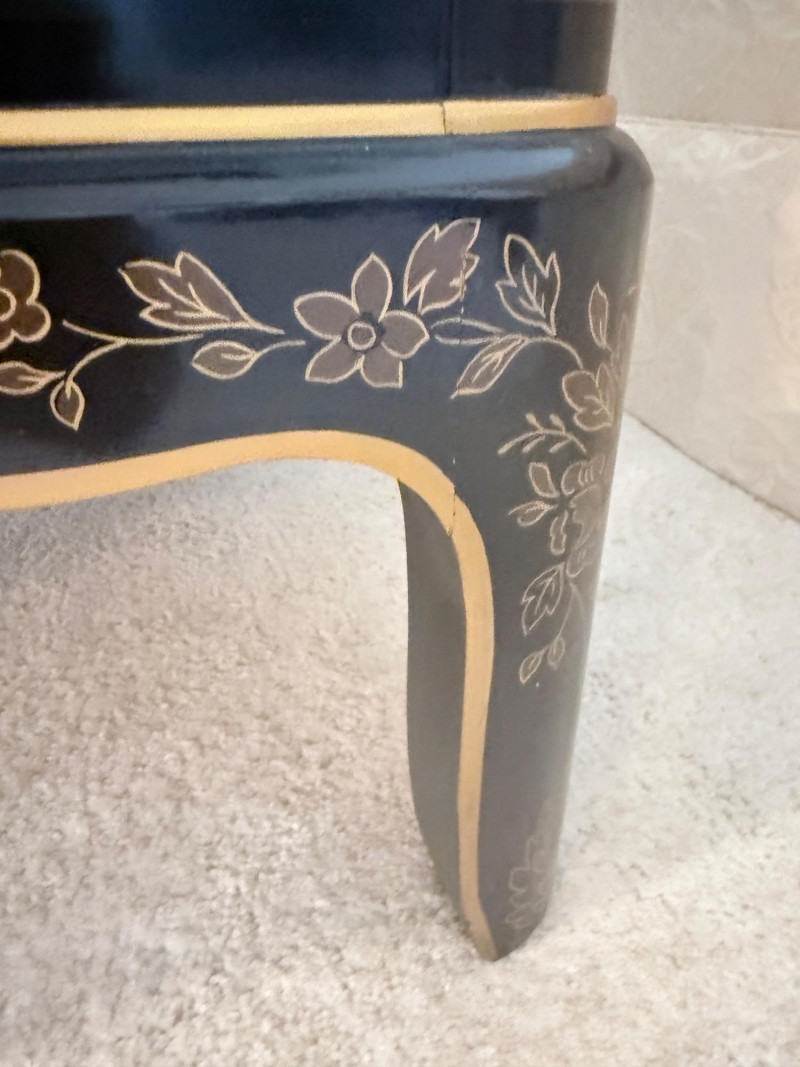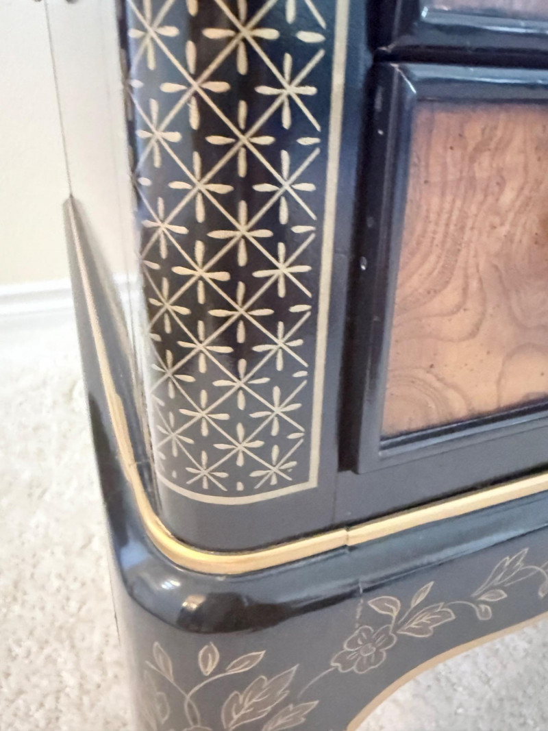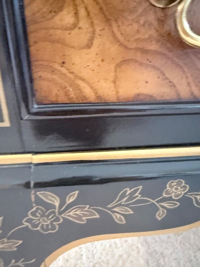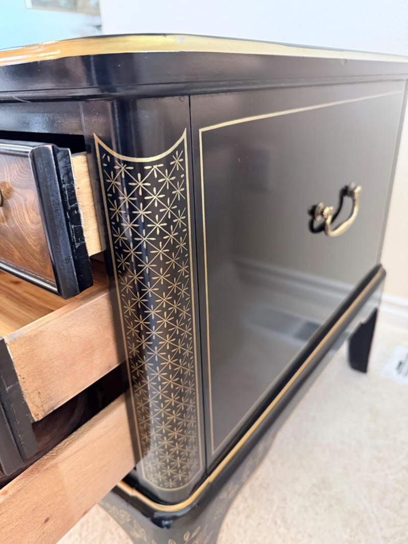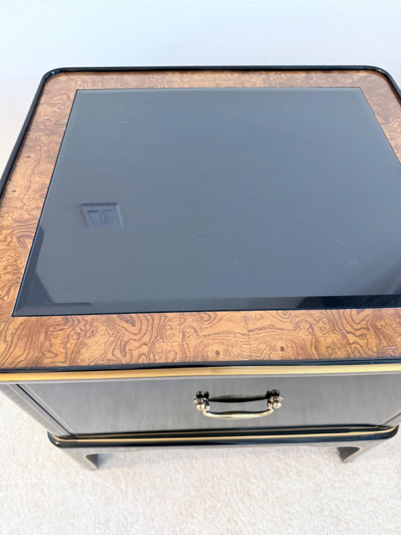 Drexel Heritage “Et Cetera” 3-Drawer Lacquered Side Table Side table with three drawers, finished in black lacquer with floral and geometric detailing along the legs and corners. The drawer fronts are veneered in patterned burl wood and fitted with brass handles. The top surface features a black lacquer center panel bordered by wood grain trim. The drawers open on wooden glides and are joined with dovetail construction. Possibly a Drexel Heritage “Et Cetera” piece. Dimensions: