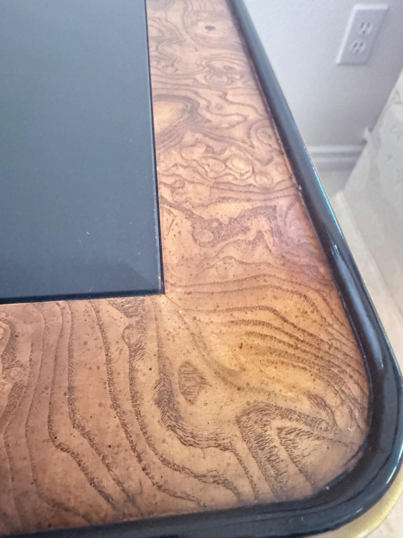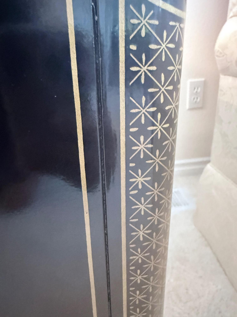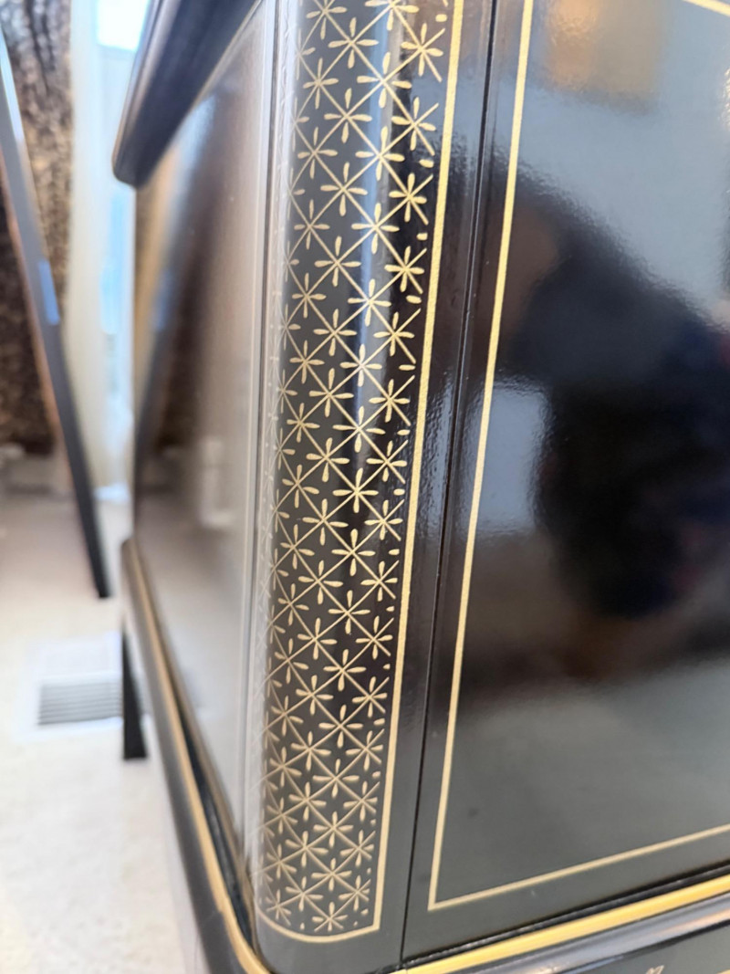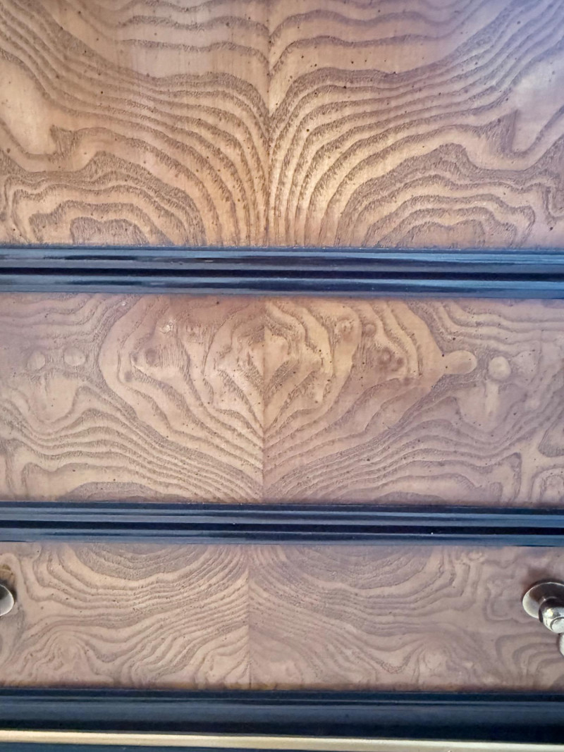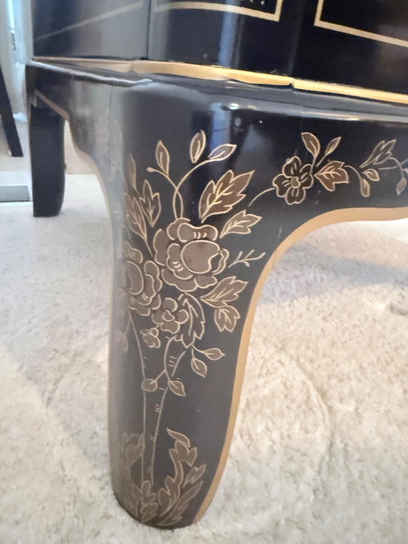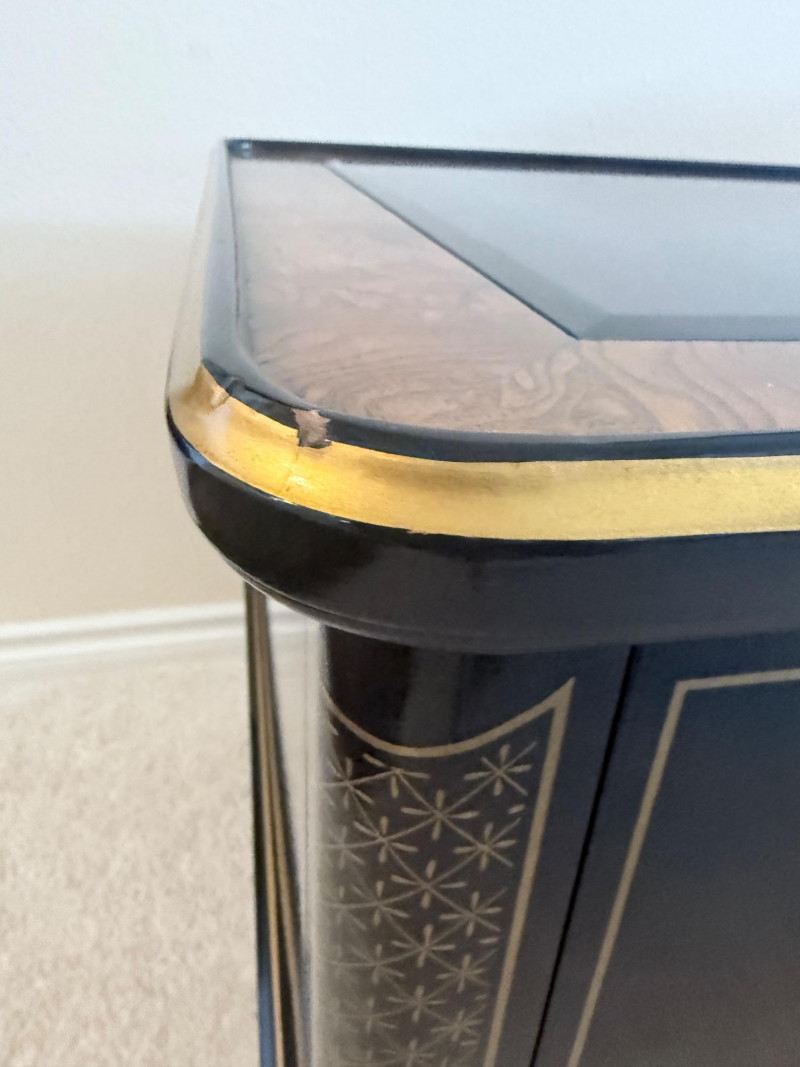 Drexel Heritage “Et Cetera” 3-Drawer Lacquered Side Table Side table with three drawers, finished in black lacquer with floral and geometric detailing along the legs and corners. The drawer fronts are veneered in patterned burl wood and fitted with brass handles. The top surface features a black lacquer center panel bordered by wood grain trim. The drawers open on wooden glides and are joined with dovetail construction. Possibly a Drexel Heritage “Et Cetera” piece. Dimensions: