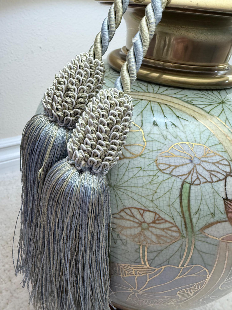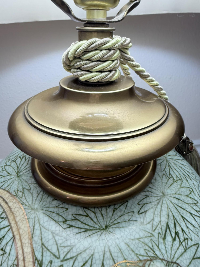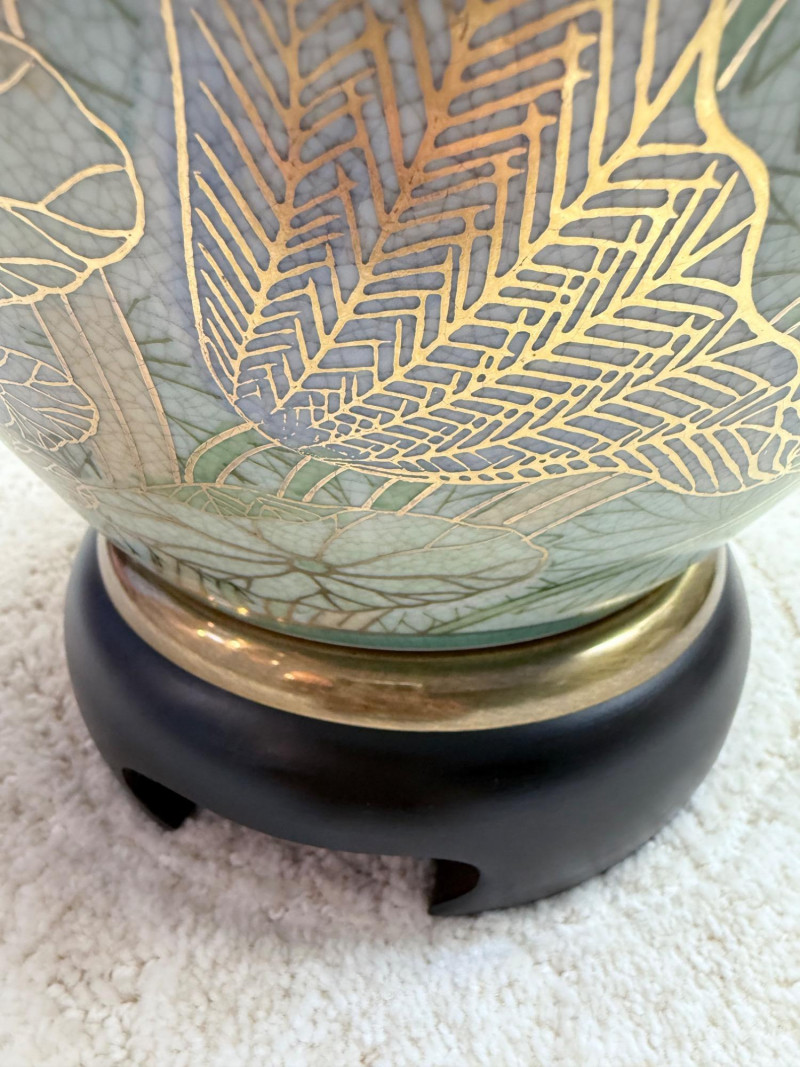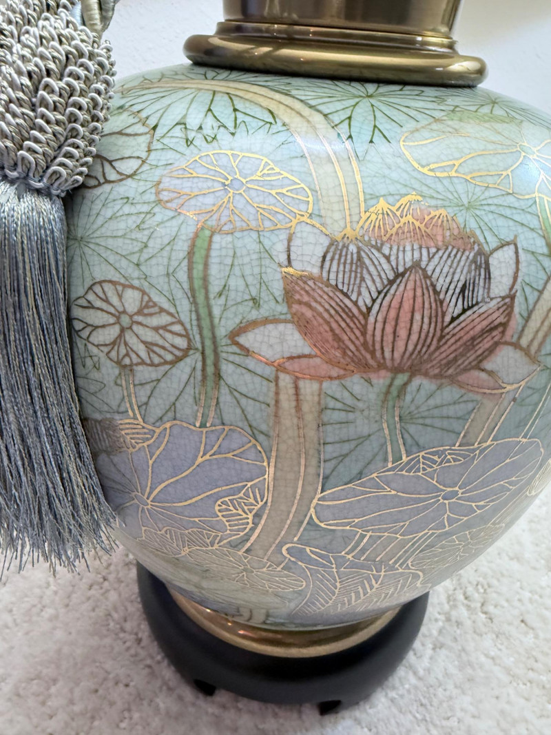 Pair of Mid-Century Ceramic Table Lamps with Lotus Motif and Wood Base A pair of mid-century ceramic table lamps featuring a continuous lotus and lily pad motif rendered with fine line detailing. Each vessel has a crackle glaze finish and rests on a round wood base. The lamps are fitted with brass-toned hardware and wrapped with decorative tassels at the neck. The flared, paneled shades are covered in ribbed fabric and finished with trim along the lower edge. Both lamps are in working condition. Dimensions: