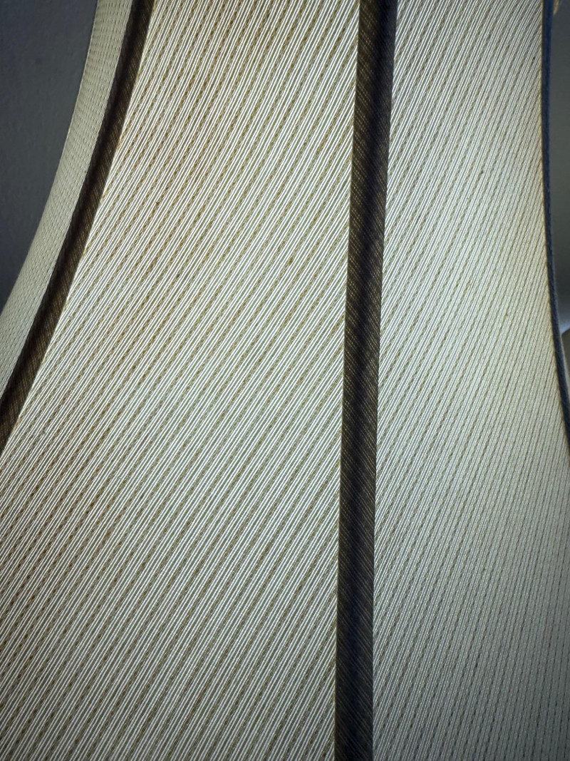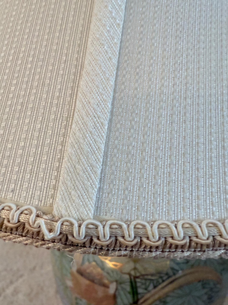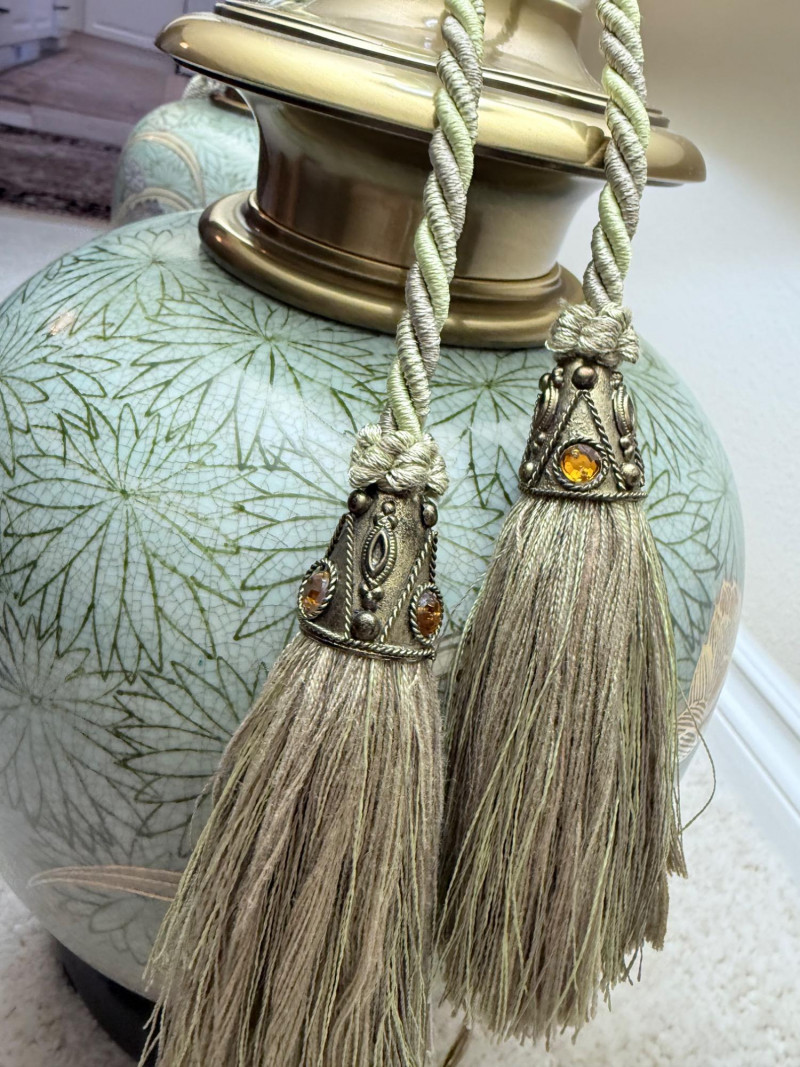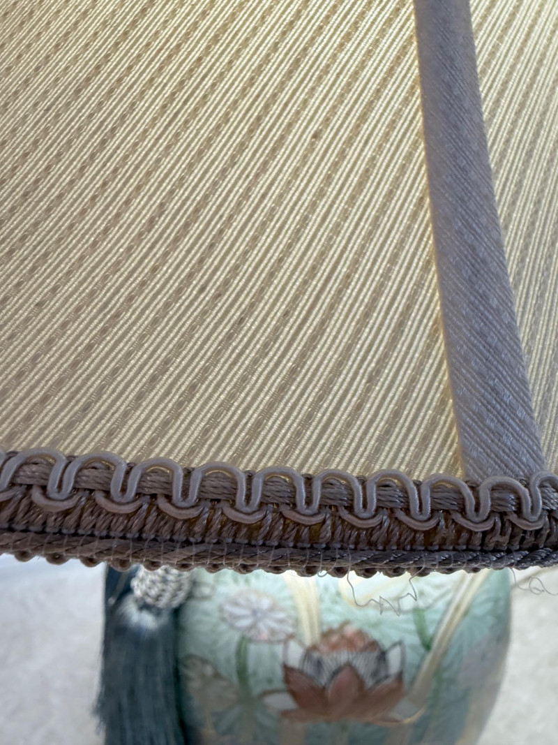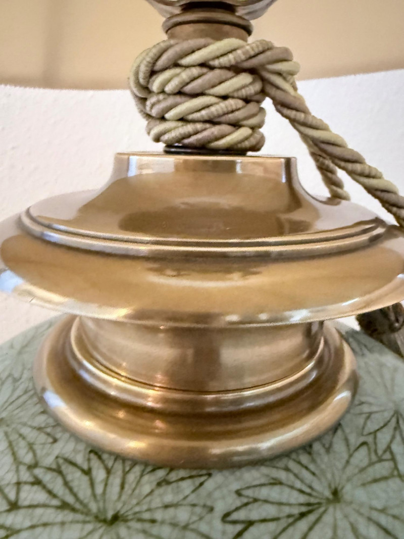 Pair of Mid-Century Ceramic Table Lamps with Lotus Motif and Wood Base A pair of mid-century ceramic table lamps featuring a continuous lotus and lily pad motif rendered with fine line detailing. Each vessel has a crackle glaze finish and rests on a round wood base. The lamps are fitted with brass-toned hardware and wrapped with decorative tassels at the neck. The flared, paneled shades are covered in ribbed fabric and finished with trim along the lower edge. Both lamps are in working condition. Dimensions: