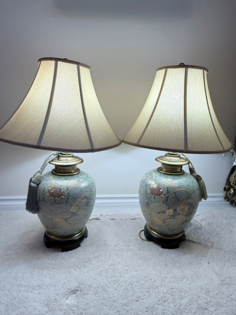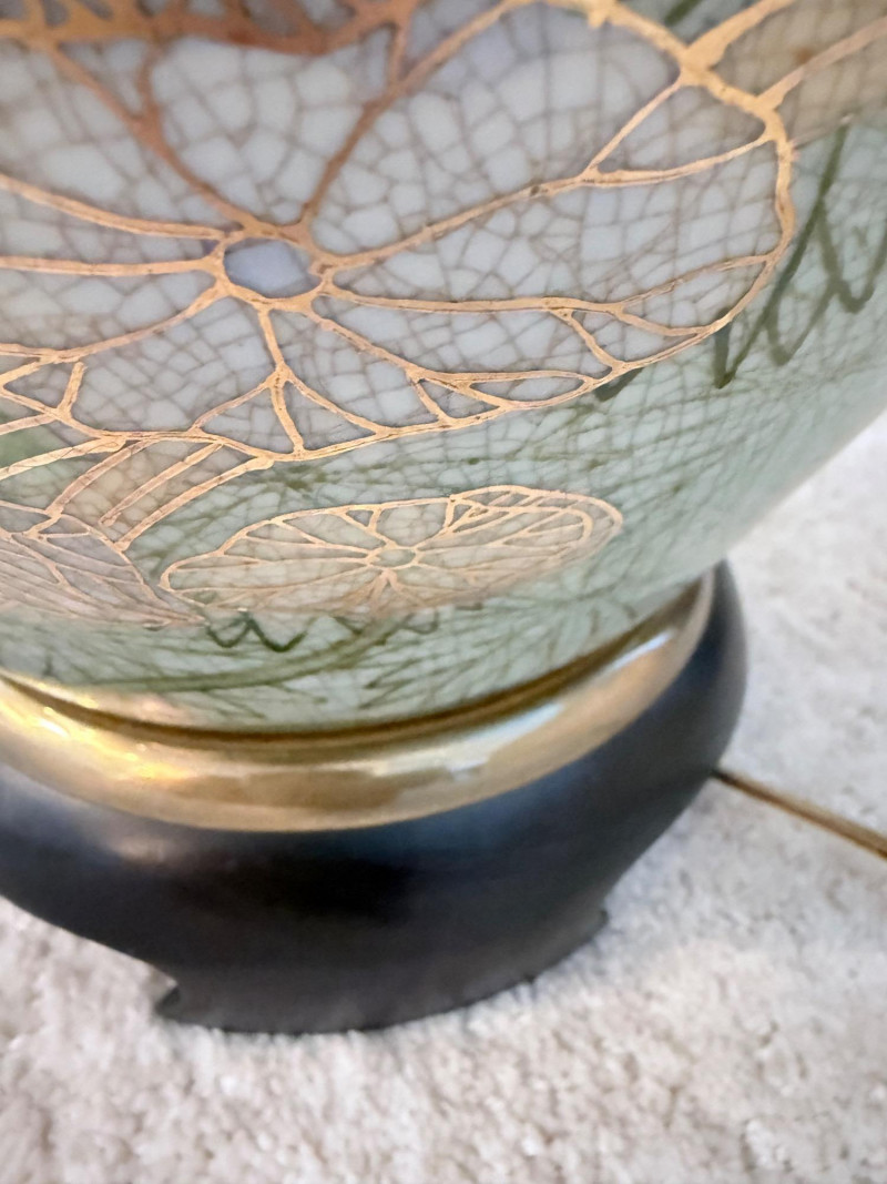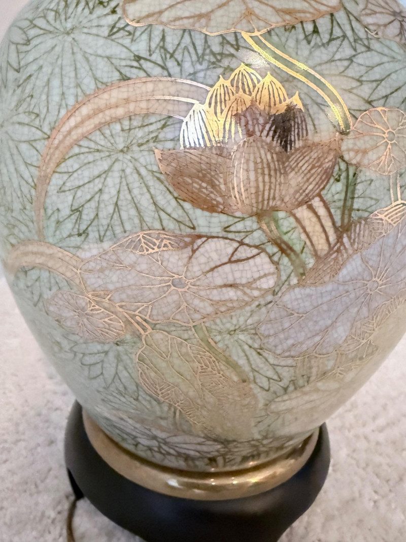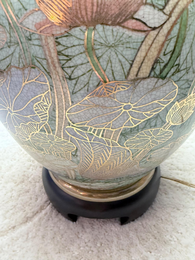 Lot # 112 - Pair of Mid-Century Ceramic Table Lamps with Lotus Motif and Wood Base