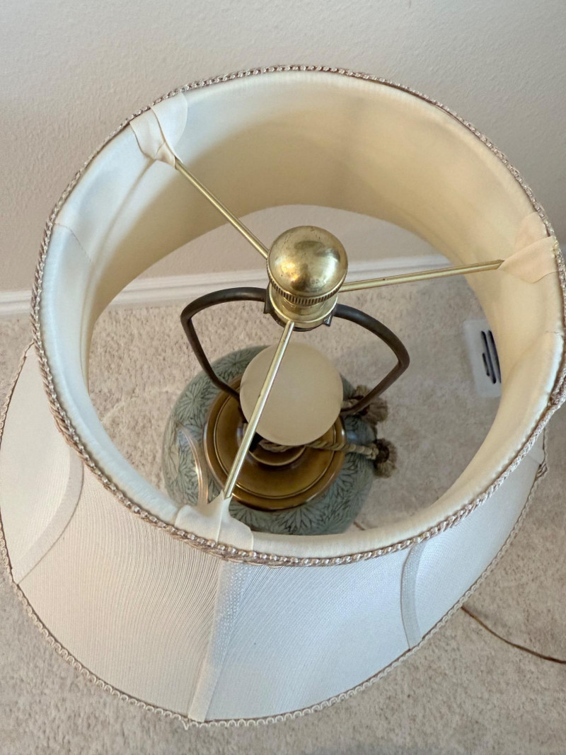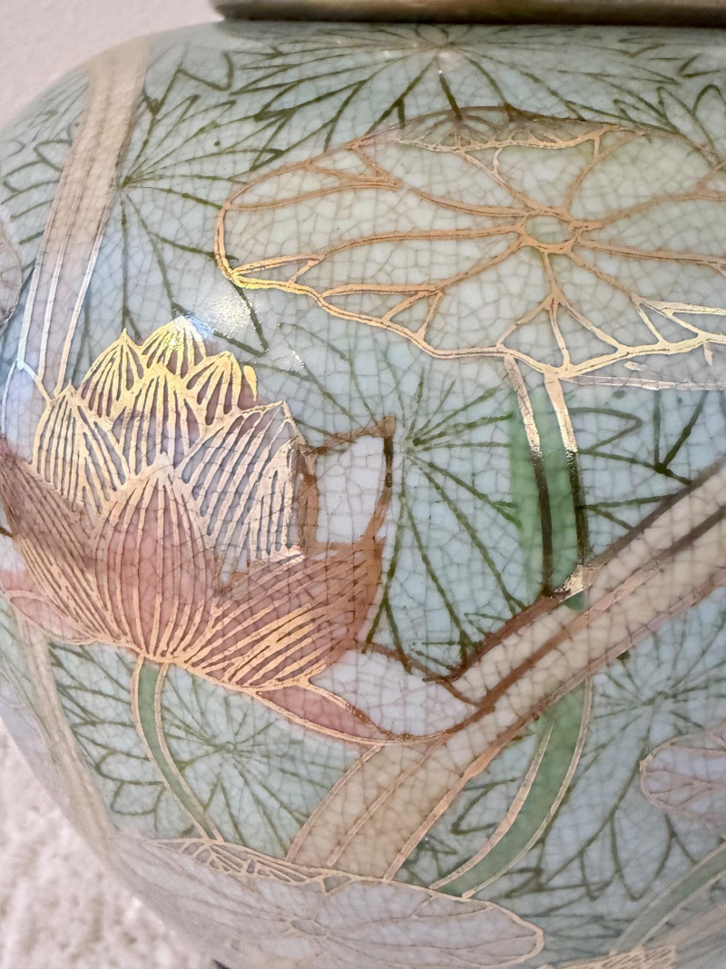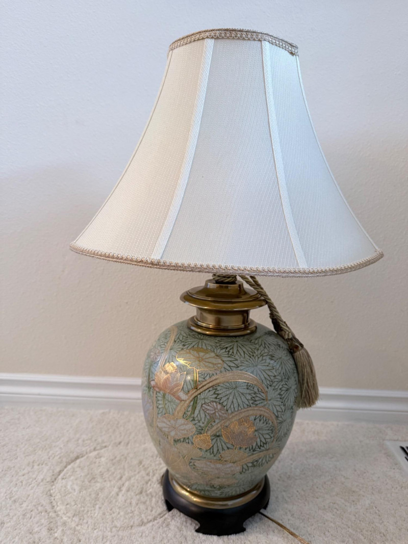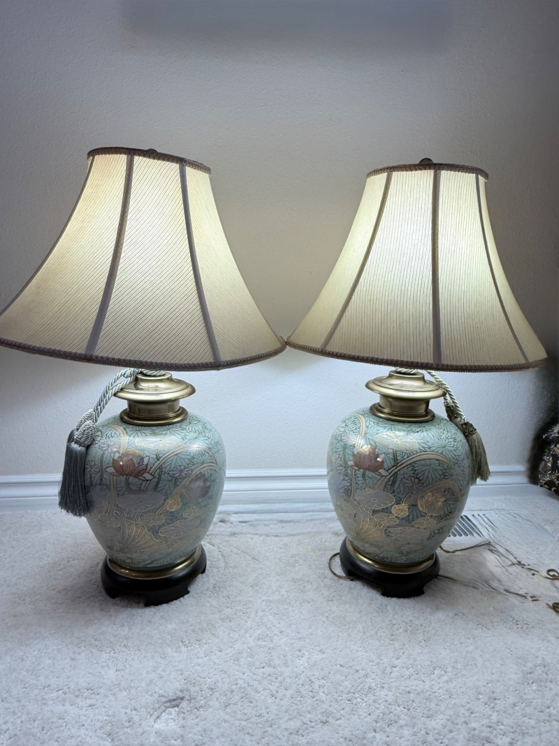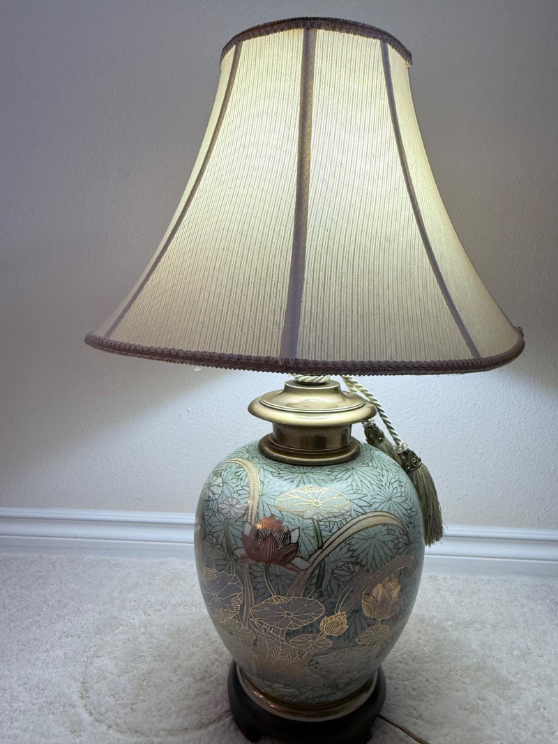 Lot # 112 - Pair of Mid-Century Ceramic Table Lamps with Lotus Motif and Wood Base