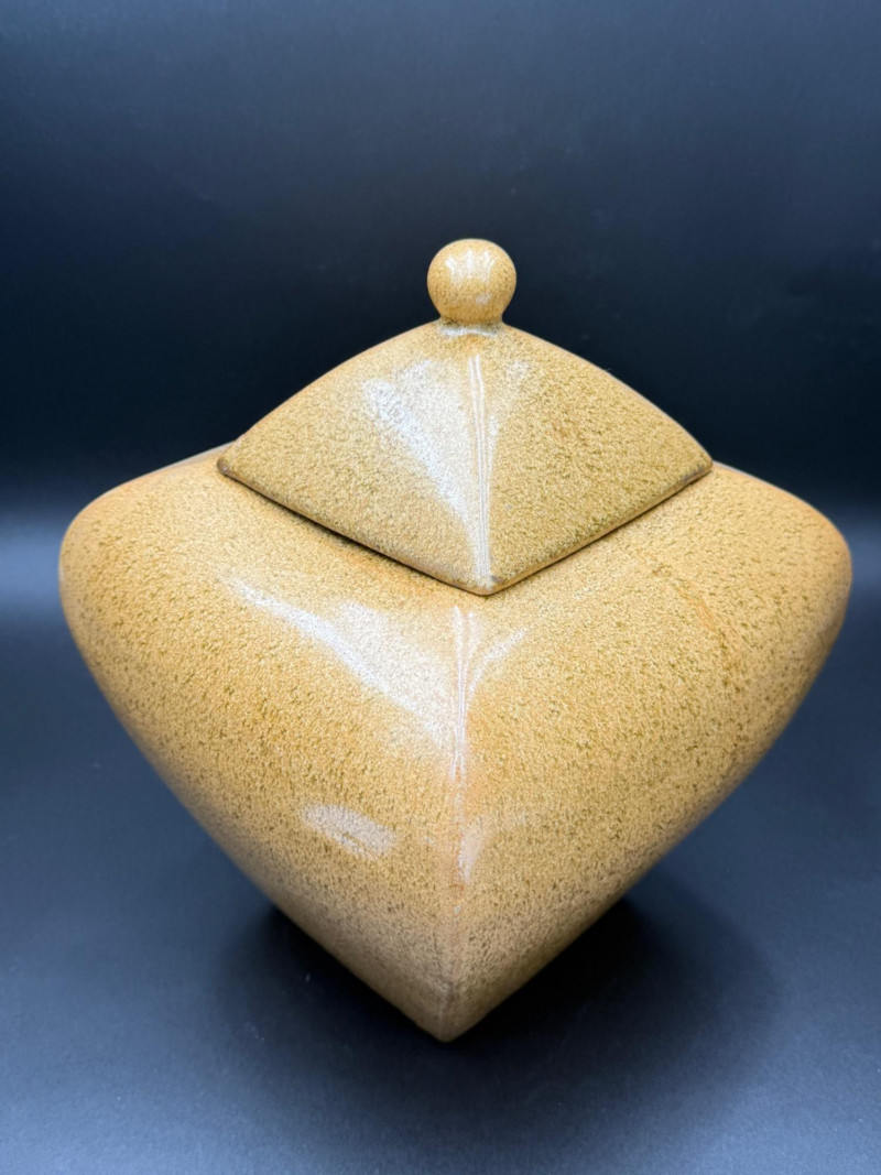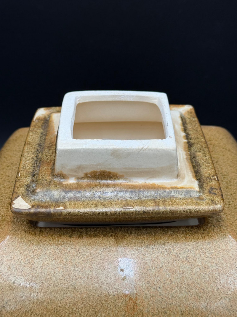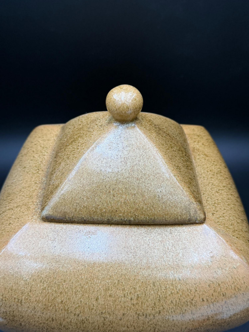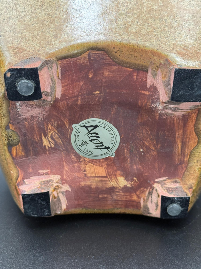 Oriental Accent Speckled Ceramic Lidded Jar Ceramic lidded jar with a wide, tapering body and a square, stepped lid topped by a rounded finial. The surface is coated in a speckled glaze. The base is fitted with corner pads and bears a label from “Oriental Accent – Since 1880,” a producer of East Asian-style decorative objects. Dimensions: