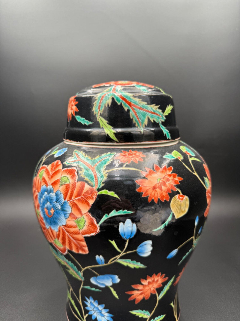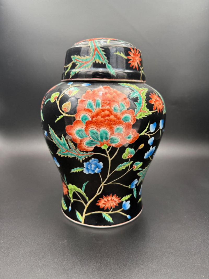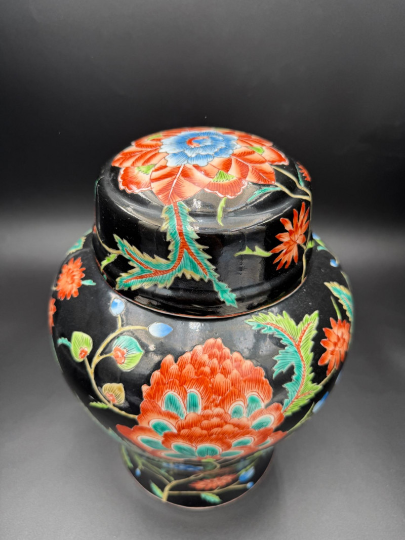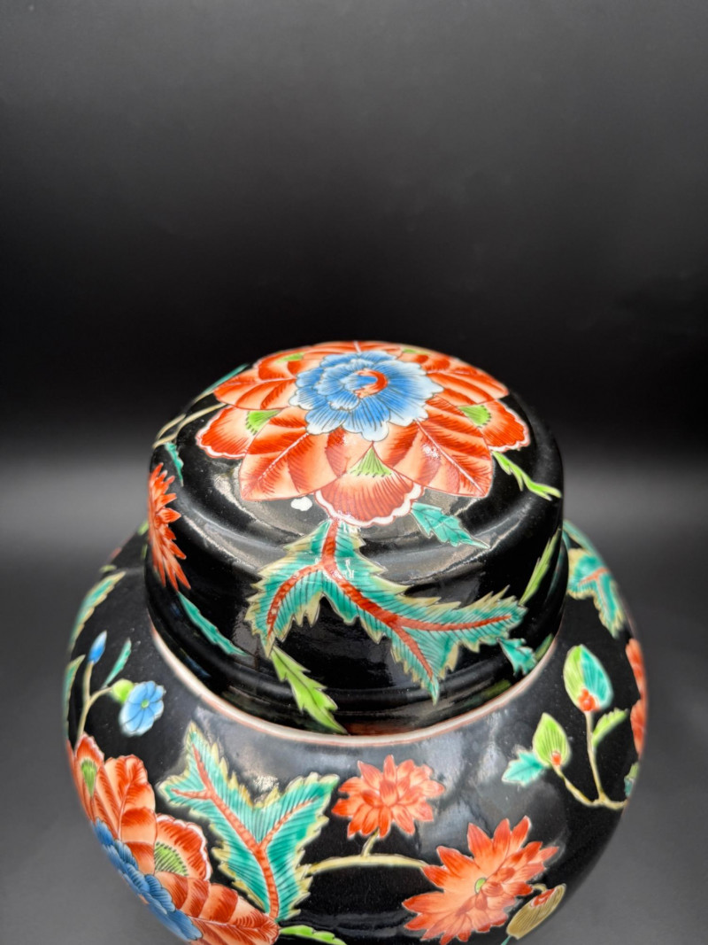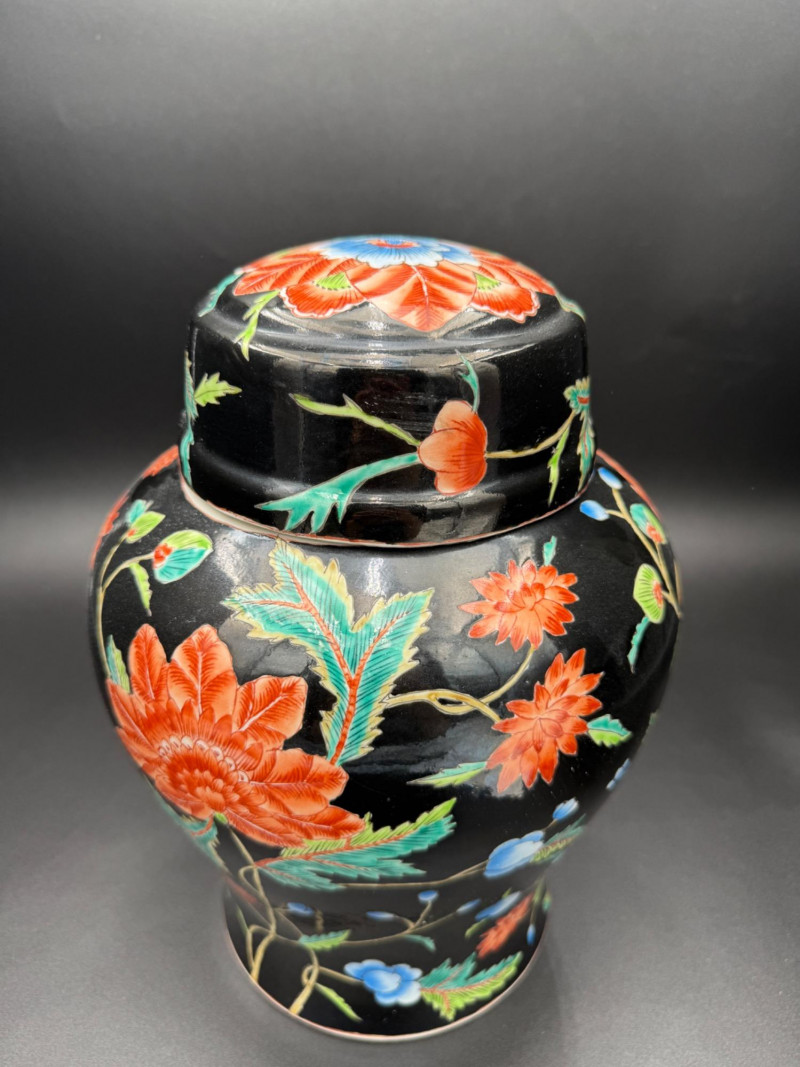 Vintage Famille Noire Style Ginger Jar with Lid Lidded ginger jar decorated with floral motifs on a dark ground. The surface features large blossoms, smaller buds, and branching stems extending across the body and lid. The decoration is in the Famille Noire style. The lid fits over a short neck. The base and interior are unglazed. Possibly porcelain or ceramic. Dimensions: