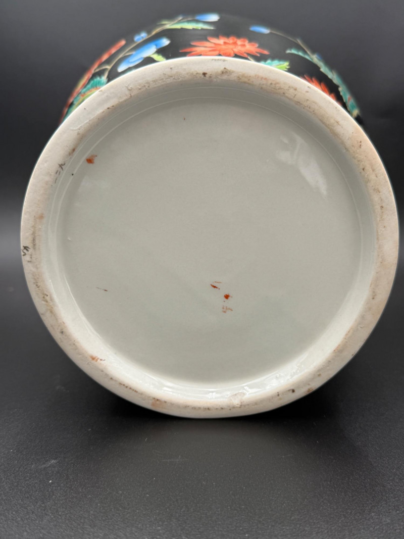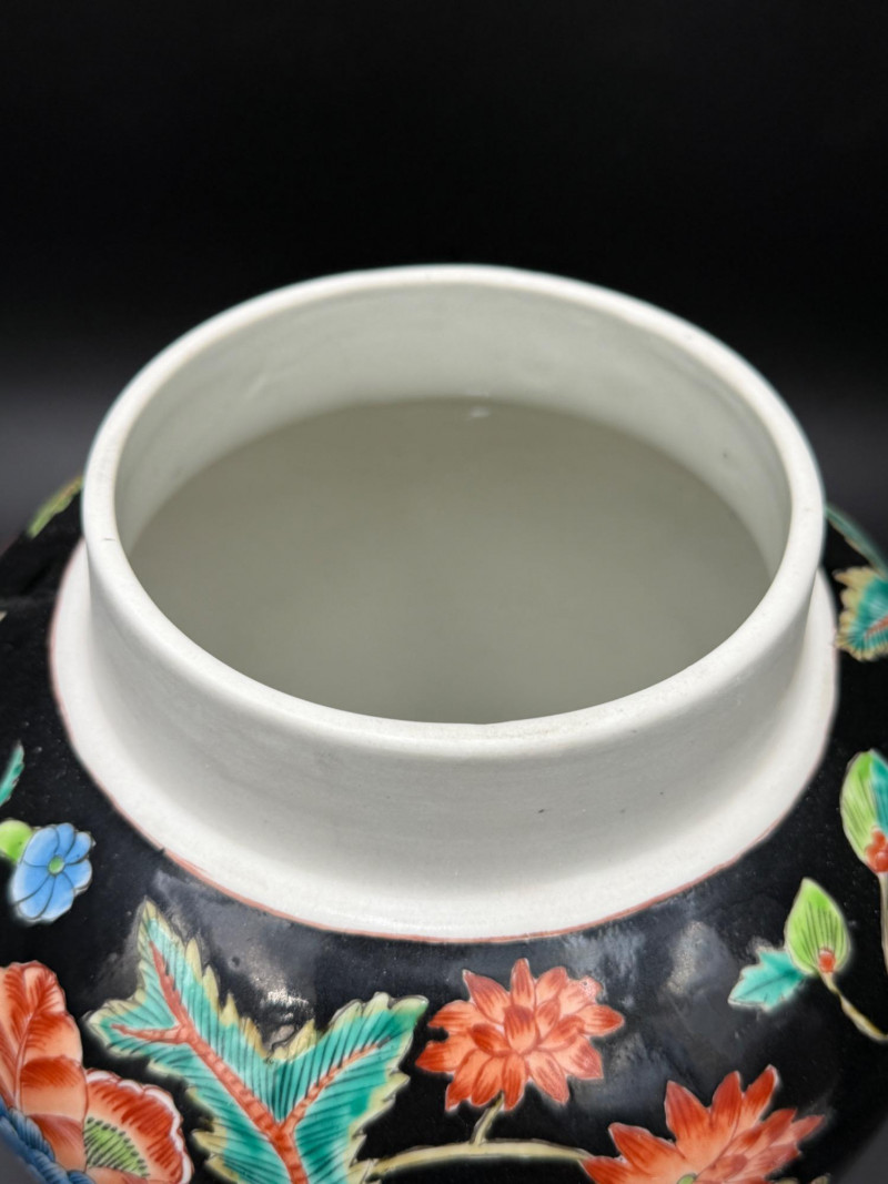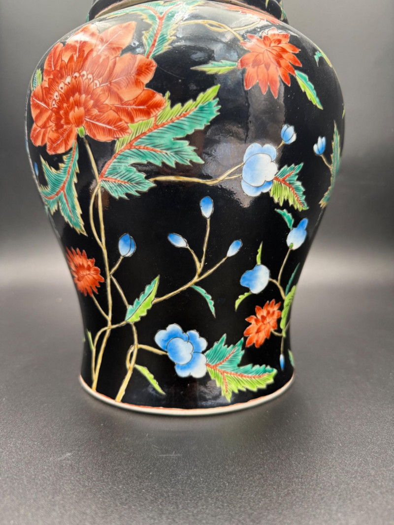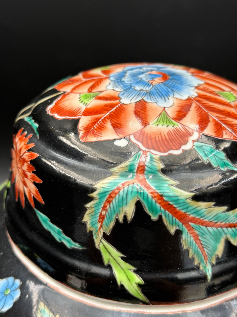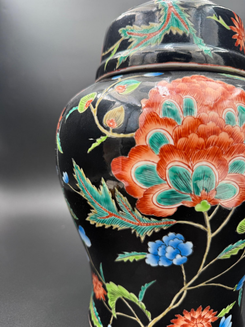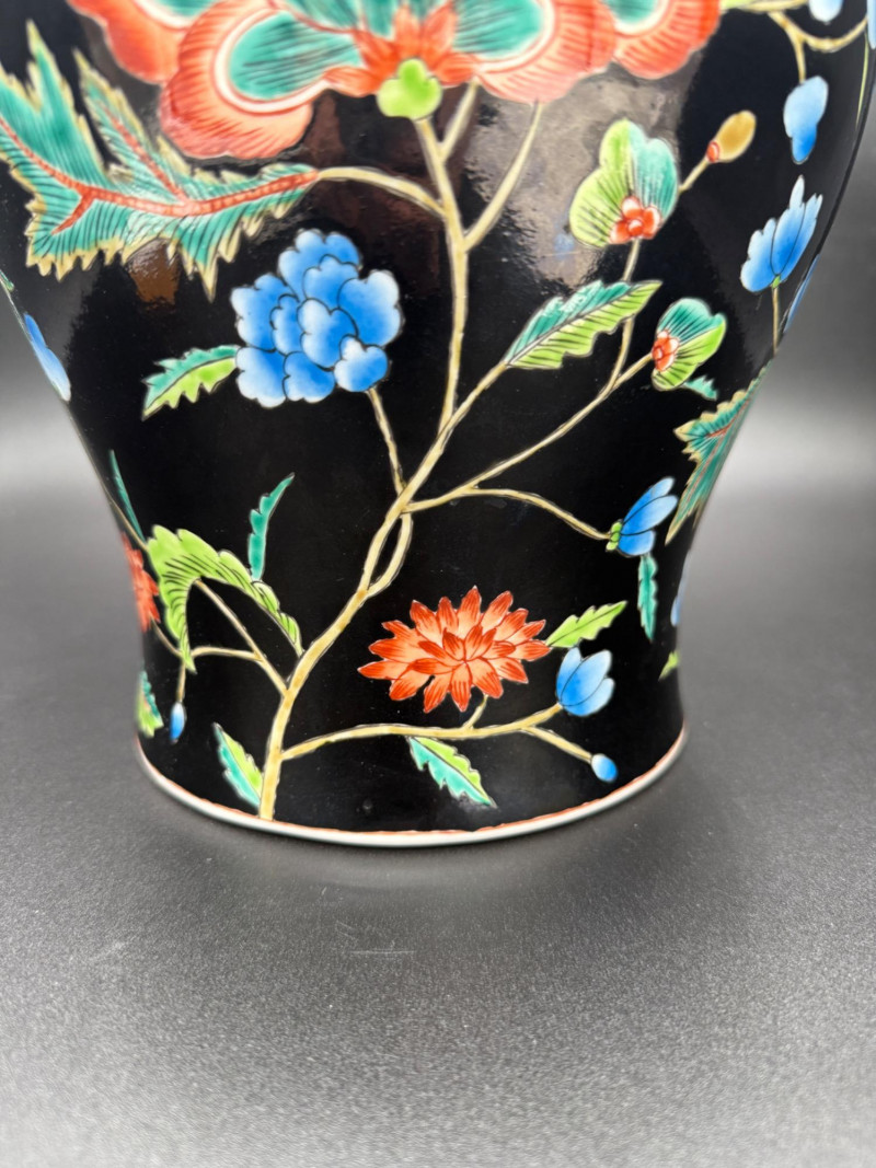 Vintage Famille Noire Style Ginger Jar with Lid Lidded ginger jar decorated with floral motifs on a dark ground. The surface features large blossoms, smaller buds, and branching stems extending across the body and lid. The decoration is in the Famille Noire style. The lid fits over a short neck. The base and interior are unglazed. Possibly porcelain or ceramic. Dimensions: