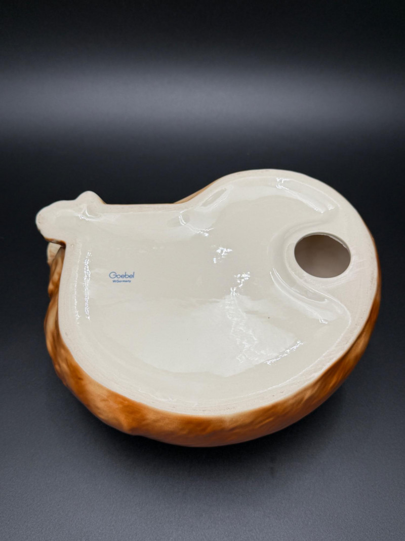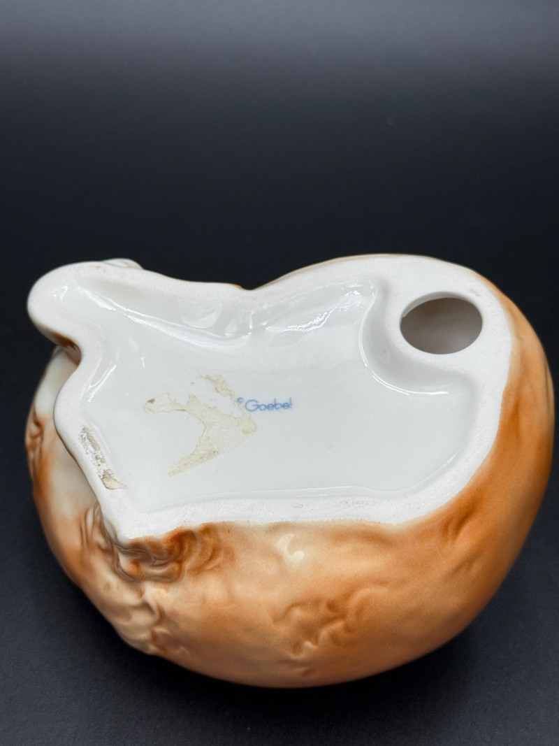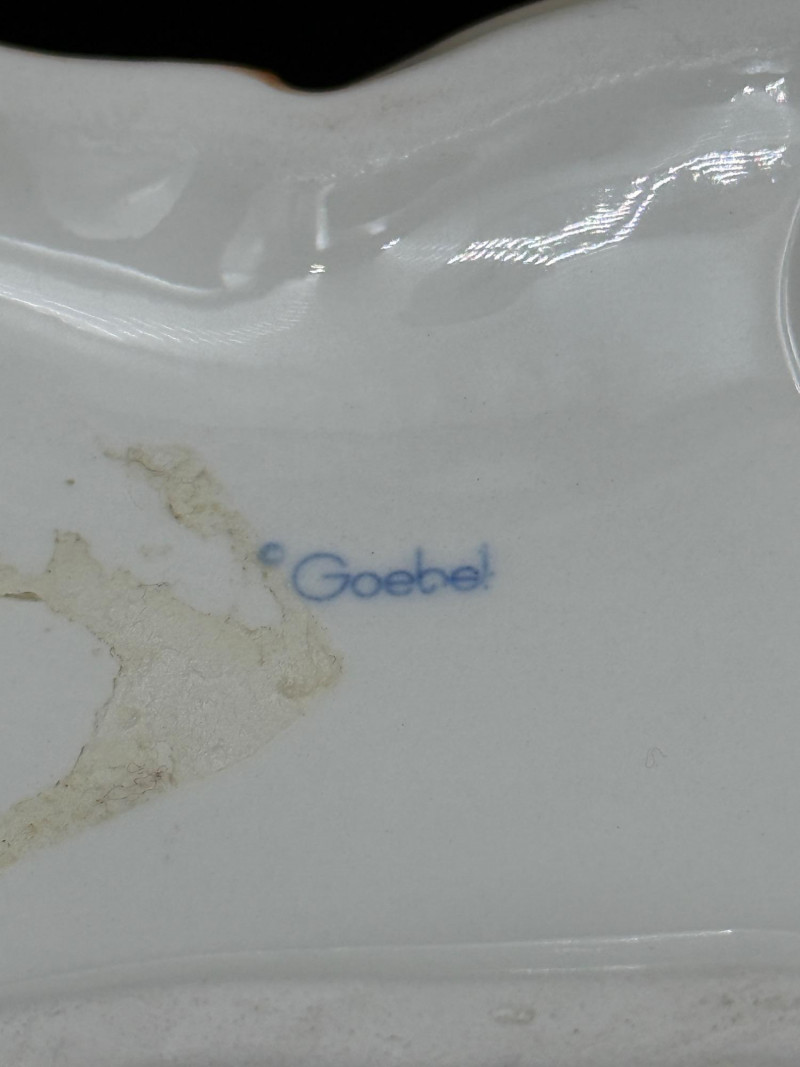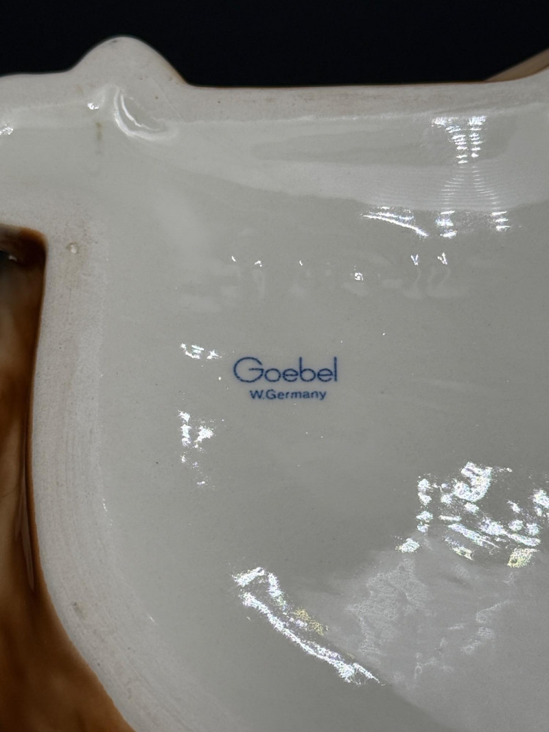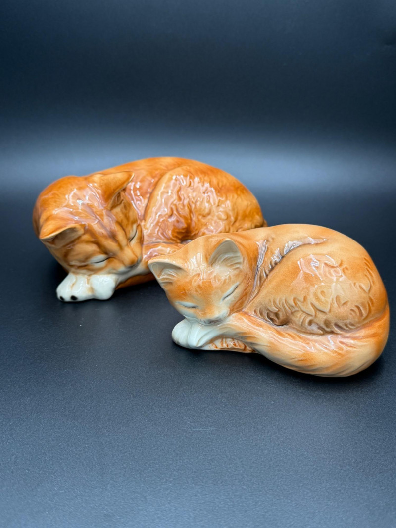 Pair of Goebel Sleeping Cat Figurines Two molded figures of sleeping cats, each curled with a paw tucked beneath the head. The surfaces show textured fur and tonal glaze variation. Undersides are marked Goebel, W. Germany. Dimensions: