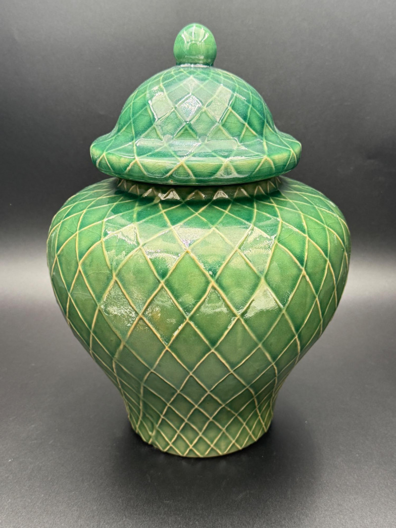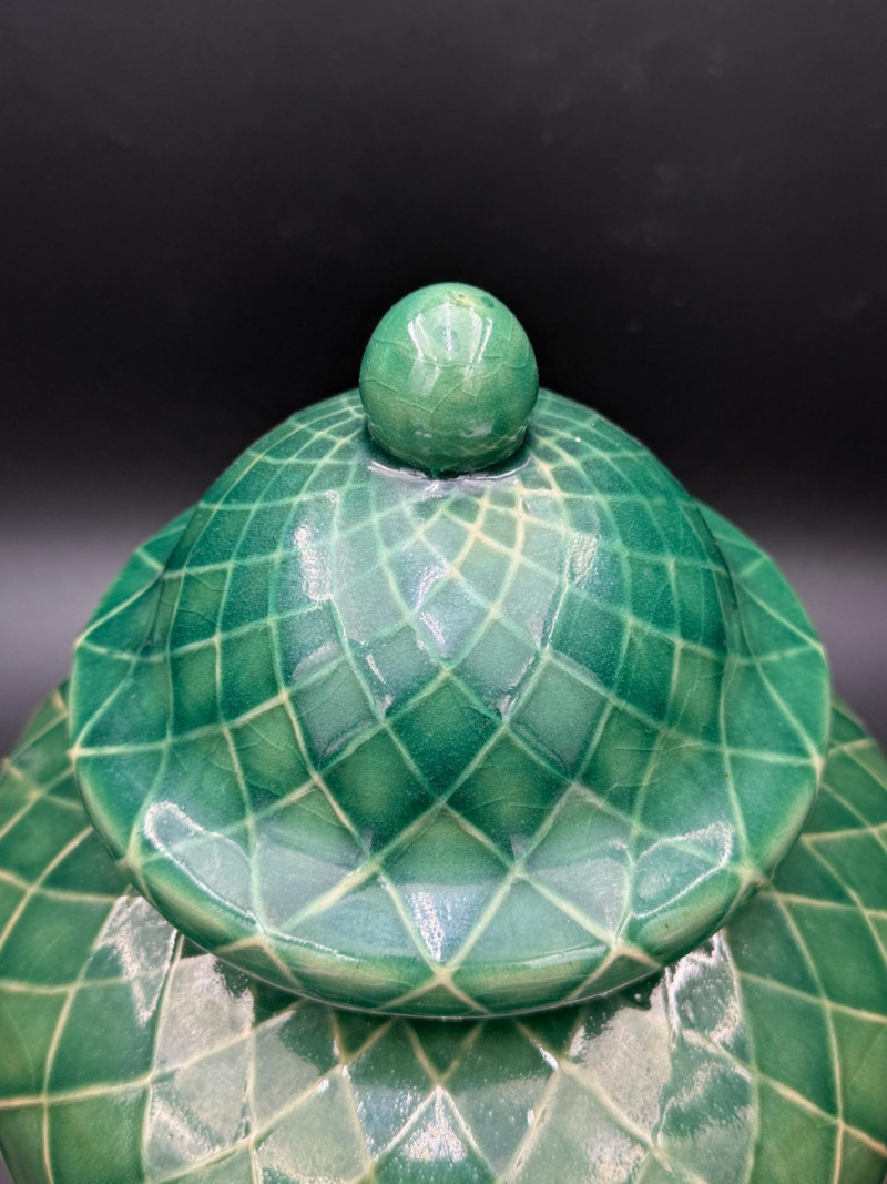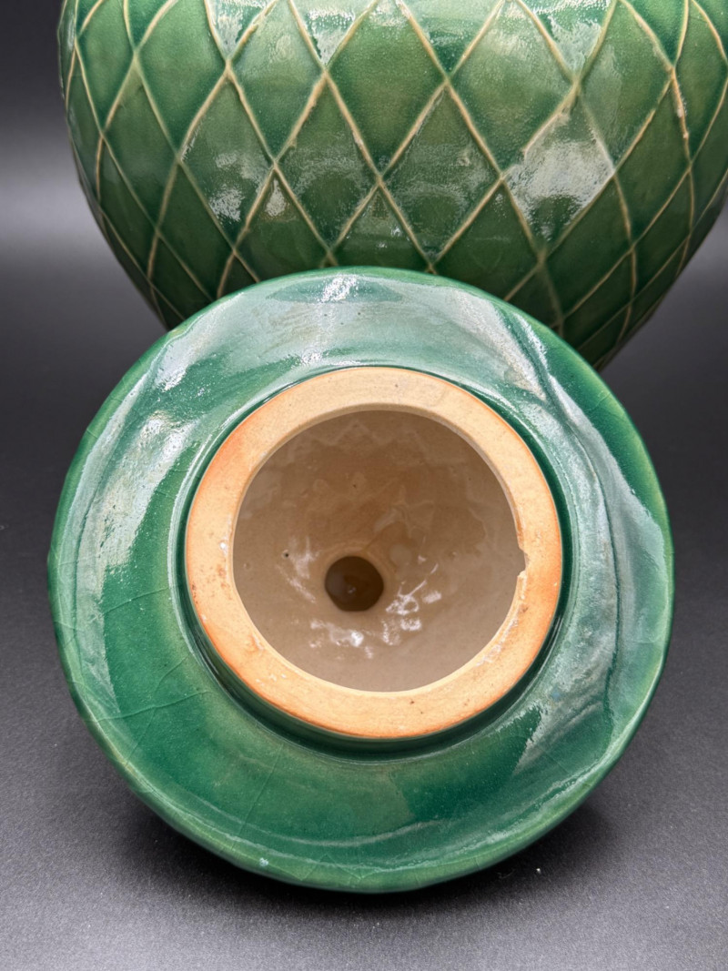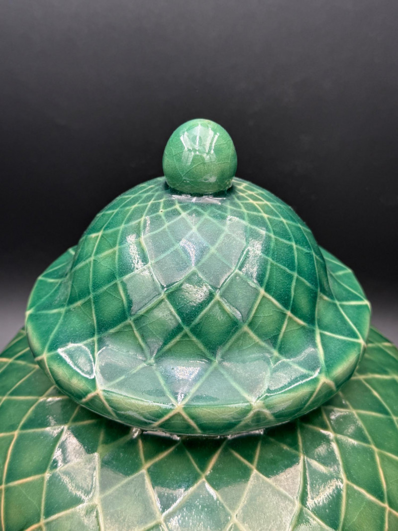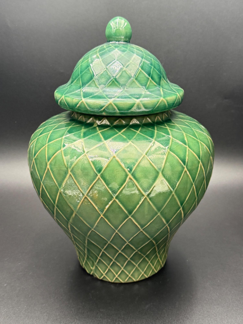 Green Glazed Ceramic Ginger Jar with Lid Lidded ceramic jar with a rounded body and domed cover topped by a knob finial. The surface is finished in green glaze with a continuous diamond lattice pattern that spans the entire form. The glaze collects along the incised lines, creating variation across the surface. The underside shows kiln support marks, and the interior base is unglazed. Dimensions: