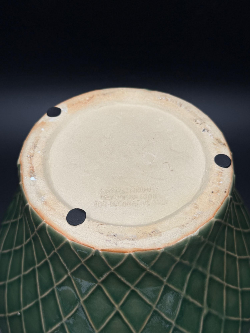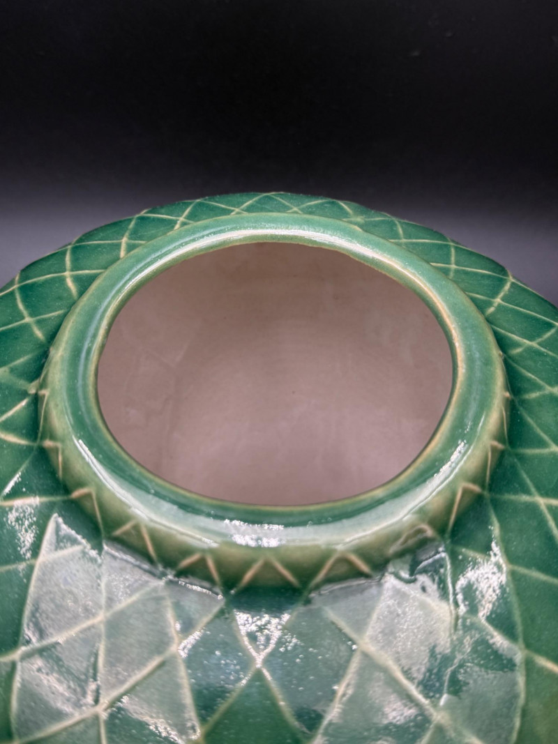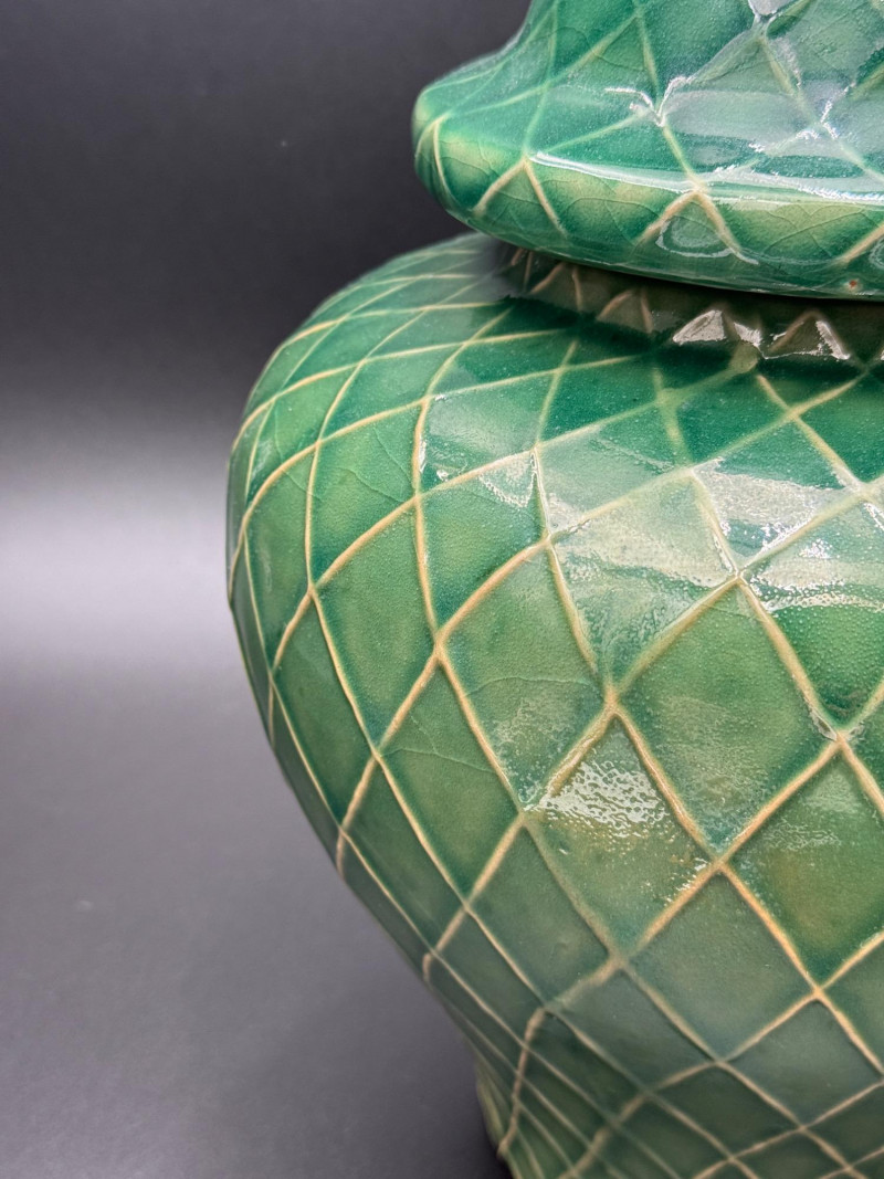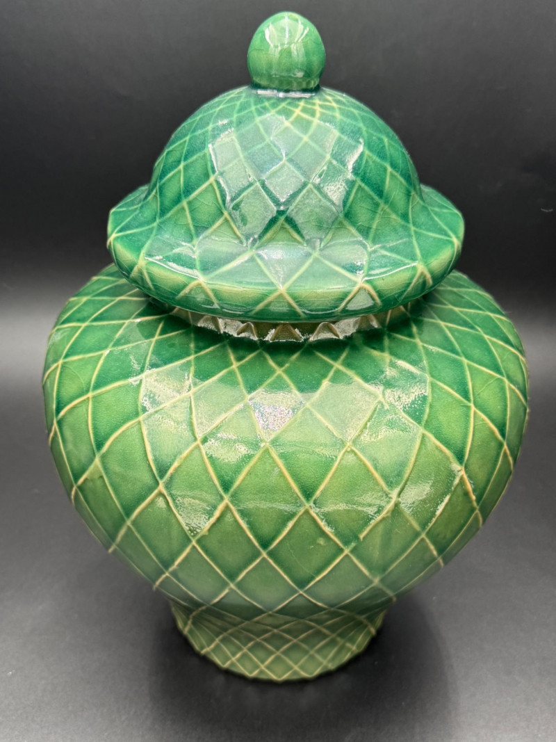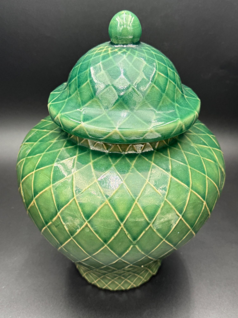 Green Glazed Ceramic Ginger Jar with Lid Lidded ceramic jar with a rounded body and domed cover topped by a knob finial. The surface is finished in green glaze with a continuous diamond lattice pattern that spans the entire form. The glaze collects along the incised lines, creating variation across the surface. The underside shows kiln support marks, and the interior base is unglazed. Dimensions: