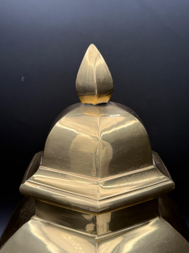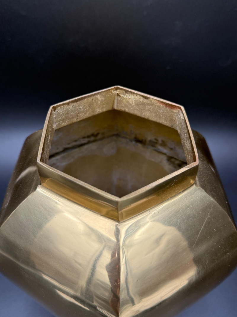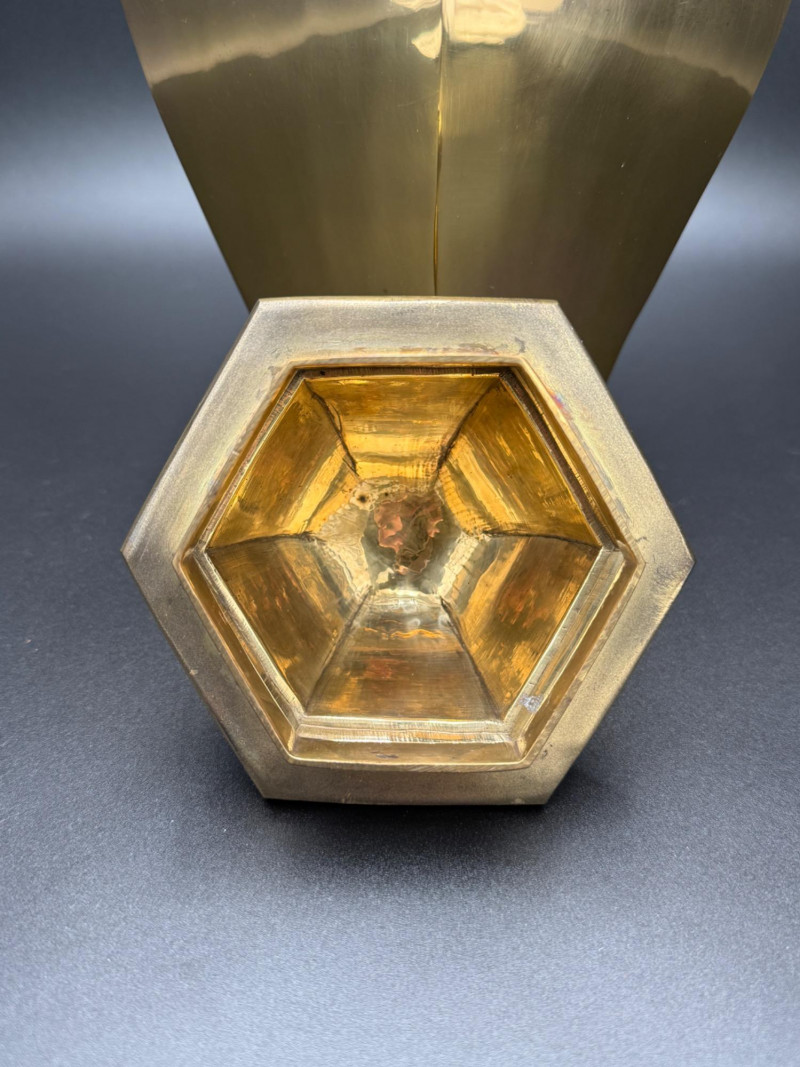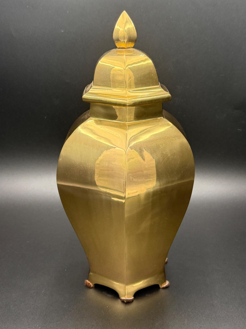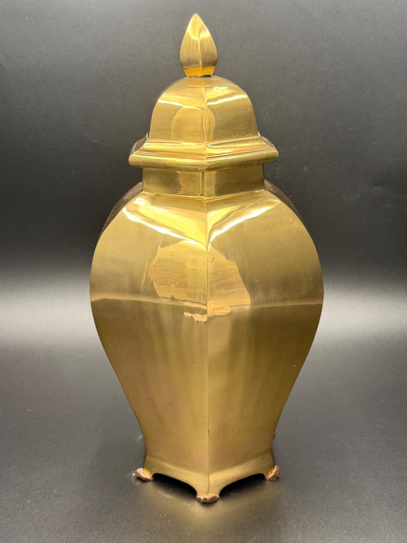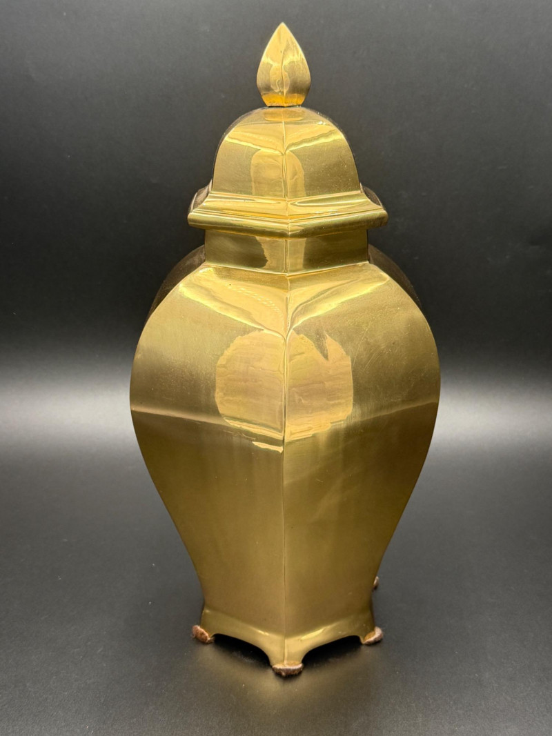 Vintage Ethan Allen Brass Lidded Jar Lidded jar with a hexagonal base and a stepped lid topped by a flame finial. The faceted body tapers toward a raised footed base. The interior and underside are finished in matching metal. The base bears an Ethan Allen Home Collection label. Dimensions:
