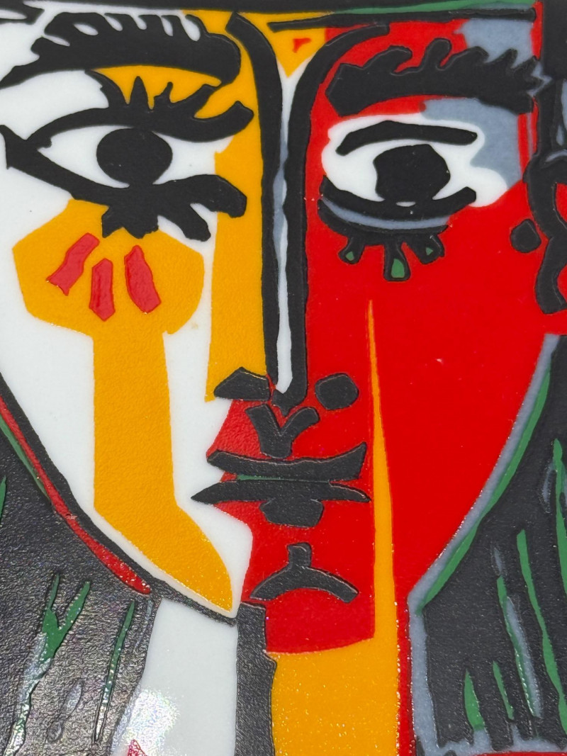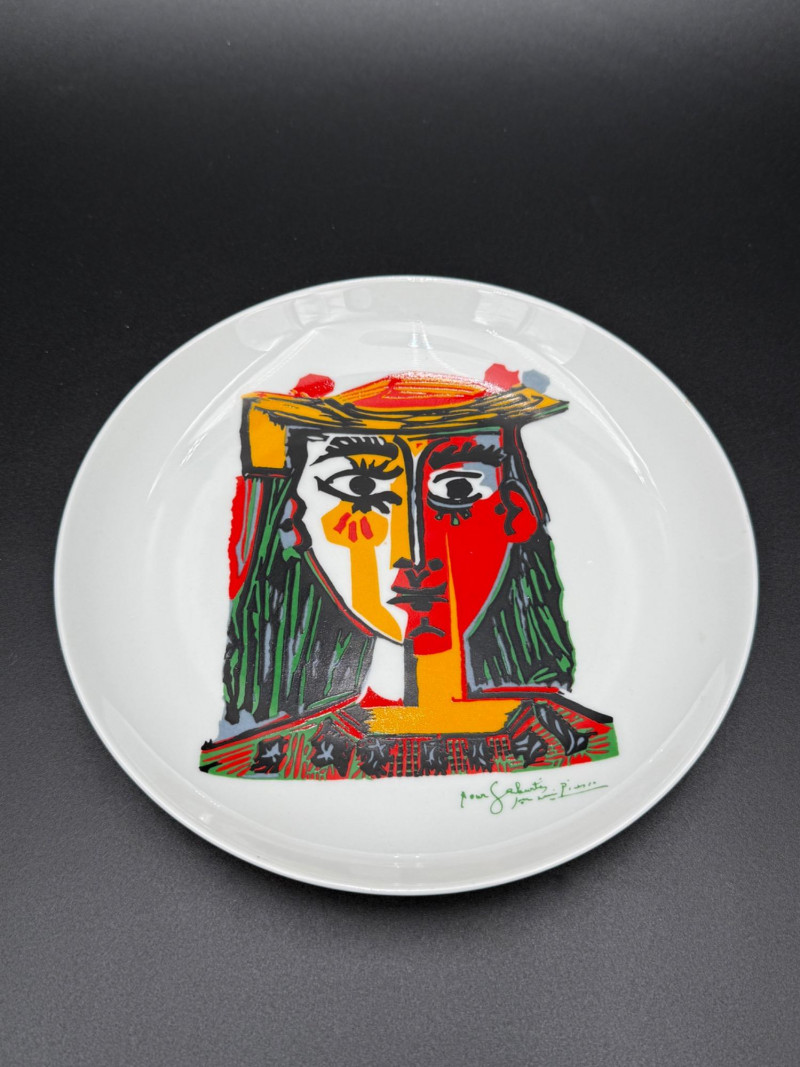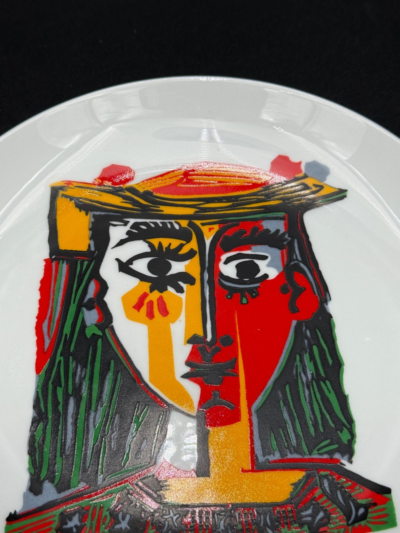 Pablo Picasso Reproduction Plate, 1998 Plate featuring a portrait of a woman with a hat, rendered in segmented color fields and linear forms. The front includes the inscription "pour Gabrielle son ami Picasso." The reverse is marked with “Obra original de Pablo Picasso © Succession Picasso 1998 Reproducción autorizada,” indicating an authorized reproduction produced in Barcelona, Spain. Made by XL. Dimensions: