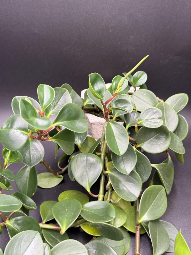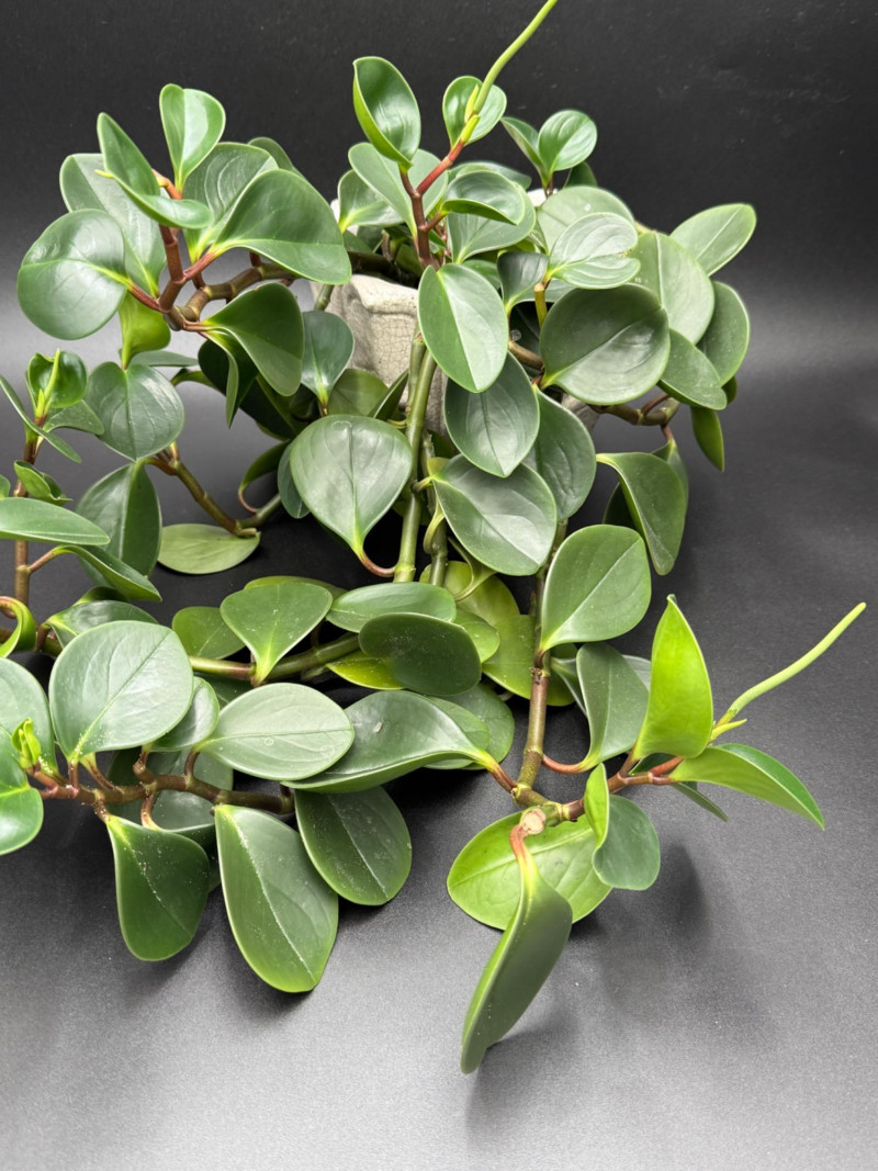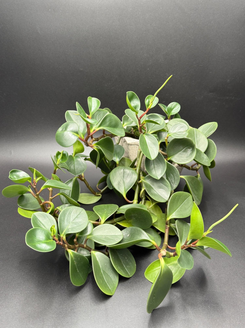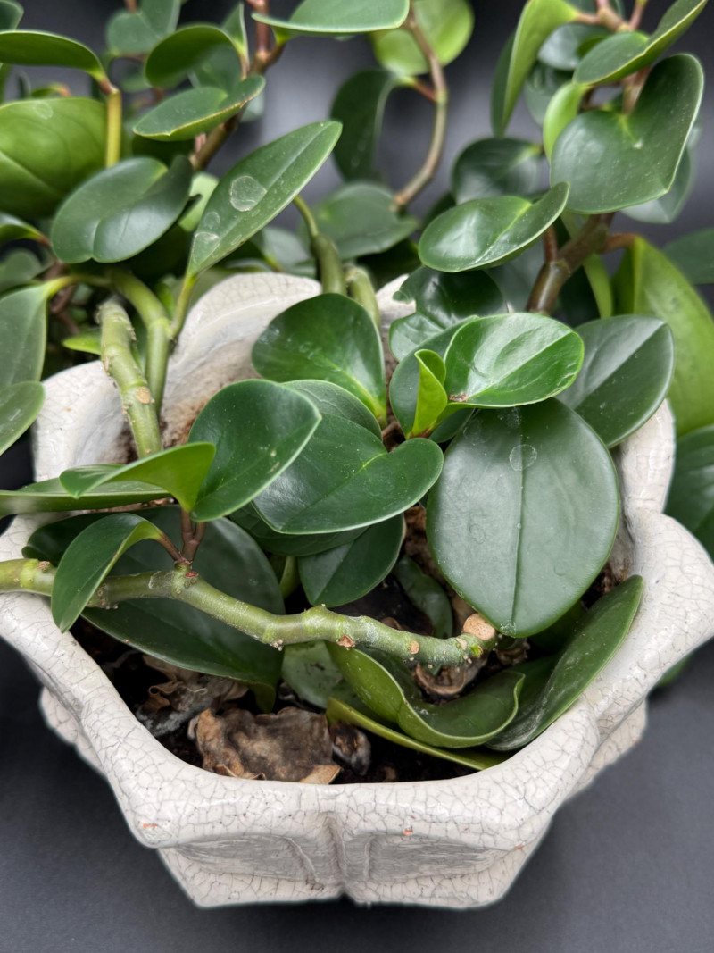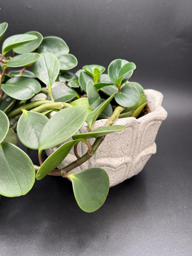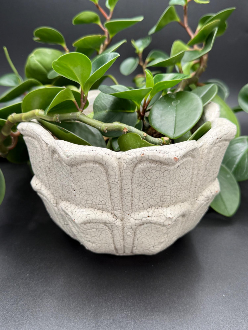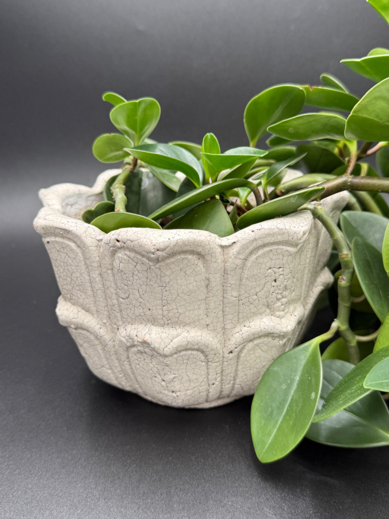 Trailing Plant in Decorative Planter Potted trailing plant with rounded, waxy green leaves growing on thick stems. The plant is housed in a decorative planter with a fluted, petal-like relief design. The plant displays cascading growth, with multiple vines extending over the edges of the pot. The surface of the soil shows visible stems and rooting points near the base. Dimensions (pot): 7" W x 5" H