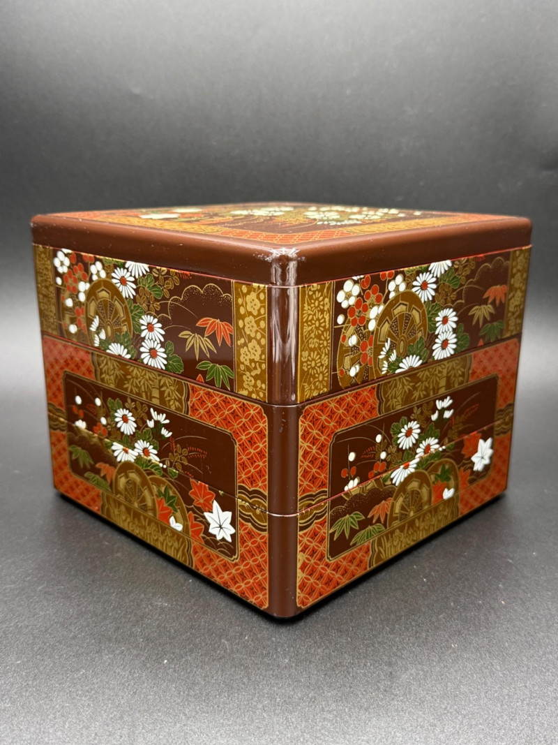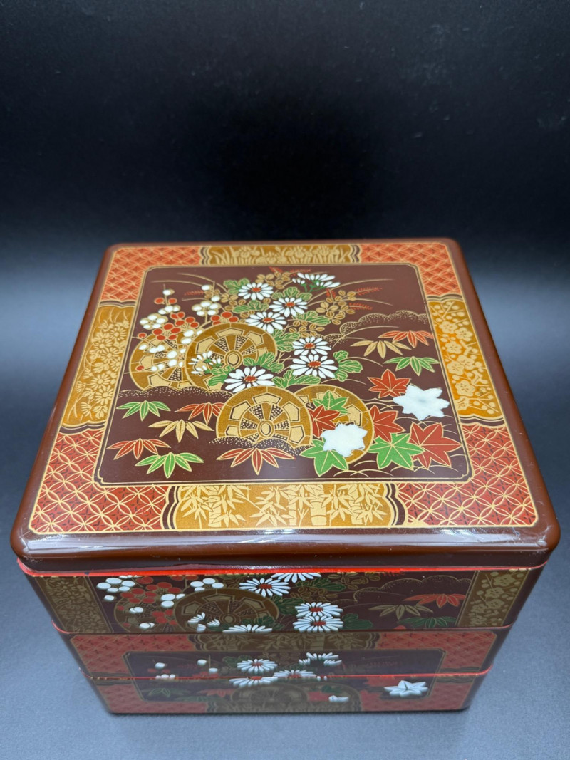 Lacquered Japanese Bento Box with Chinese Inset Box Set of two boxes with painted and inset details. The larger piece is a three-tier bento box with a fitted lid and stackable compartments. The exterior features cart wheel, floral, and patterned panel motifs across all sides and lid. The design is consistent with lacquerware associated with Japanese makers such as Otagiri. The smaller box has a red lacquered surface with painted black forms along the sides and an inset panel on the lid. The panel displays floral imagery in multiple colors. The box opens into two nesting halves. The style is similar to Chinese lacquer boxes with inlaid decoration. Dimensions: