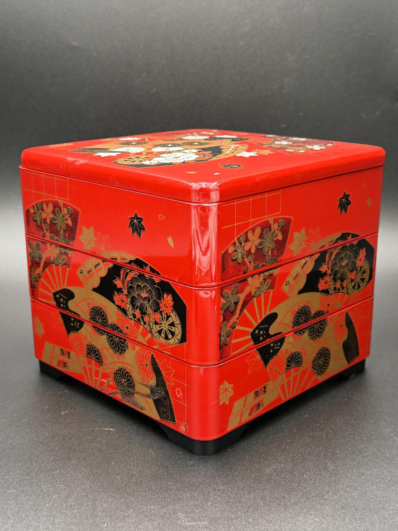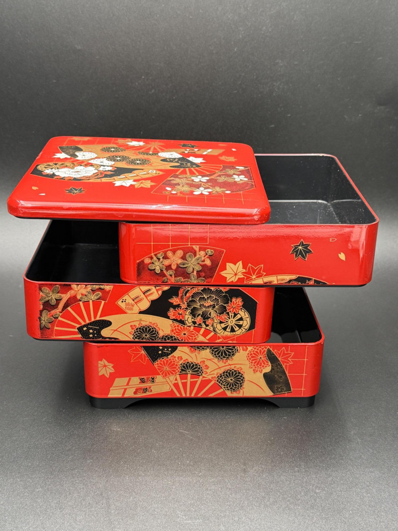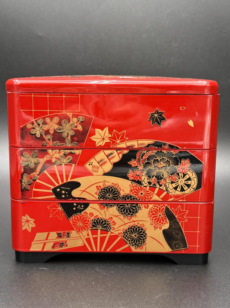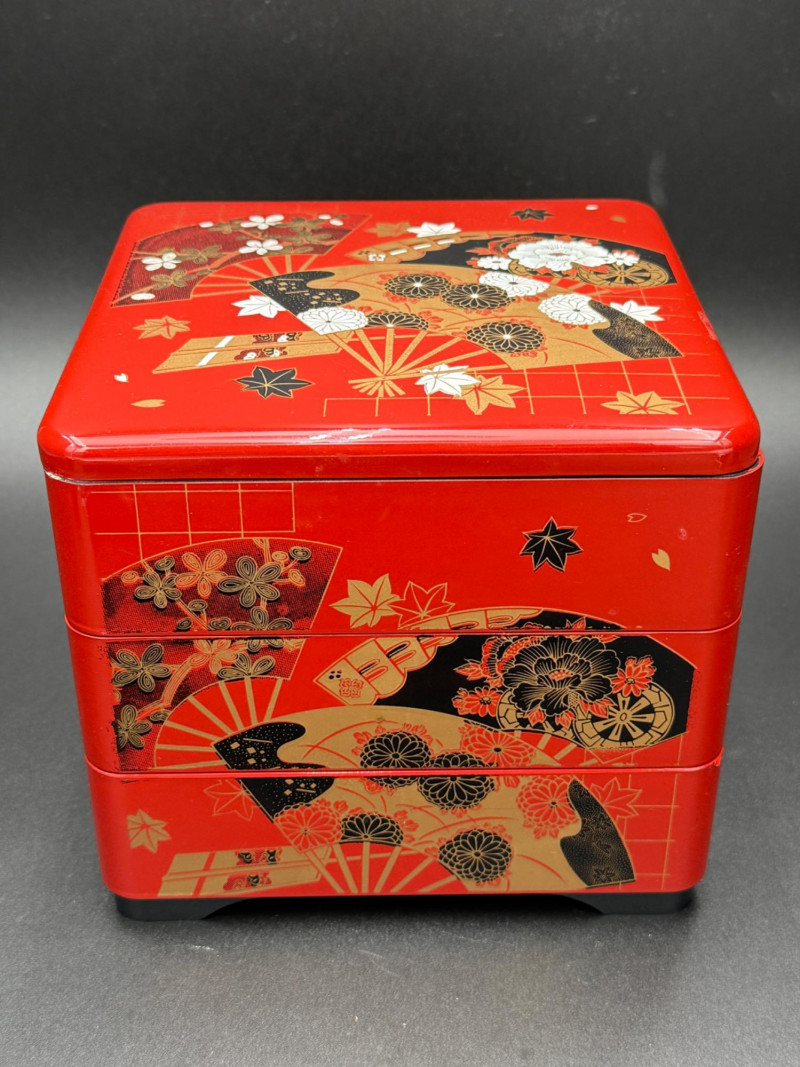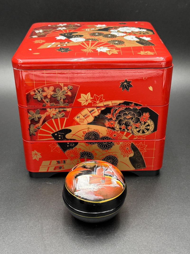 Japanese Lacquered Jyubako Bento Box with Small Trinket Box Three-tier Japanese lacquered jyubako bento box decorated with traditional fan and floral designs in red, black, and gold tones. Each tier stacks securely for food presentation or storage. Marked "Made in Japan" on the base. Accompanied by a small round lacquered trinket box with a painted landscape scene showing two figures near a waterfall surrounded by trees and structures. Dimensions: