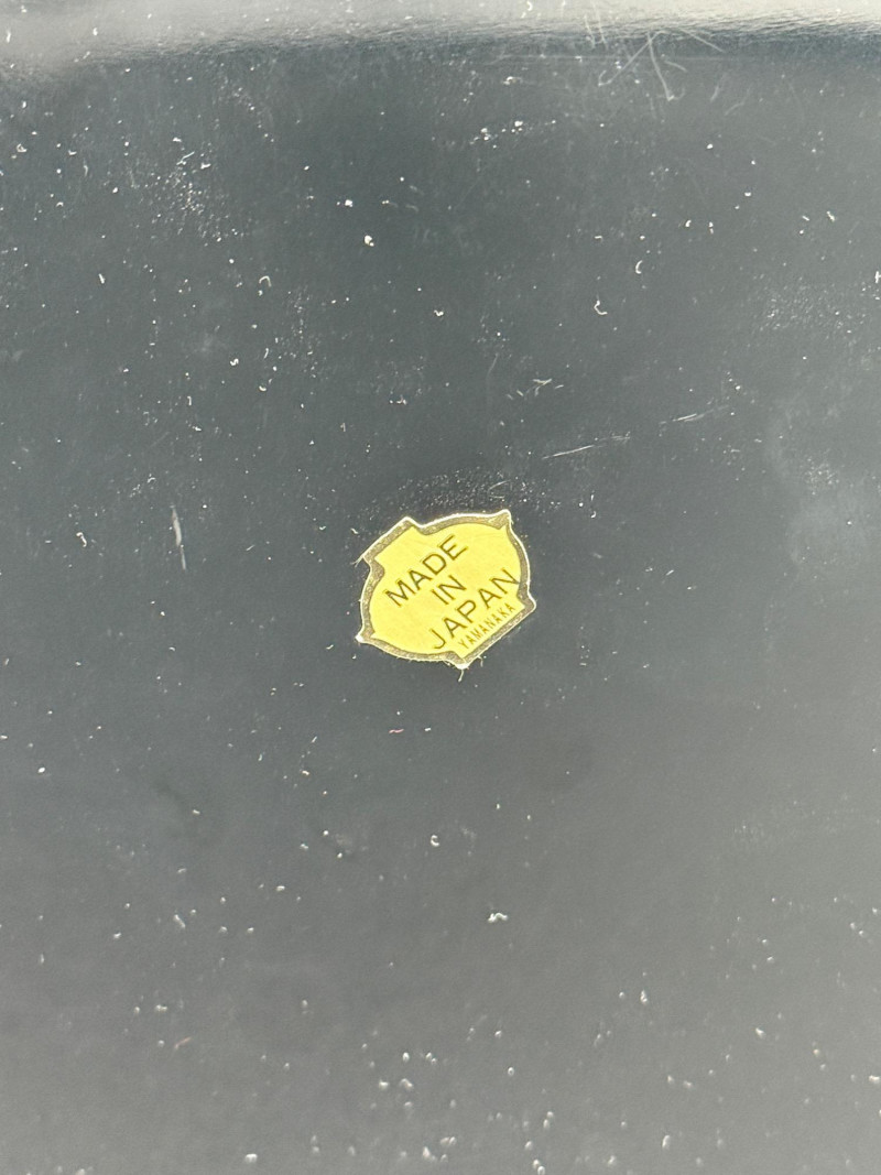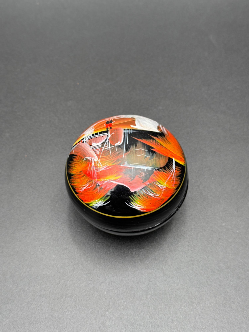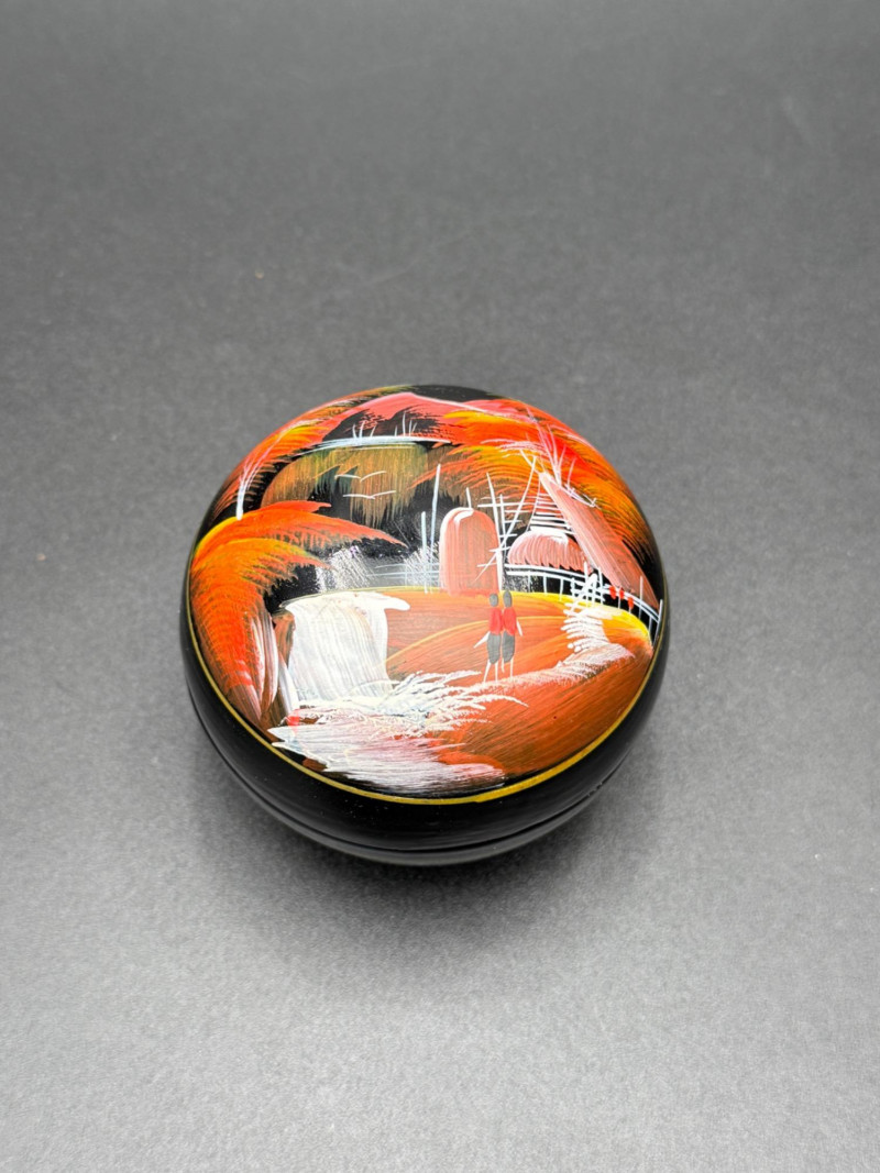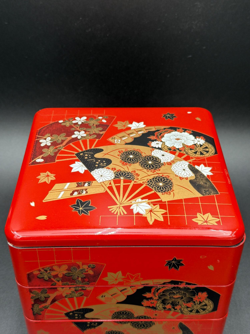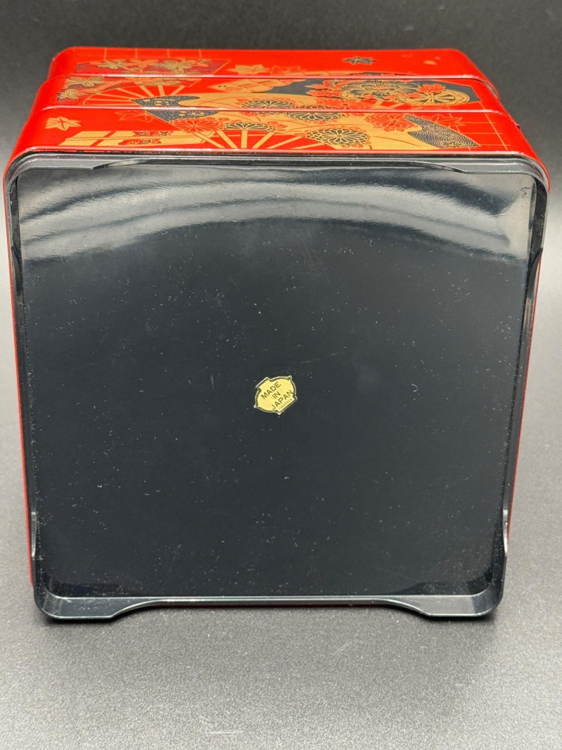 Japanese Lacquered Jyubako Bento Box with Small Trinket Box Three-tier Japanese lacquered jyubako bento box decorated with traditional fan and floral designs in red, black, and gold tones. Each tier stacks securely for food presentation or storage. Marked "Made in Japan" on the base. Accompanied by a small round lacquered trinket box with a painted landscape scene showing two figures near a waterfall surrounded by trees and structures. Dimensions: