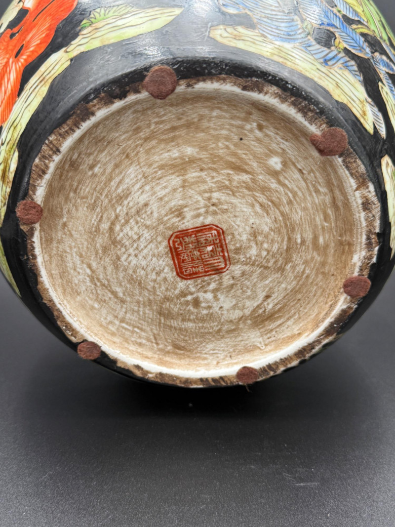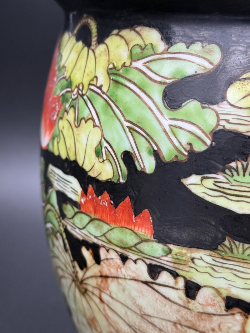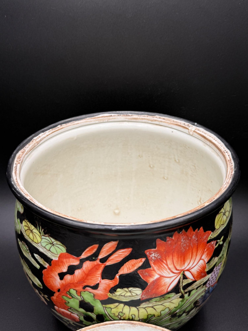 Chinese Lidded Jar with Koi Fish and Lotus Pond Design Chinese covered jar decorated with koi fish swimming among lotus leaves, rendered in black, green, red, and cream tones. The continuous surface design wraps around the body and extends onto the domed lid, which is topped with a rounded knob. The interior is glazed in white, and the base features a red seal mark. The material is either ceramic or porcelain. Dimensions: