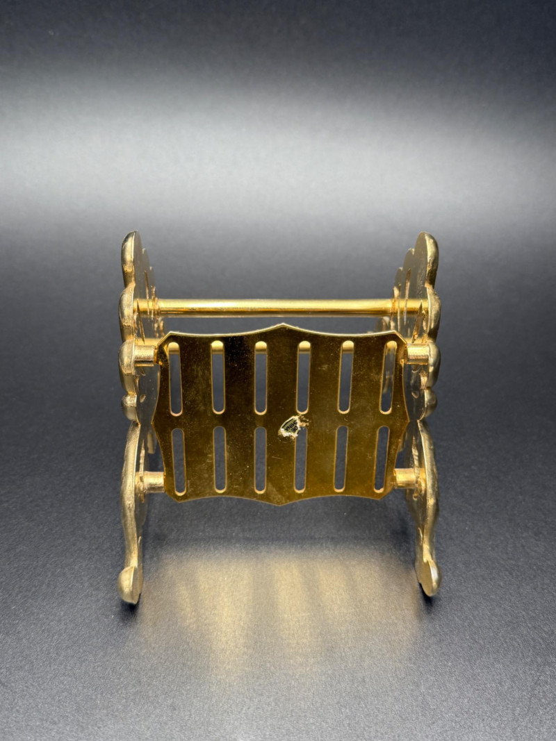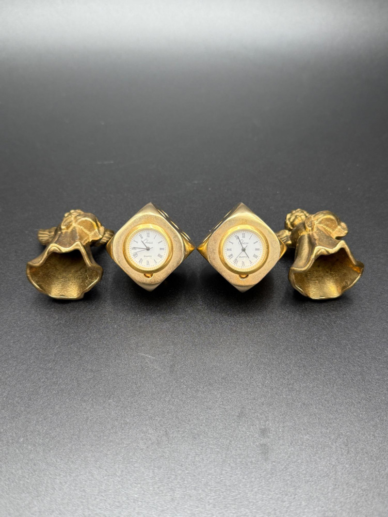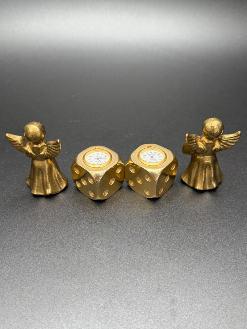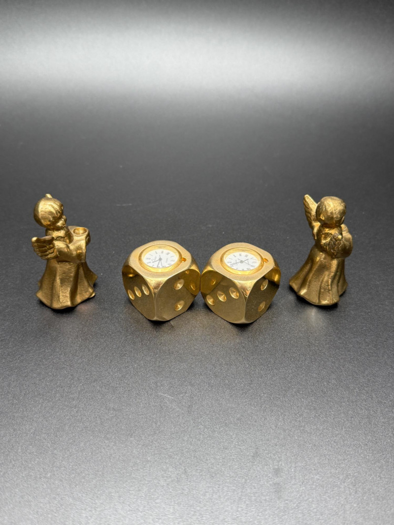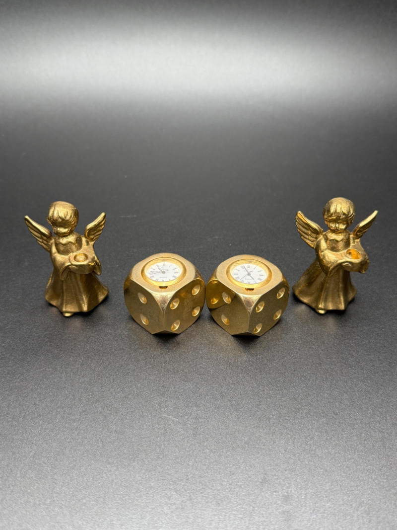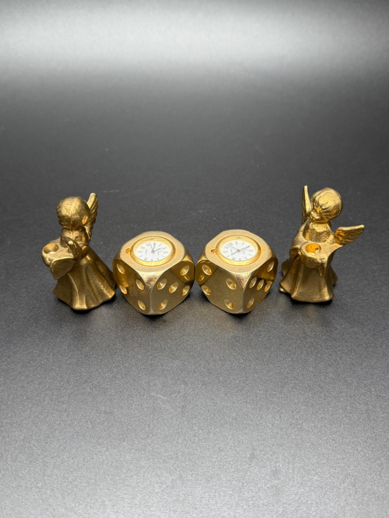 Assortment of Gold-Tone Brass Tabletop Pieces Group of small gold-tone metal tabletop pieces. Includes a napkin holder and knife rest rack with shell and scroll motifs in the Hollywood Regency style, a pair of angel candlestick holders, and two dice-shaped quartz clocks marked “Chess.” Includes: Hollywood Regency style napkin holder Hollywood Regency style knife rest rack Pair of angel candlestick holders Two dice-shaped quartz clocks marked “Chess” Size Range: