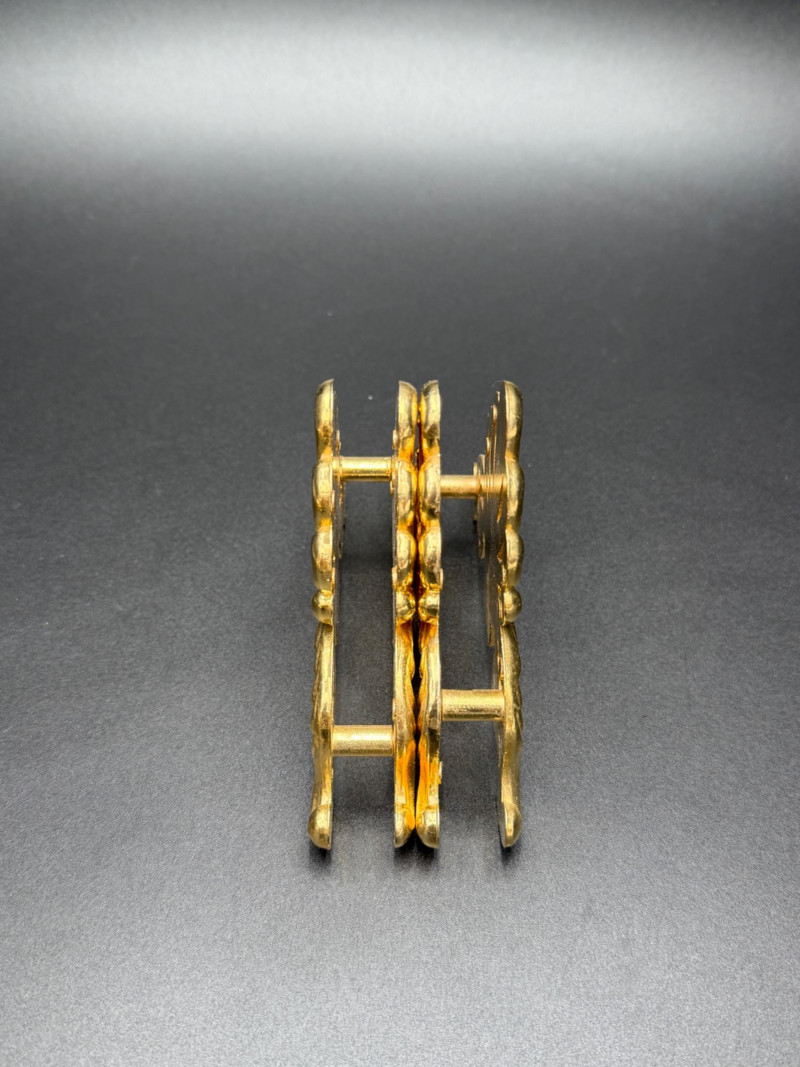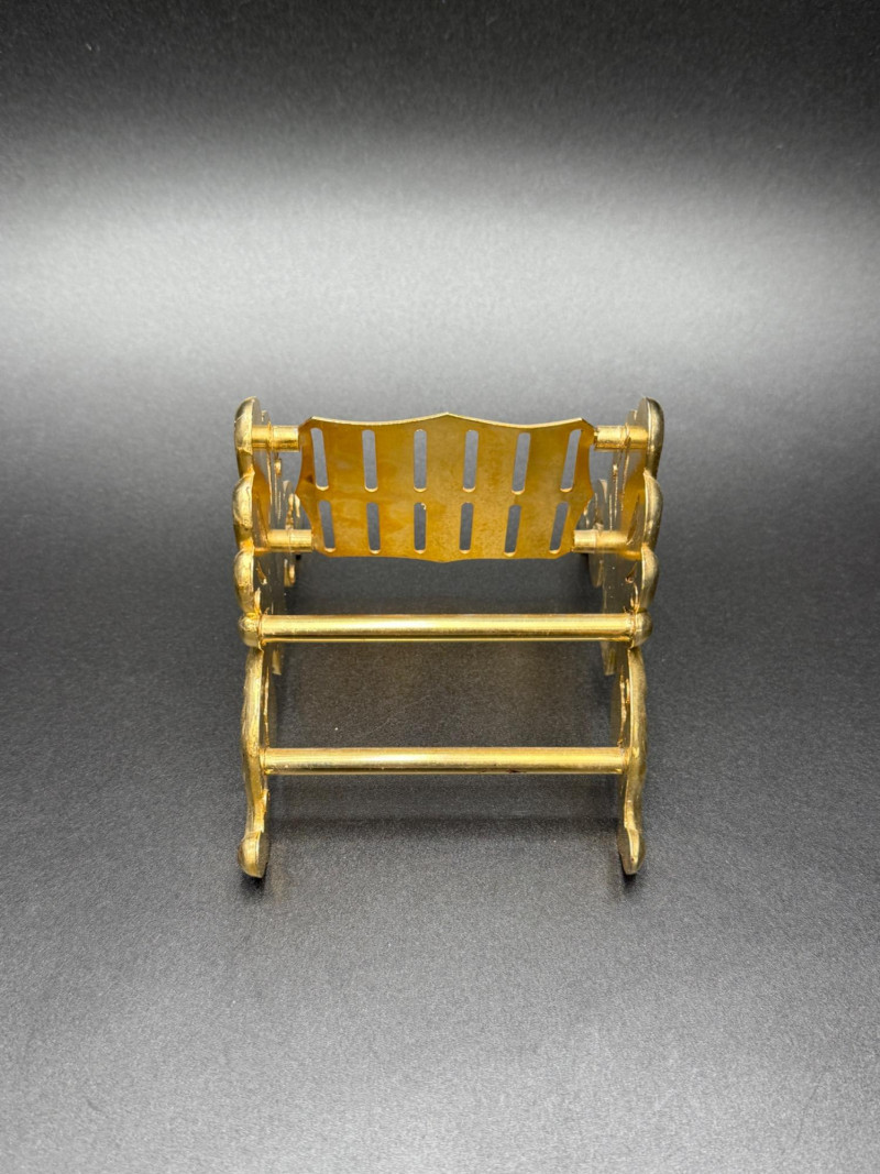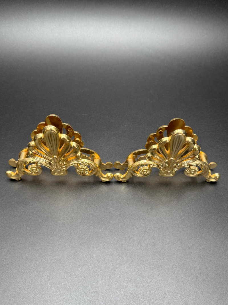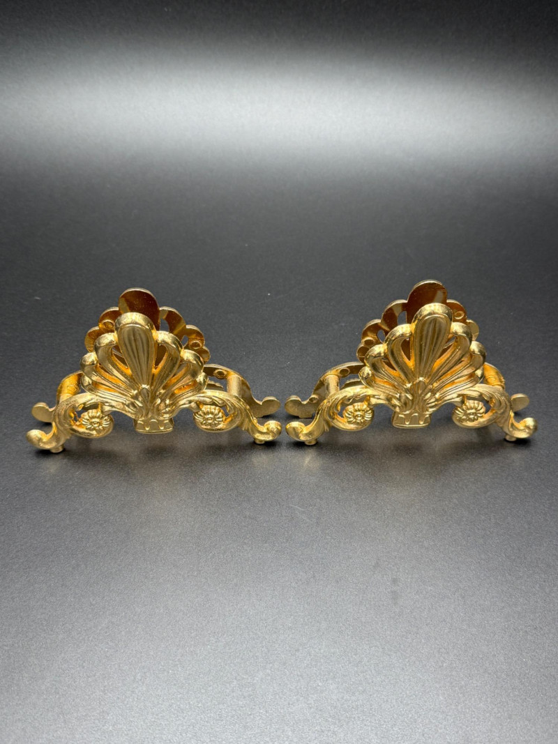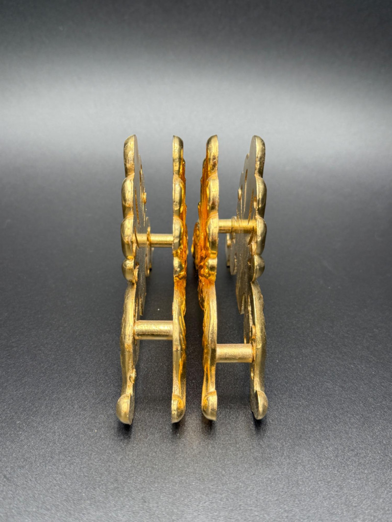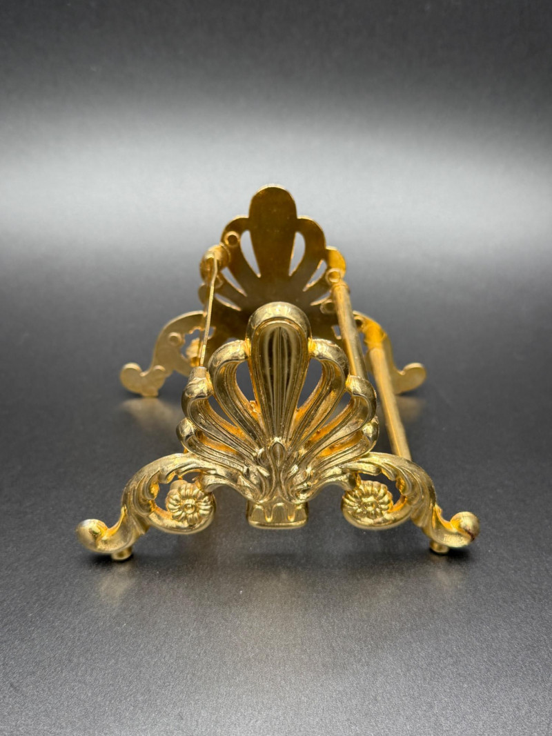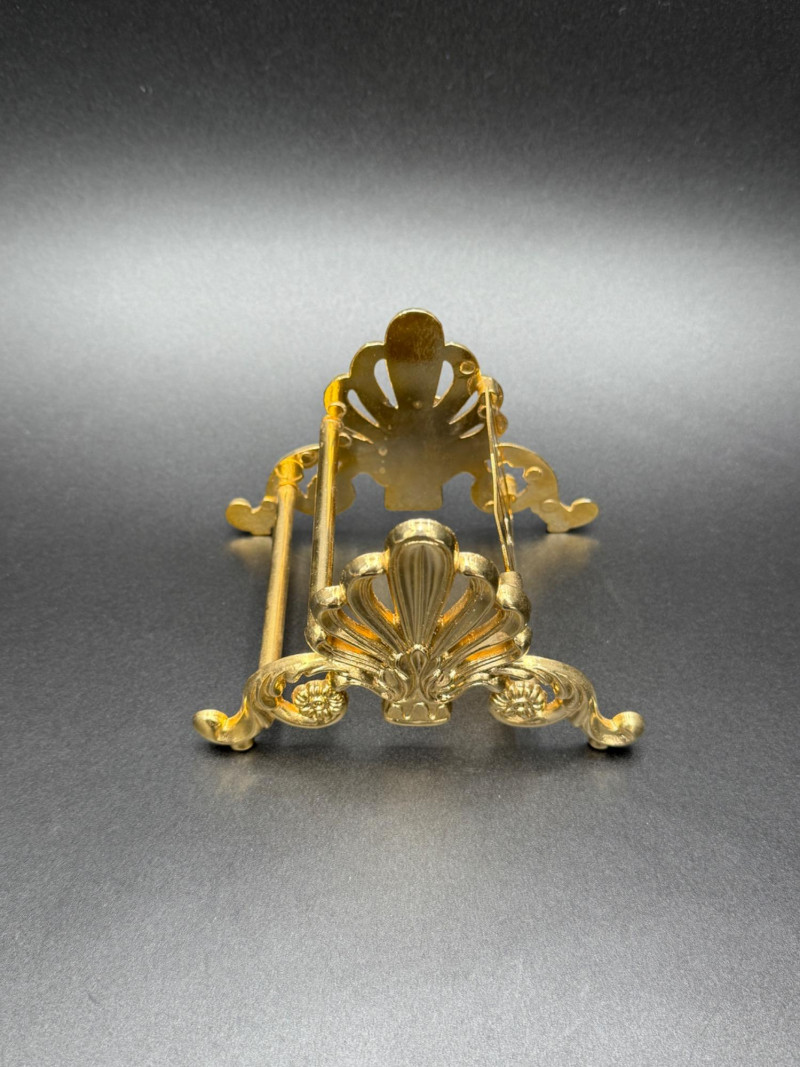 Assortment of Gold-Tone Brass Tabletop Pieces Group of small gold-tone metal tabletop pieces. Includes a napkin holder and knife rest rack with shell and scroll motifs in the Hollywood Regency style, a pair of angel candlestick holders, and two dice-shaped quartz clocks marked “Chess.” Includes: Hollywood Regency style napkin holder Hollywood Regency style knife rest rack Pair of angel candlestick holders Two dice-shaped quartz clocks marked “Chess” Size Range: