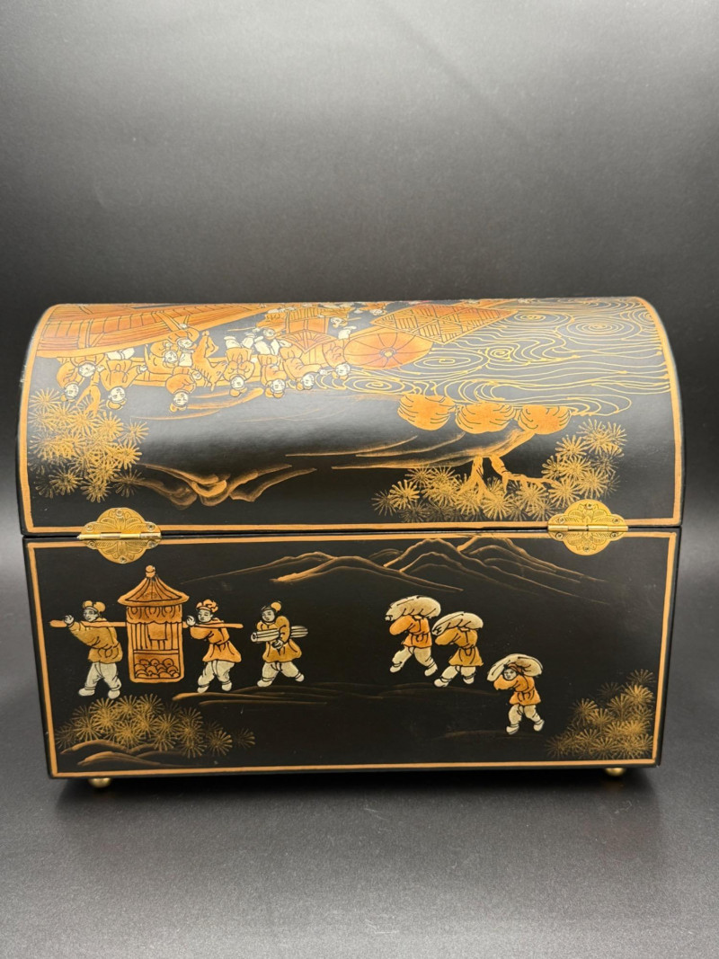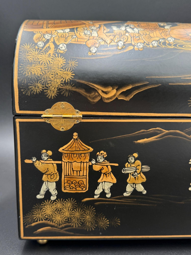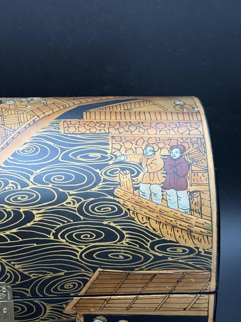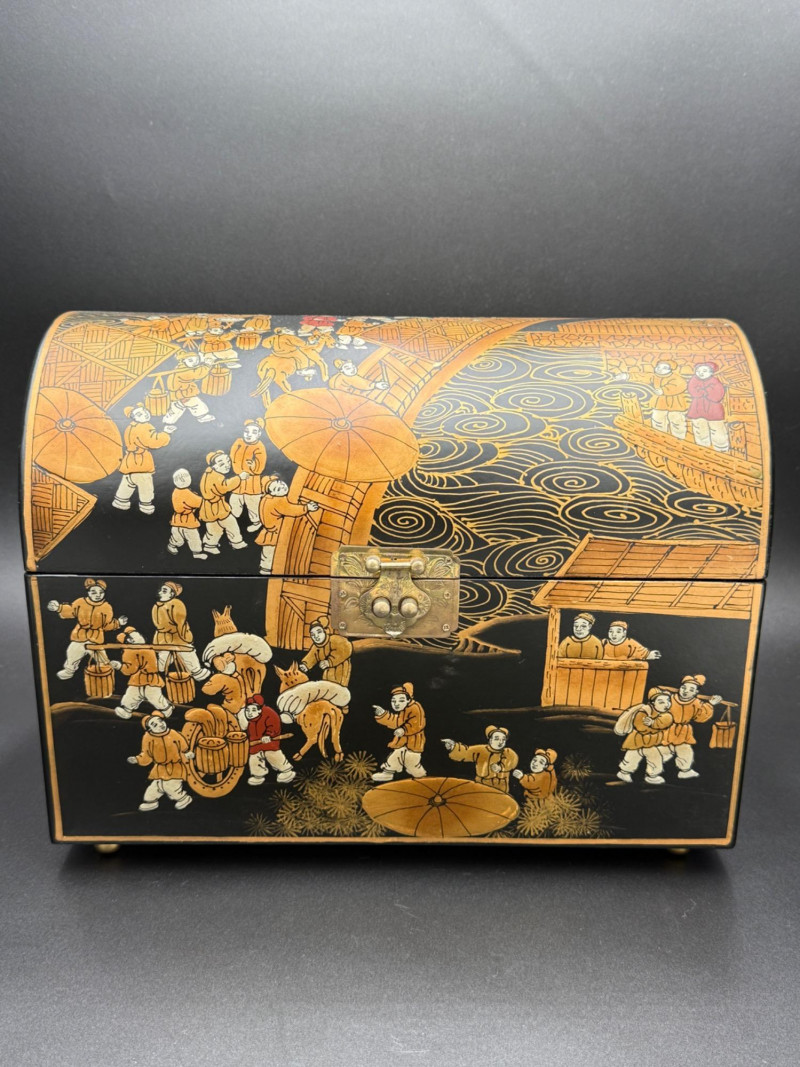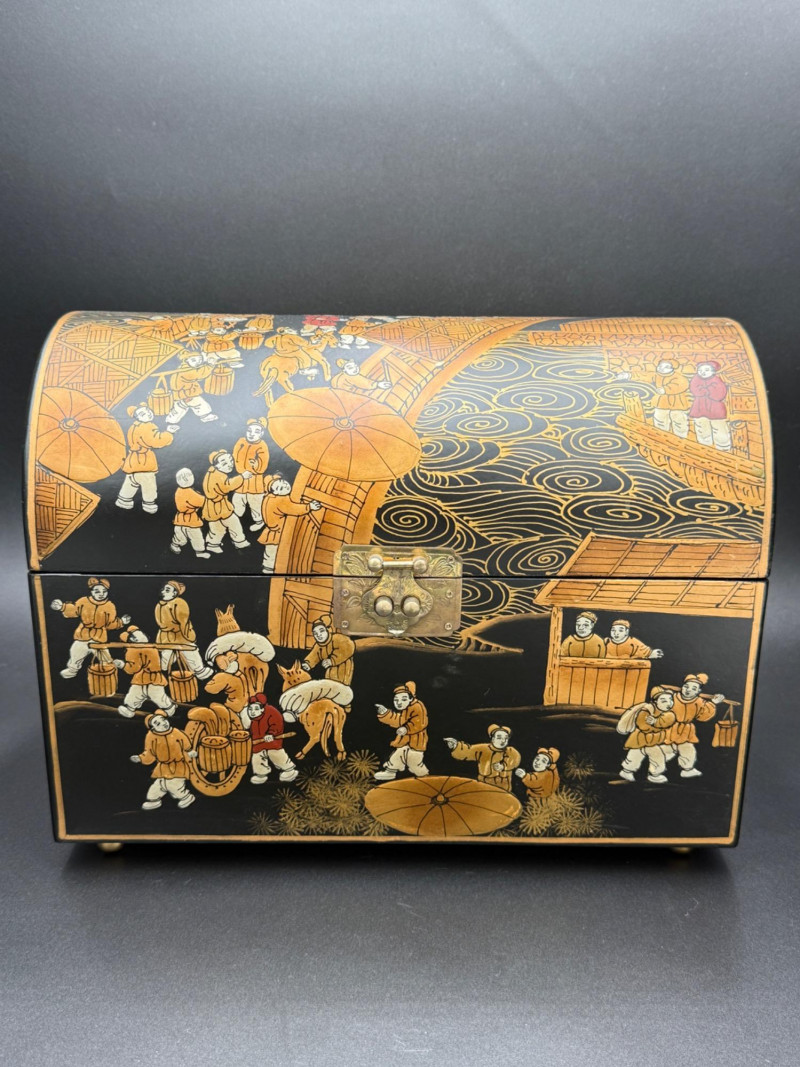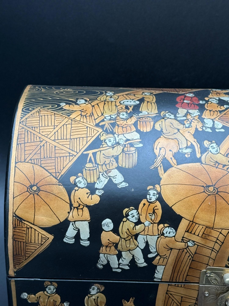 Hand-Painted Chinese Lacquered Wood Box Wooden storage box with a domed lid and metal clasp. The exterior features a continuous hand-painted scene of figures, animals, and structures in a village setting, rendered across the front and top panels. Additional motifs appear on the sides and back. The interior is lined with a dark textile material. Dimensions: