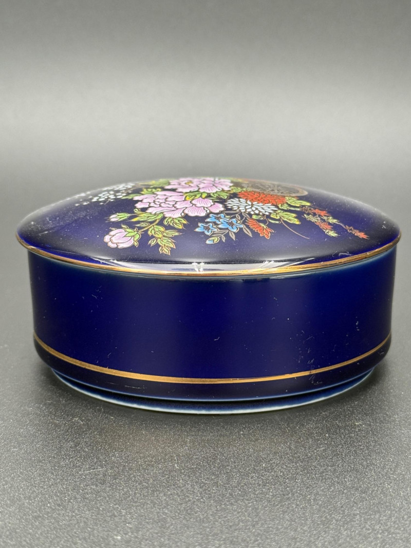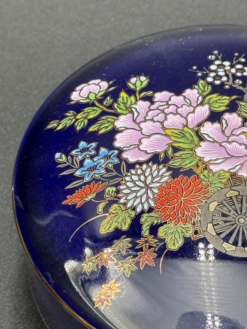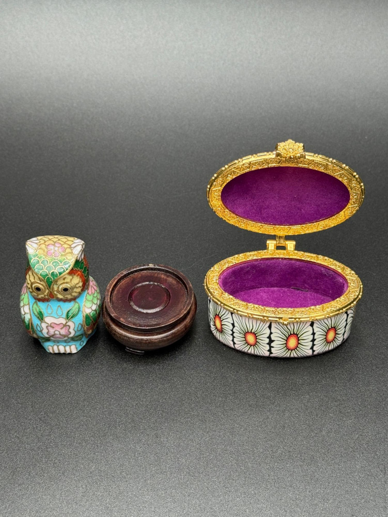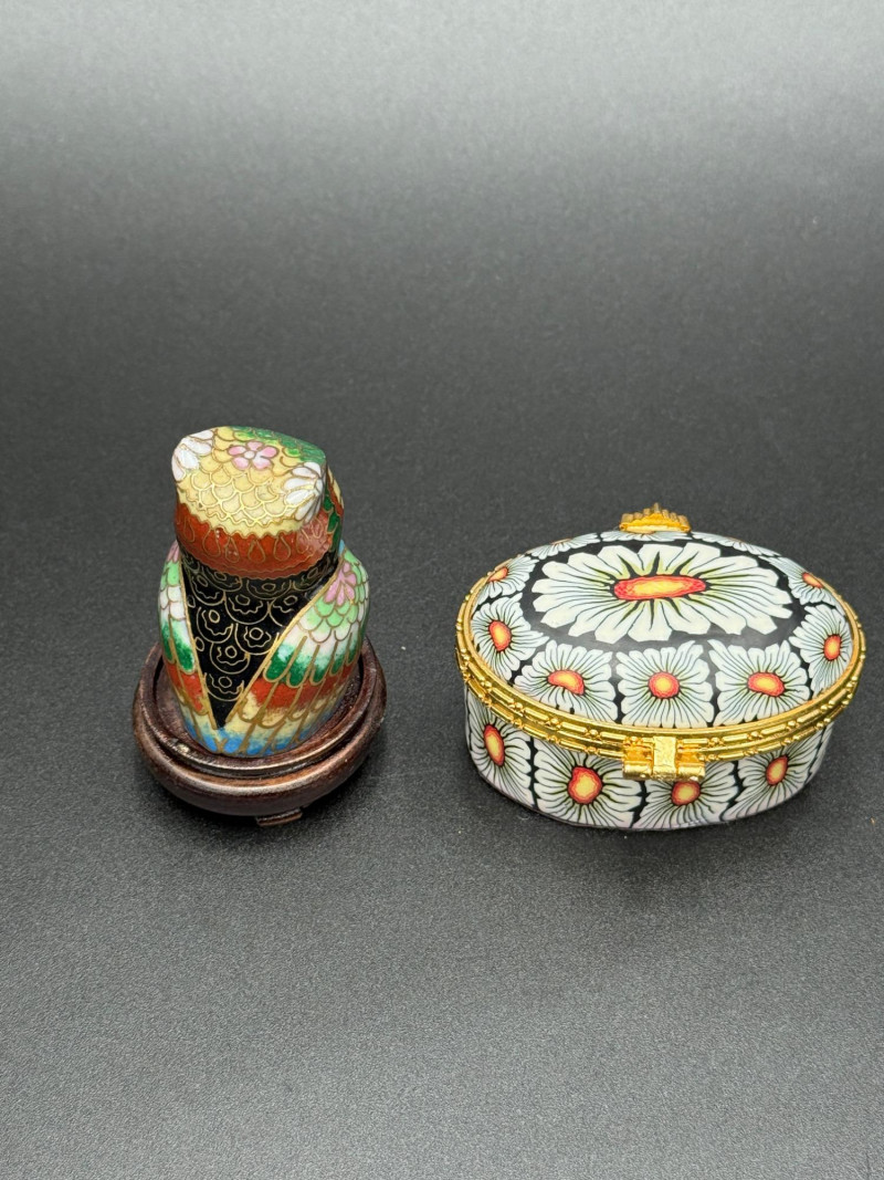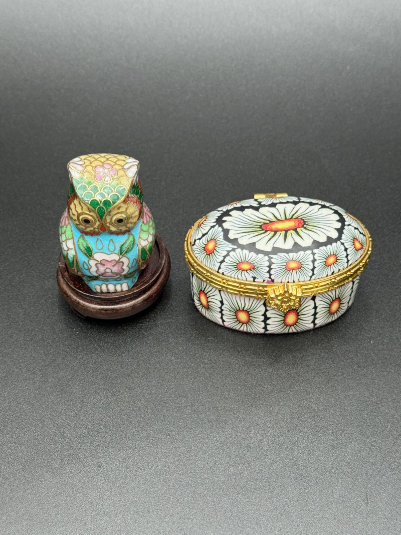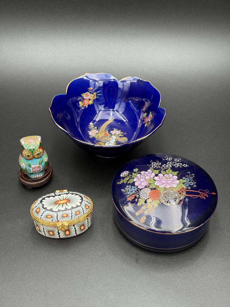 Japanese Porcelain and Chinese Cloisonné Decorative Pieces Four decorative items including a Chinese cloisonné owl figurine, a hinged trinket box with daisy motif and gold-tone trim, a cobalt blue porcelain trinket box with a hand-decorated flower cart design marked “JAPAN,” and a scalloped cobalt blue porcelain bowl with peacock and floral decoration, also marked “JAPAN.” Includes: Chinese cloisonné owl figurine – 3" H Hinged trinket box with daisy motif – 2.75" L × 2.25" W × 2" H Cobalt blue porcelain trinket box with flower cart design – 5" D × 2" H Cobalt blue porcelain bowl with peacock and floral decoration – 6" D × 2.75" H