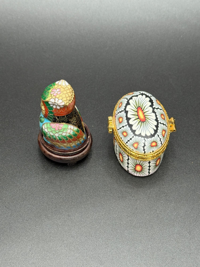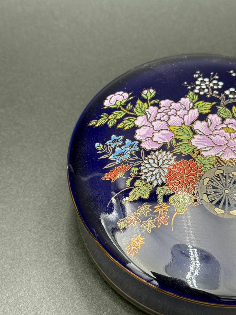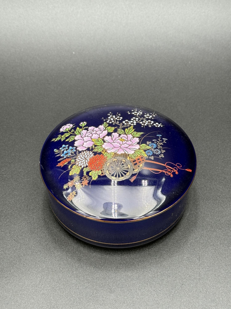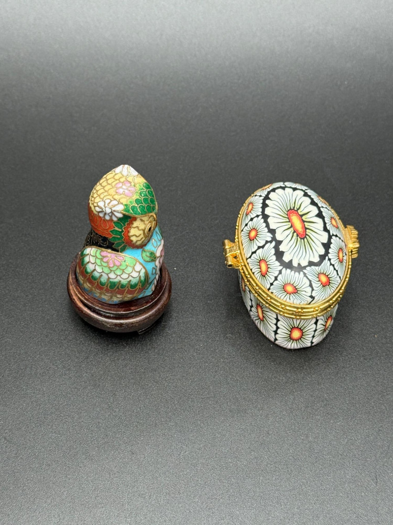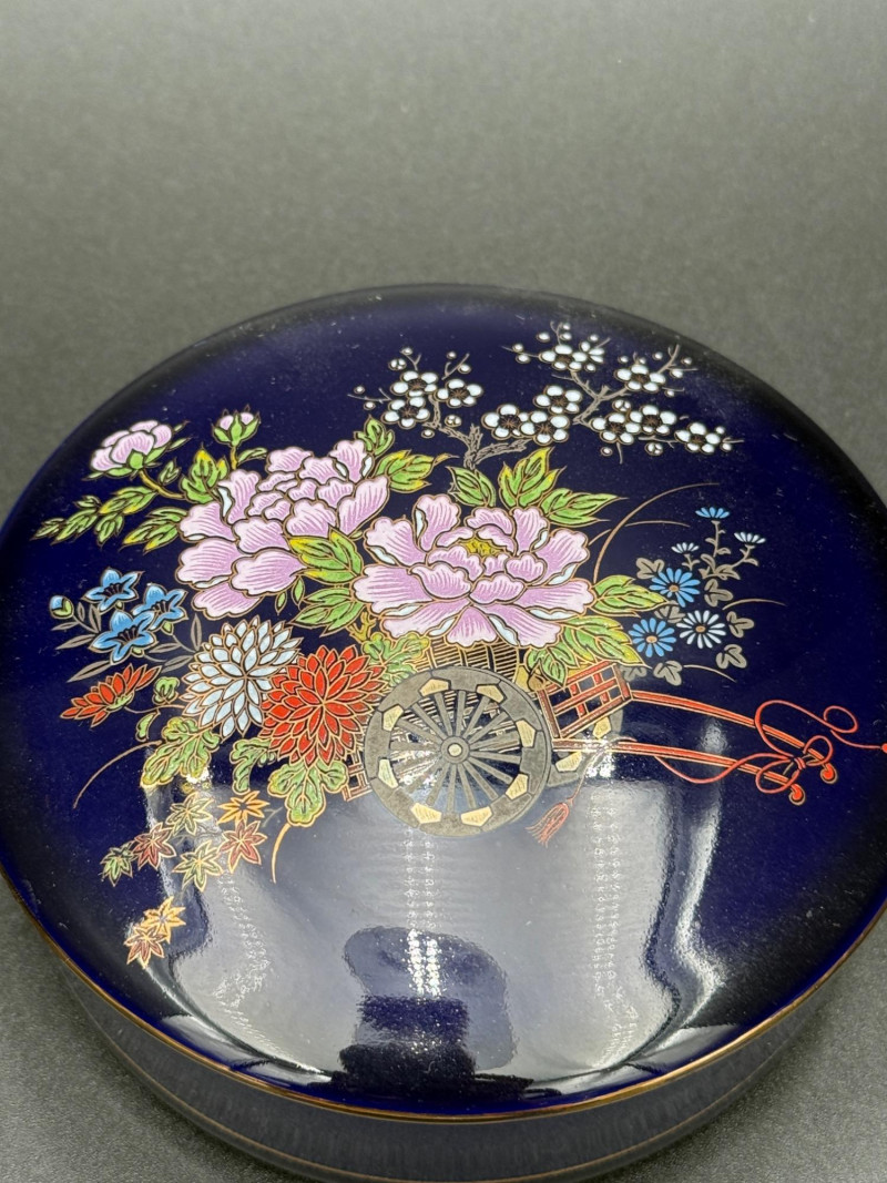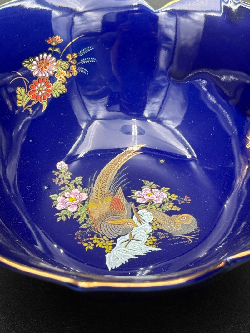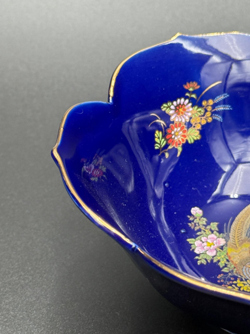 Japanese Porcelain and Chinese Cloisonné Decorative Pieces Four decorative items including a Chinese cloisonné owl figurine, a hinged trinket box with daisy motif and gold-tone trim, a cobalt blue porcelain trinket box with a hand-decorated flower cart design marked “JAPAN,” and a scalloped cobalt blue porcelain bowl with peacock and floral decoration, also marked “JAPAN.” Includes: Chinese cloisonné owl figurine – 3" H Hinged trinket box with daisy motif – 2.75" L × 2.25" W × 2" H Cobalt blue porcelain trinket box with flower cart design – 5" D × 2" H Cobalt blue porcelain bowl with peacock and floral decoration – 6" D × 2.75" H