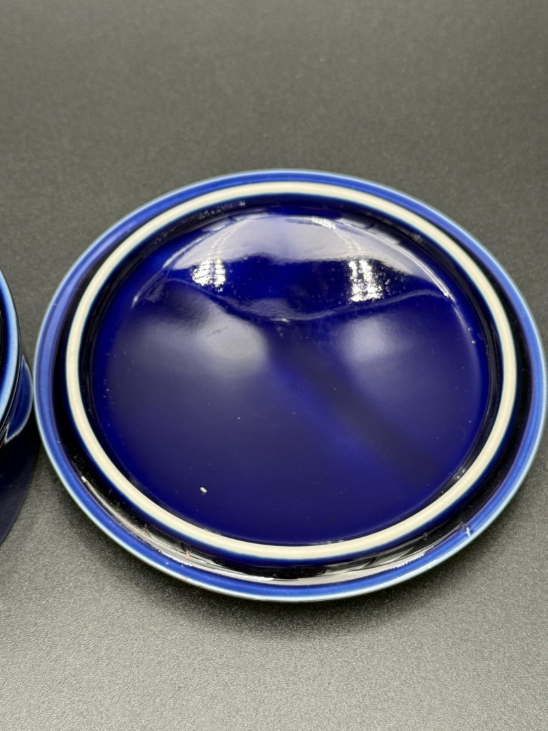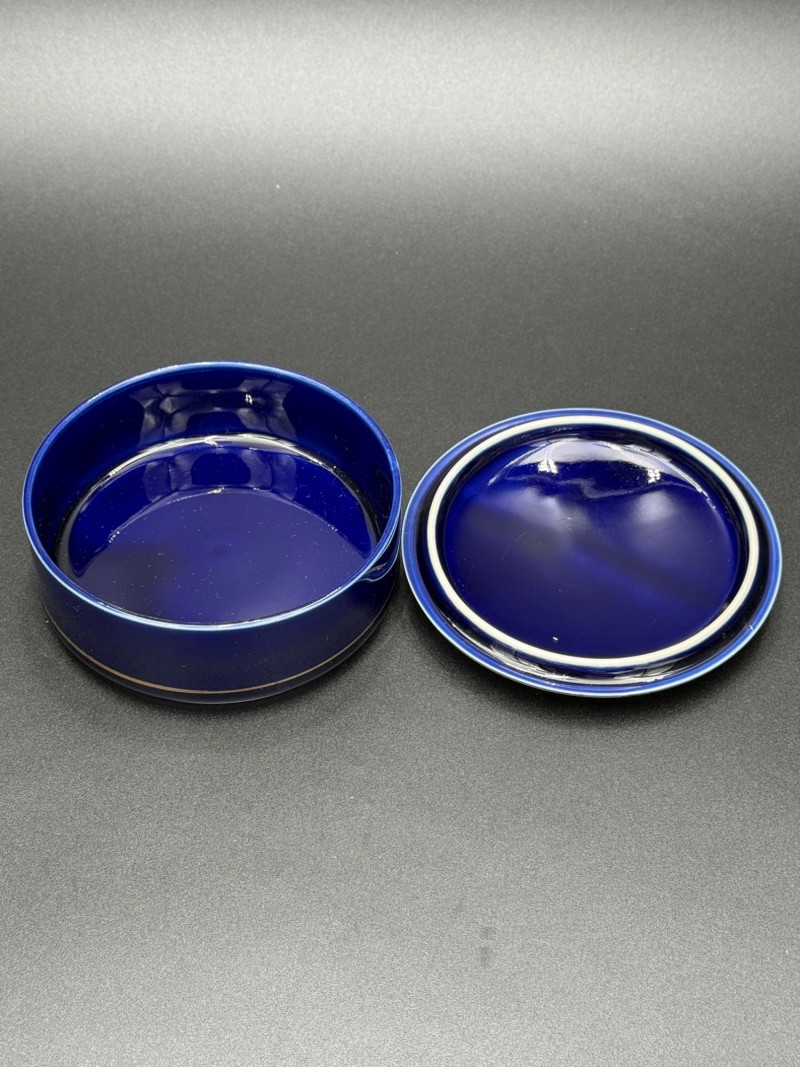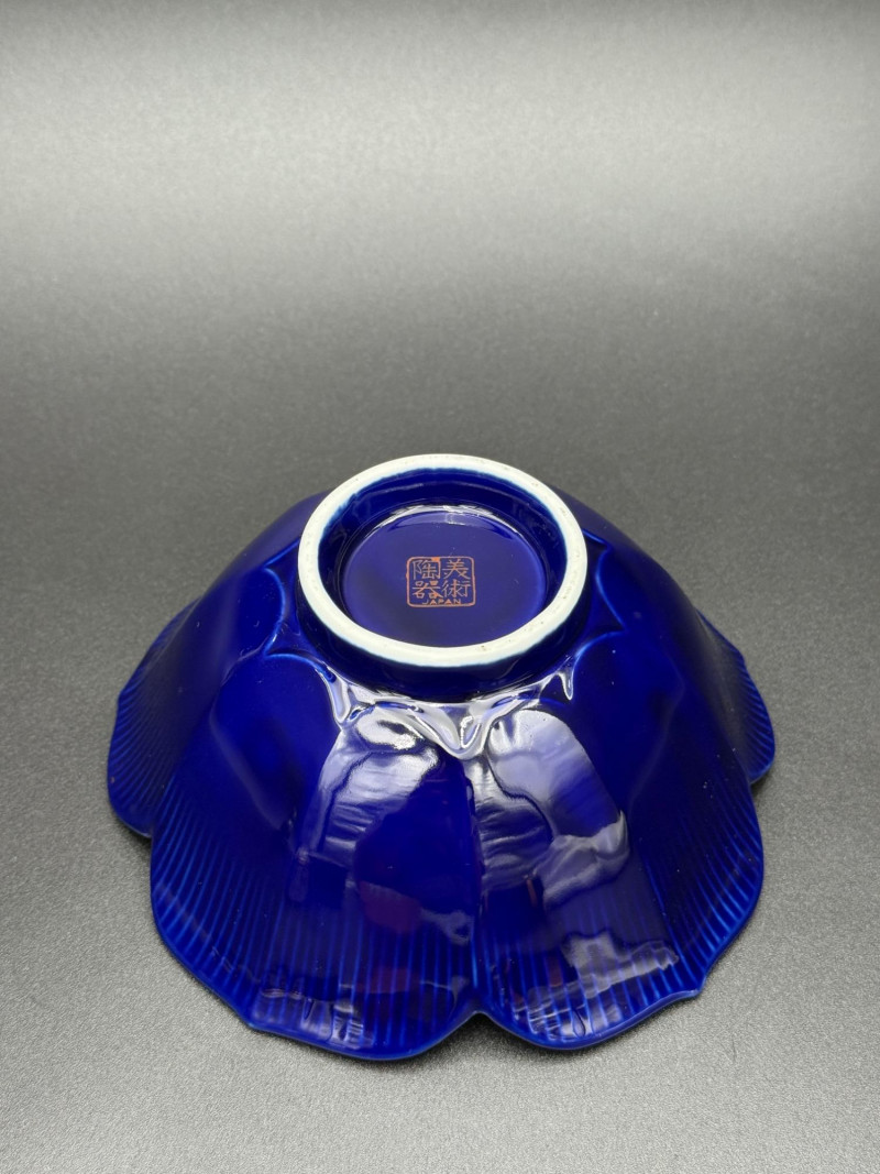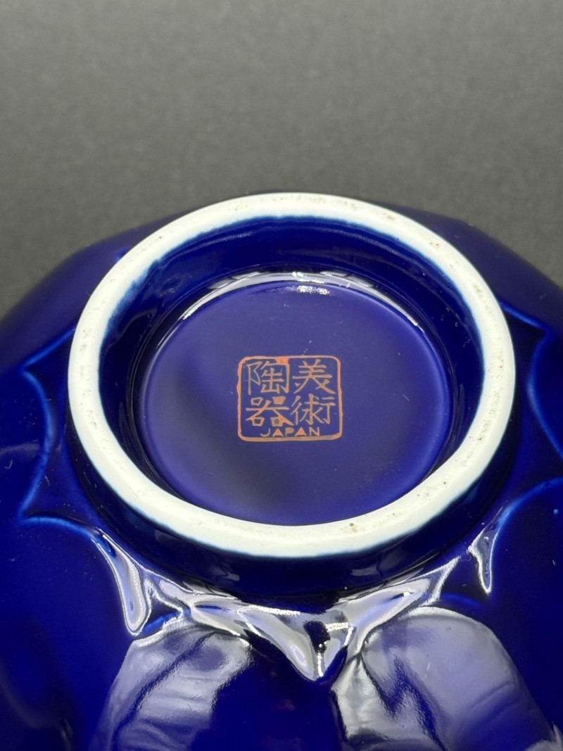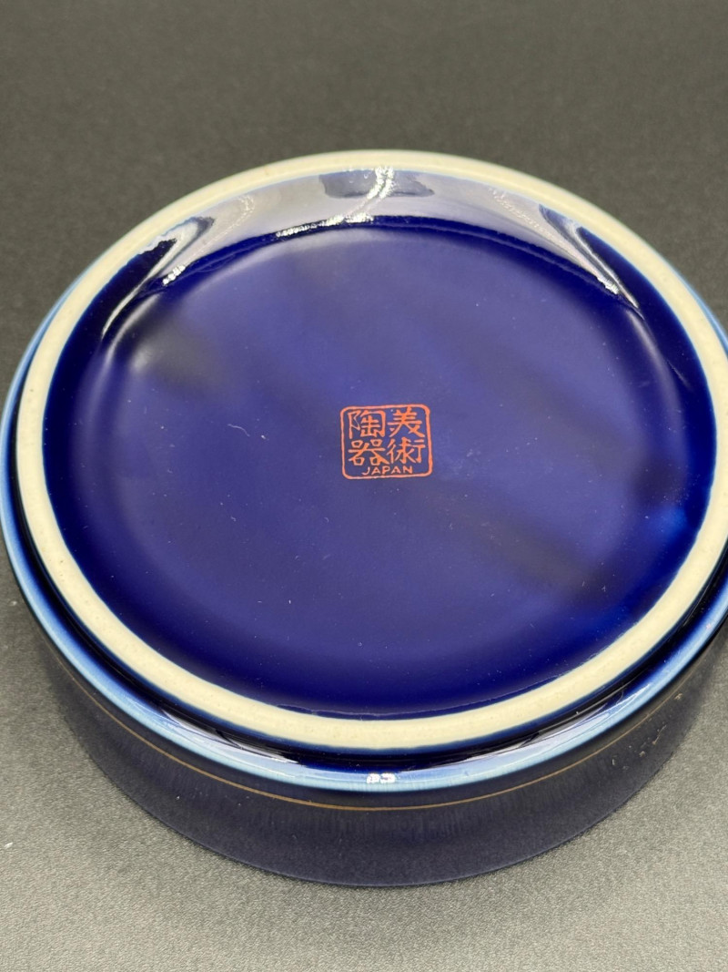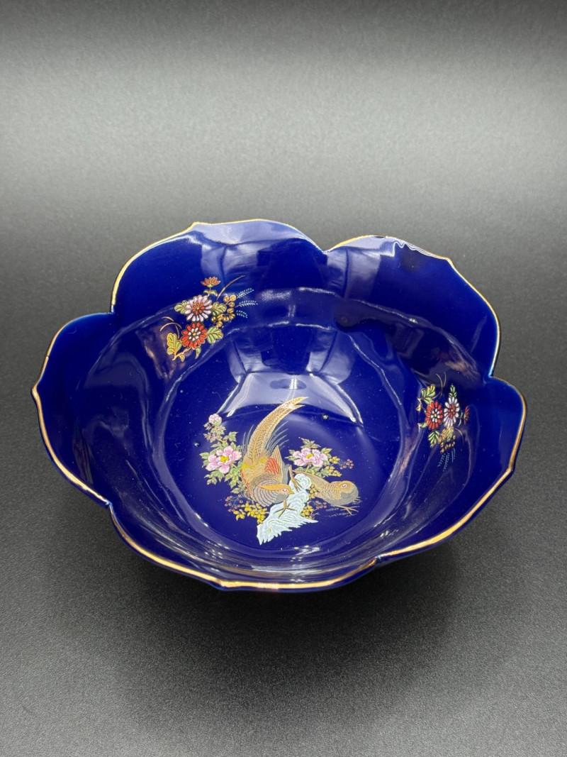 Japanese Porcelain and Chinese Cloisonné Decorative Pieces Four decorative items including a Chinese cloisonné owl figurine, a hinged trinket box with daisy motif and gold-tone trim, a cobalt blue porcelain trinket box with a hand-decorated flower cart design marked “JAPAN,” and a scalloped cobalt blue porcelain bowl with peacock and floral decoration, also marked “JAPAN.” Includes: Chinese cloisonné owl figurine – 3" H Hinged trinket box with daisy motif – 2.75" L × 2.25" W × 2" H Cobalt blue porcelain trinket box with flower cart design – 5" D × 2" H Cobalt blue porcelain bowl with peacock and floral decoration – 6" D × 2.75" H