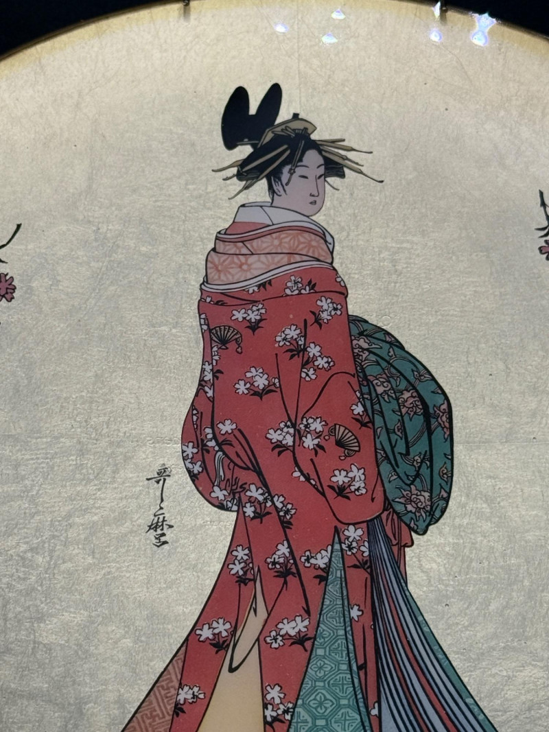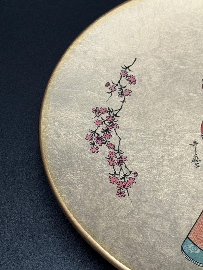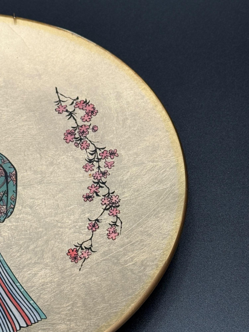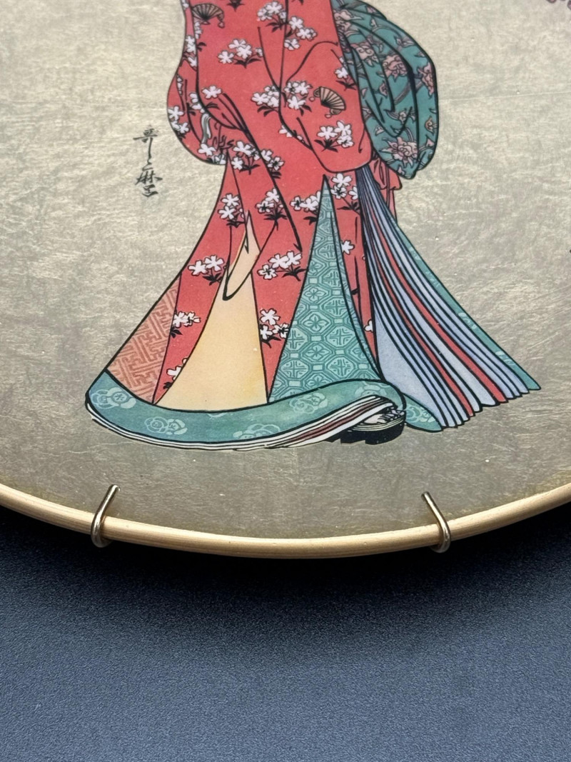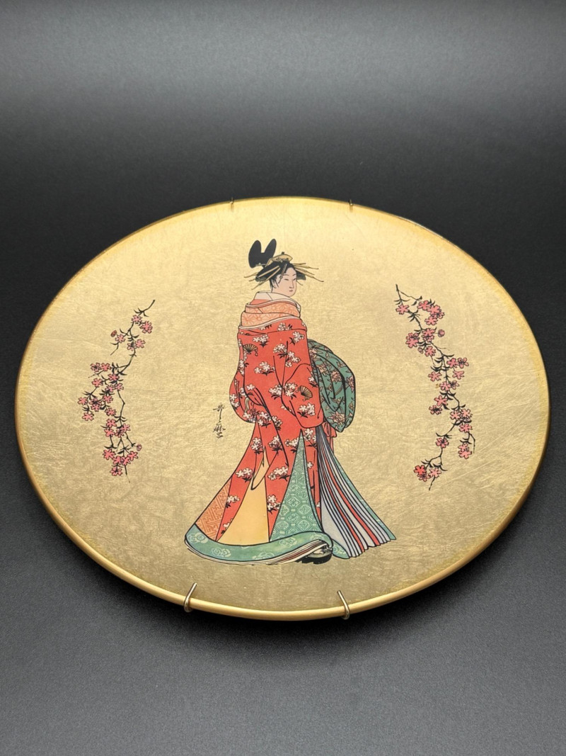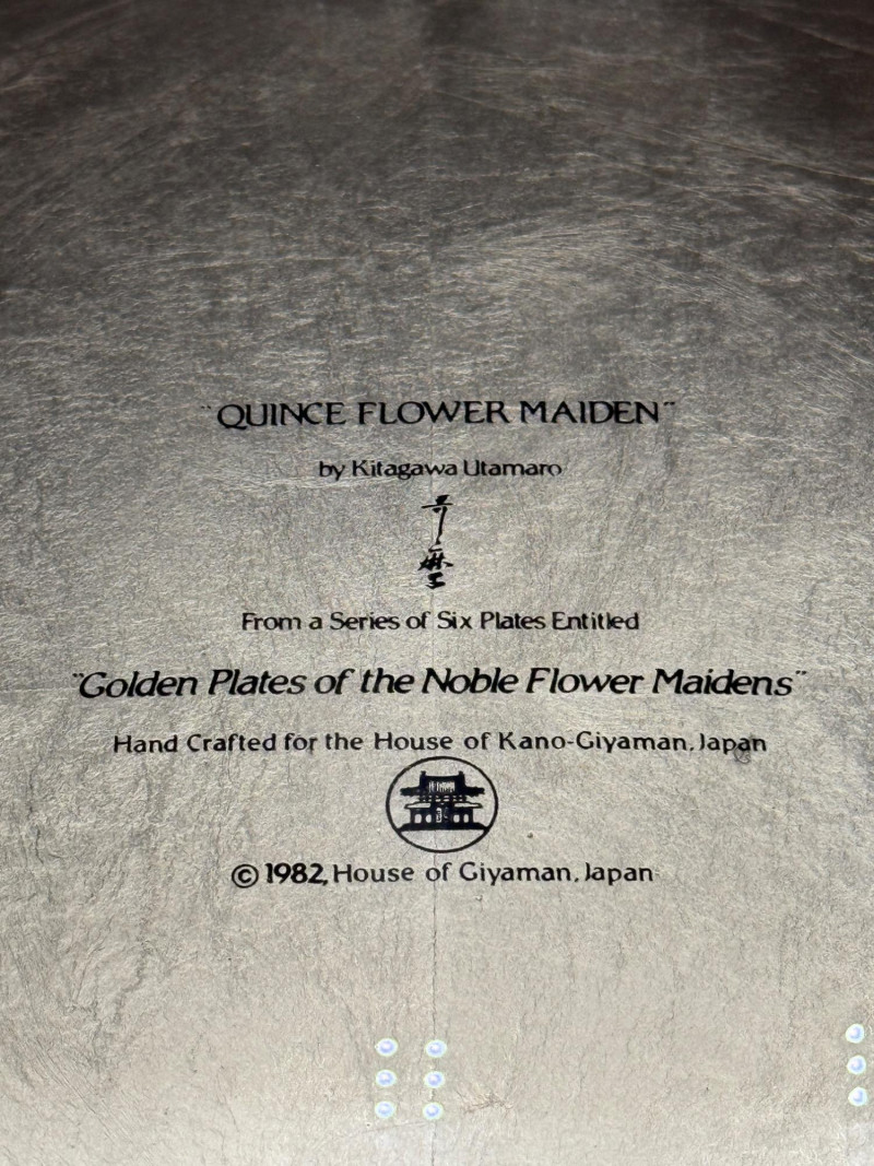 Vintage “Quince Flower Maiden” Decorative Plate – 1982 Japan Decorative wall plate featuring a central figure of a woman in traditional Japanese attire with patterned layers and floral designs, flanked by flowering quince branches on each side. The background is rendered in a metallic gold finish. From the series Golden Plates of the Noble Flower Maidens by Kitagawa Utamaro, produced by the House of Kano-Giyaman, Japan, and dated 1982. Markings: Titled: Quince Flower Maiden Back inscription: House of Giyaman, Japan Copyright: ©1982 Marked “Made in Japan” Diameter: 9.5 inches