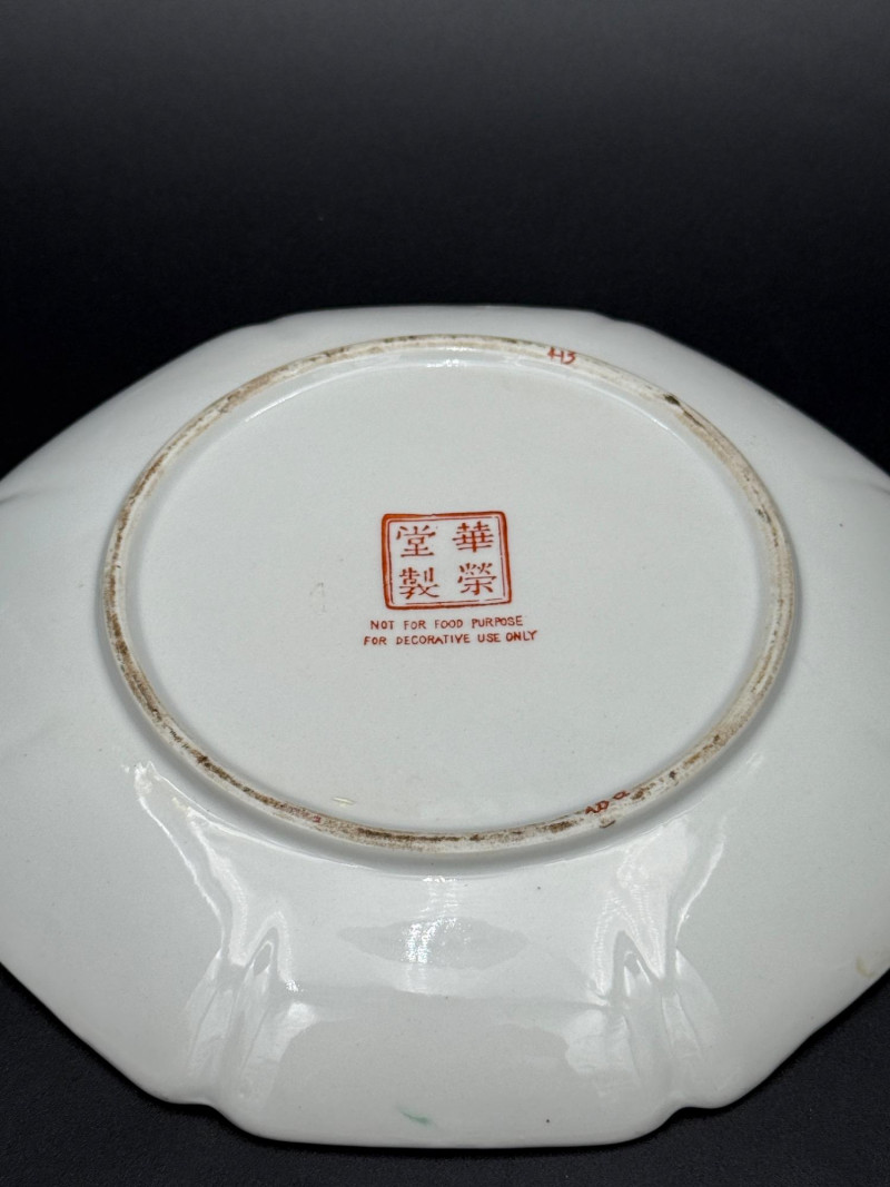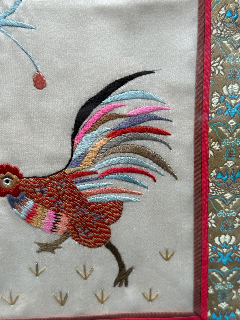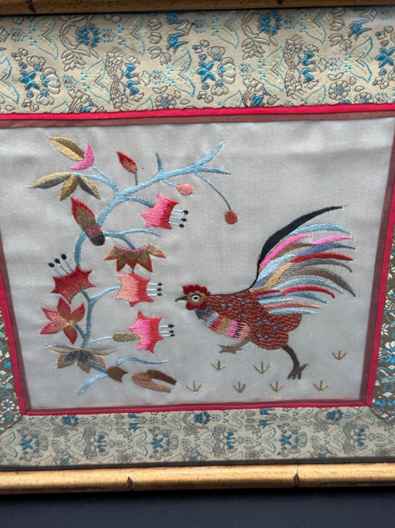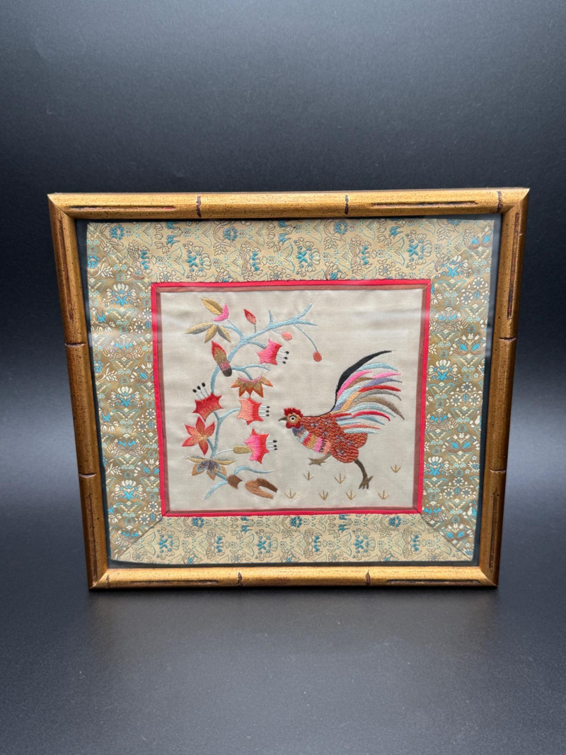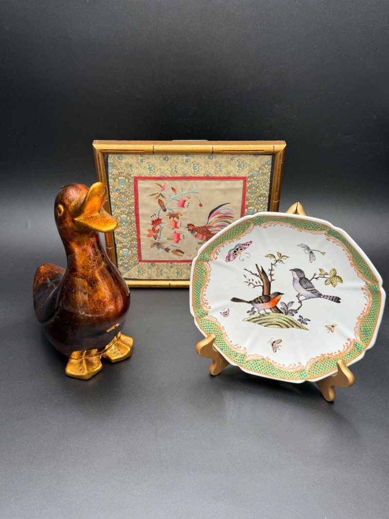 Embroidered Rooster Frame, Chinese Hua Rong Plate, and Duck Figure Set of three decorative items including a framed textile panel, a Chinese scalloped plate marked “Hua Rong Tang Zhi,” and a carved duck figure. The framed textile features an embroidered rooster with floral elements, bordered in patterned fabric and housed in a bamboo-style frame. The Chinese plate has an octagonal form with birds and butterflies in the center, surrounded by a patterned rim. The underside bears a red “Hua Rong Tang Zhi” mark. The duck figure is carved with a raised beak and curved body, standing on webbed feet. Dimensions (approximate): Frame: 10 x 10 inches Plate: 8.5 x 1.5 inches Duck: 12 x 11 x 4 inches