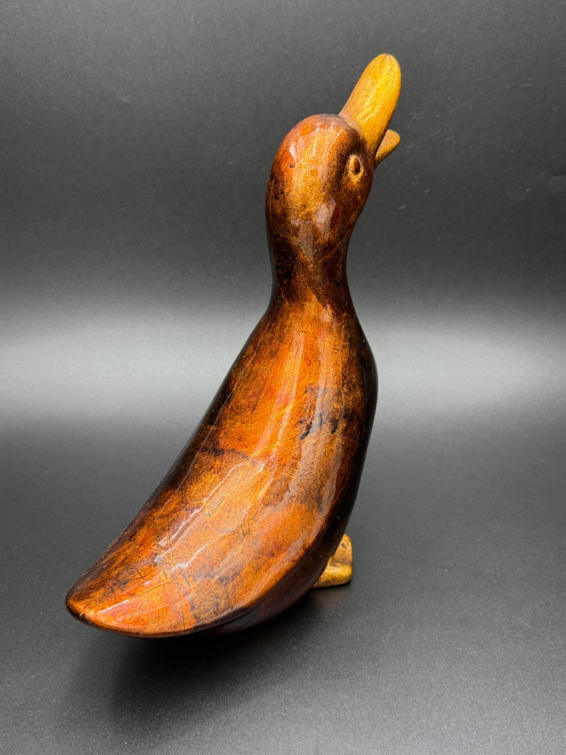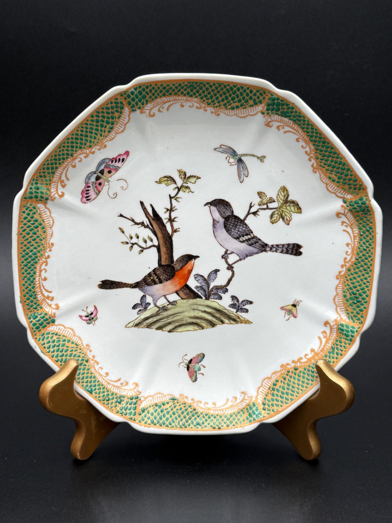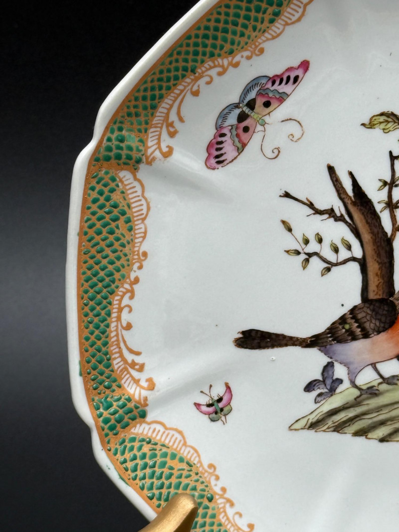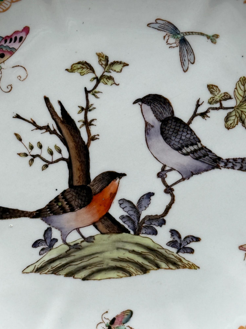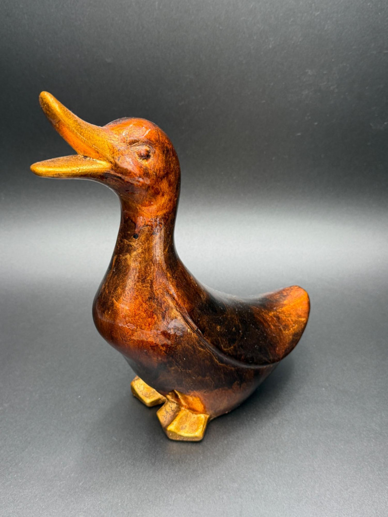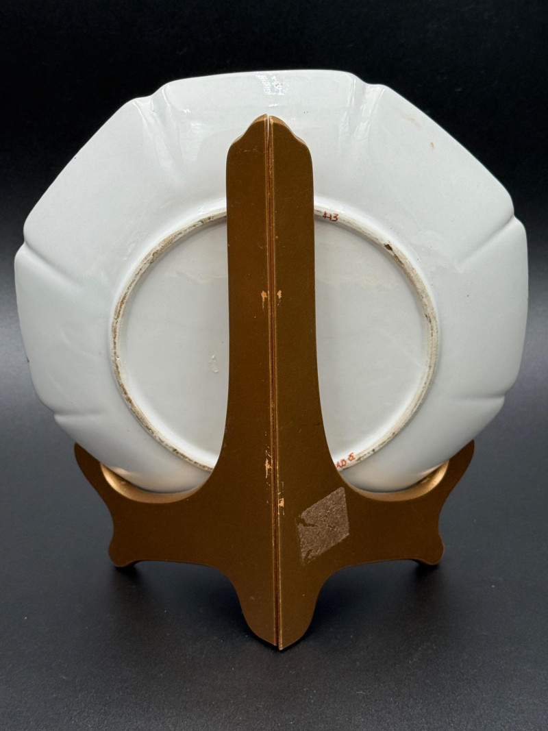 Embroidered Rooster Frame, Chinese Hua Rong Plate, and Duck Figure Set of three decorative items including a framed textile panel, a Chinese scalloped plate marked “Hua Rong Tang Zhi,” and a carved duck figure. The framed textile features an embroidered rooster with floral elements, bordered in patterned fabric and housed in a bamboo-style frame. The Chinese plate has an octagonal form with birds and butterflies in the center, surrounded by a patterned rim. The underside bears a red “Hua Rong Tang Zhi” mark. The duck figure is carved with a raised beak and curved body, standing on webbed feet. Dimensions (approximate): Frame: 10 x 10 inches Plate: 8.5 x 1.5 inches Duck: 12 x 11 x 4 inches