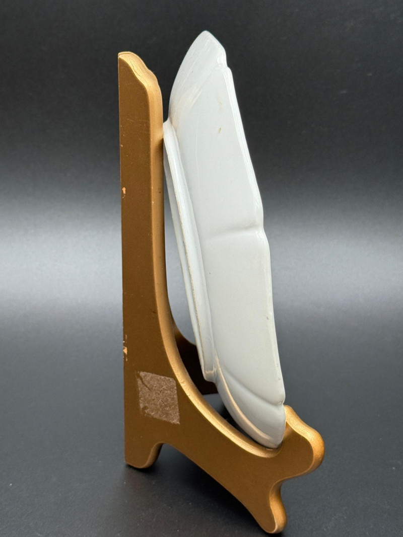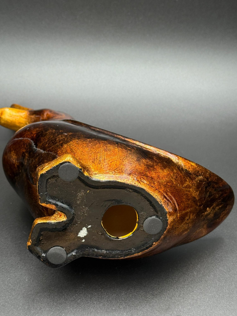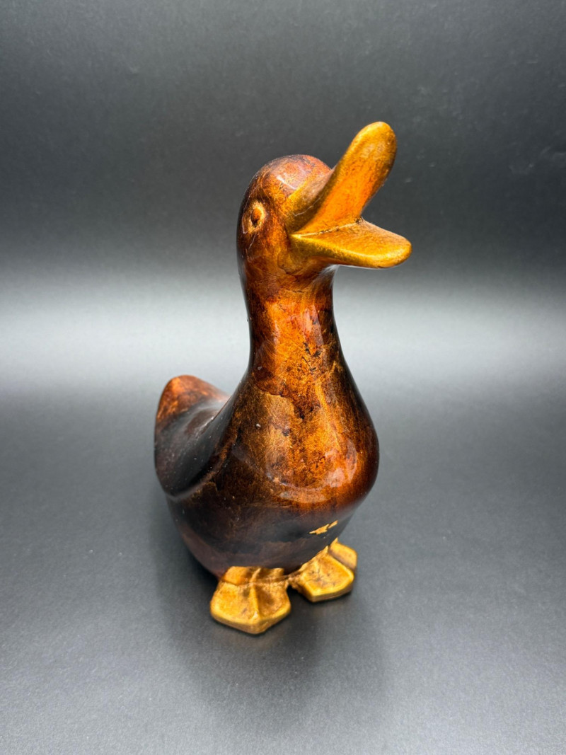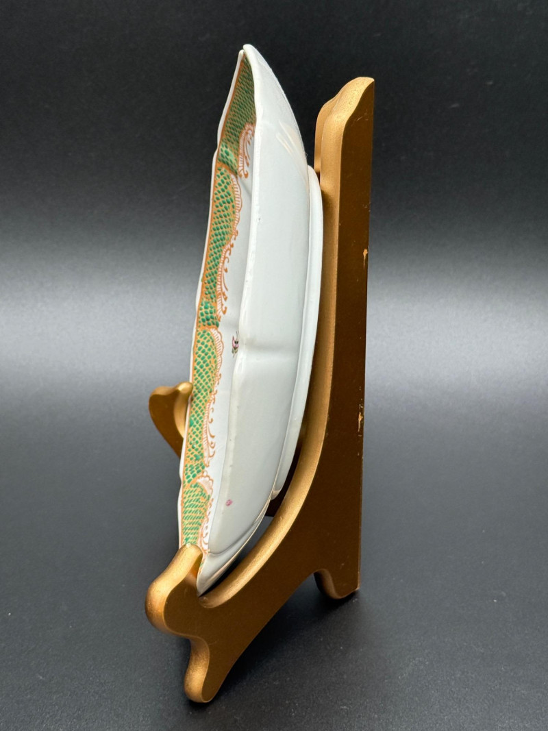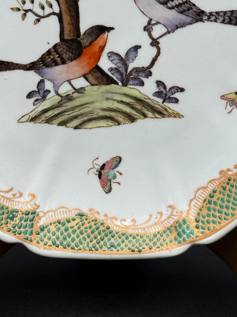 Embroidered Rooster Frame, Chinese Hua Rong Plate, and Duck Figure Set of three decorative items including a framed textile panel, a Chinese scalloped plate marked “Hua Rong Tang Zhi,” and a carved duck figure. The framed textile features an embroidered rooster with floral elements, bordered in patterned fabric and housed in a bamboo-style frame. The Chinese plate has an octagonal form with birds and butterflies in the center, surrounded by a patterned rim. The underside bears a red “Hua Rong Tang Zhi” mark. The duck figure is carved with a raised beak and curved body, standing on webbed feet. Dimensions (approximate): Frame: 10 x 10 inches Plate: 8.5 x 1.5 inches Duck: 12 x 11 x 4 inches