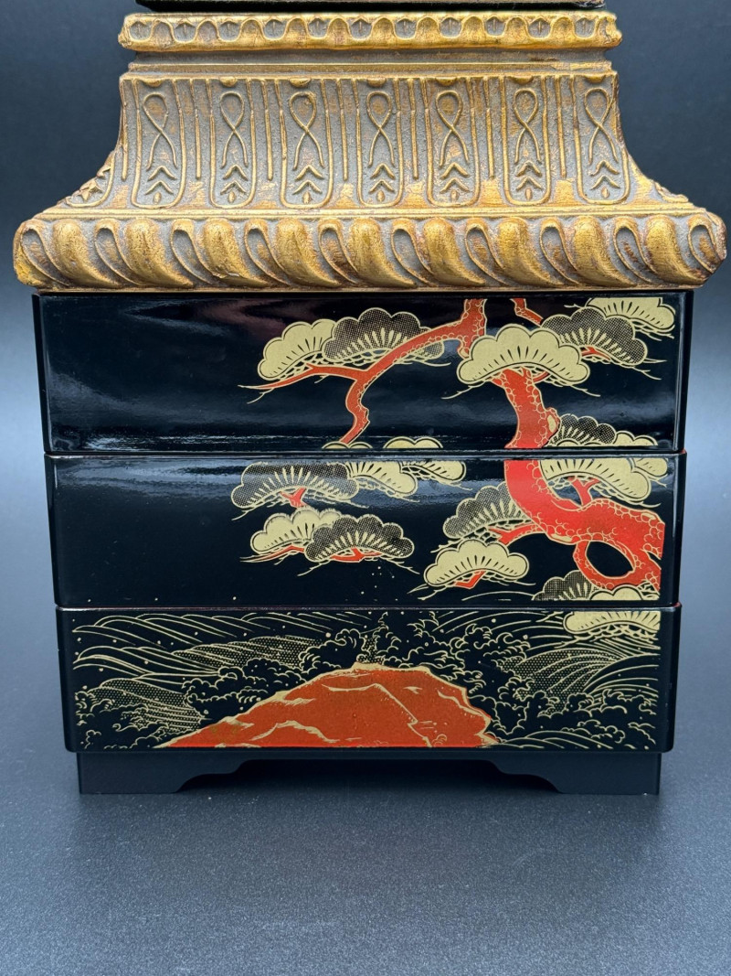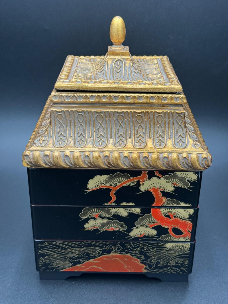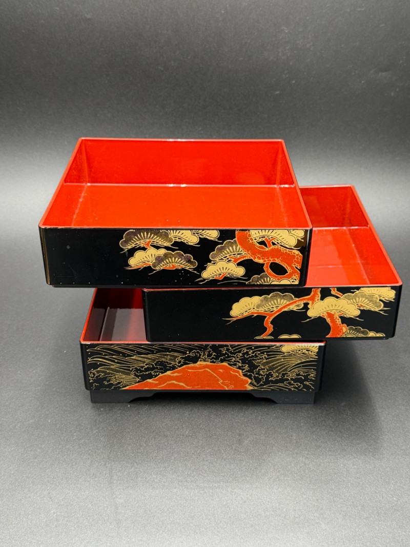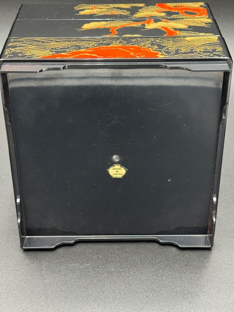 Japanese Lacquered Jubako Box with Temple Roof Lid Tiered Japanese jubako box composed of three stacking compartments and a removable lid shaped in the form of a traditional temple roof. The surface is decorated with pine trees, waves, and a red mountain motif, rendered in gold and vermilion against a black lacquered ground. The compartments are lined in red. The piece is marked “Made in Japan” on the base. Dimensions:
