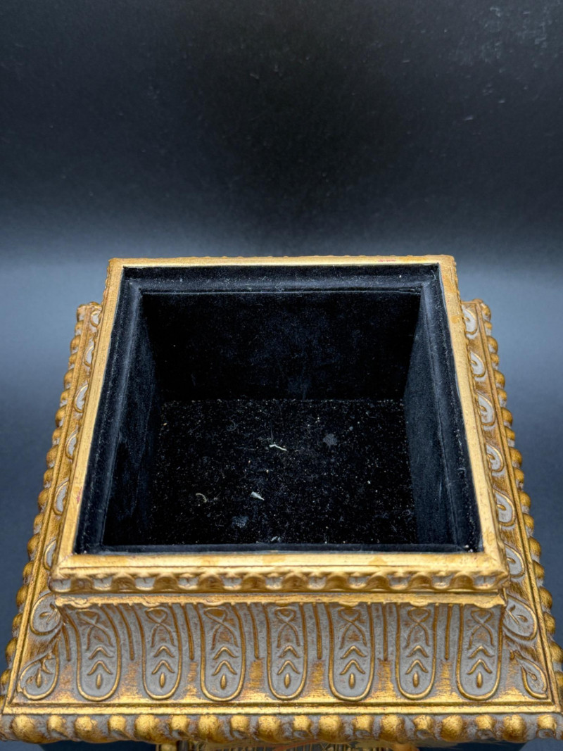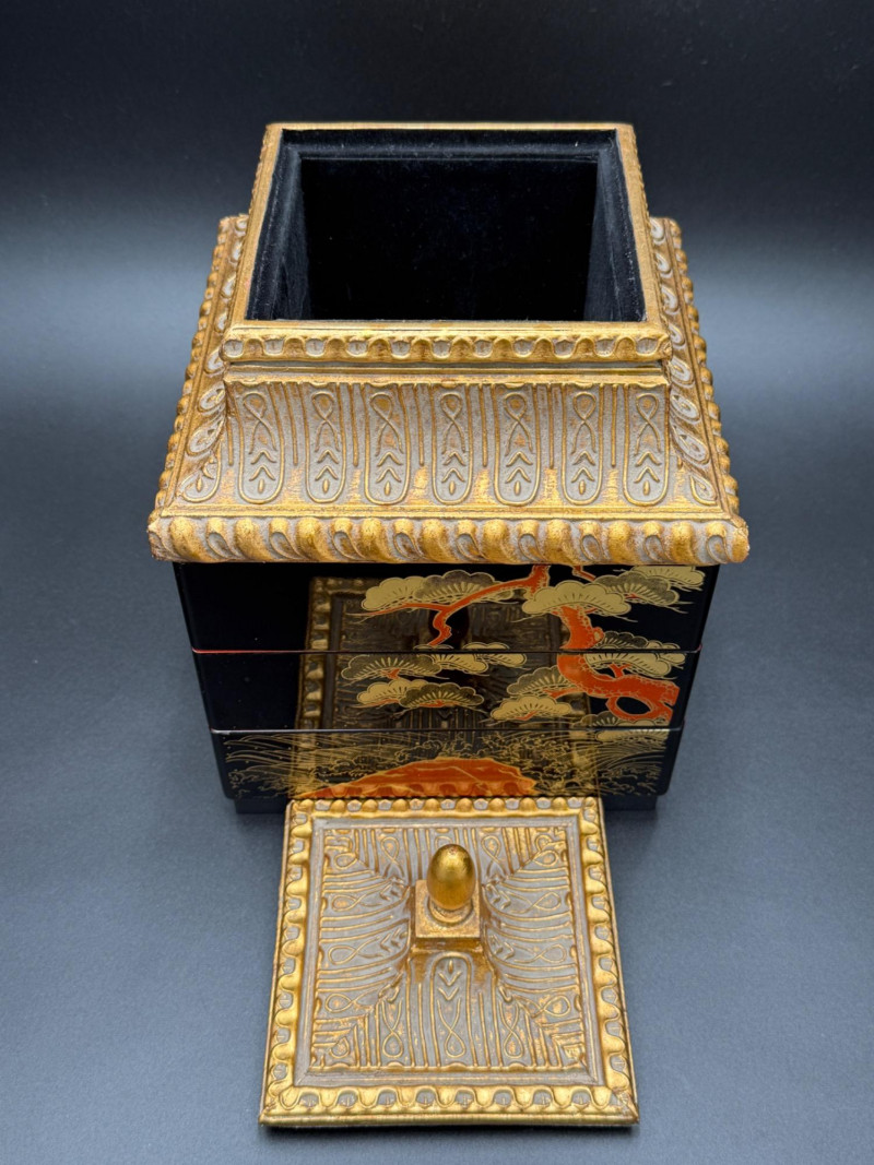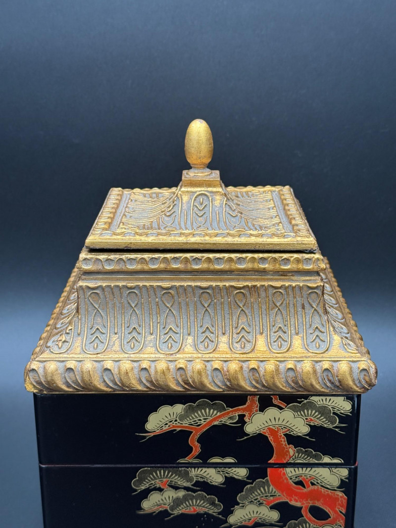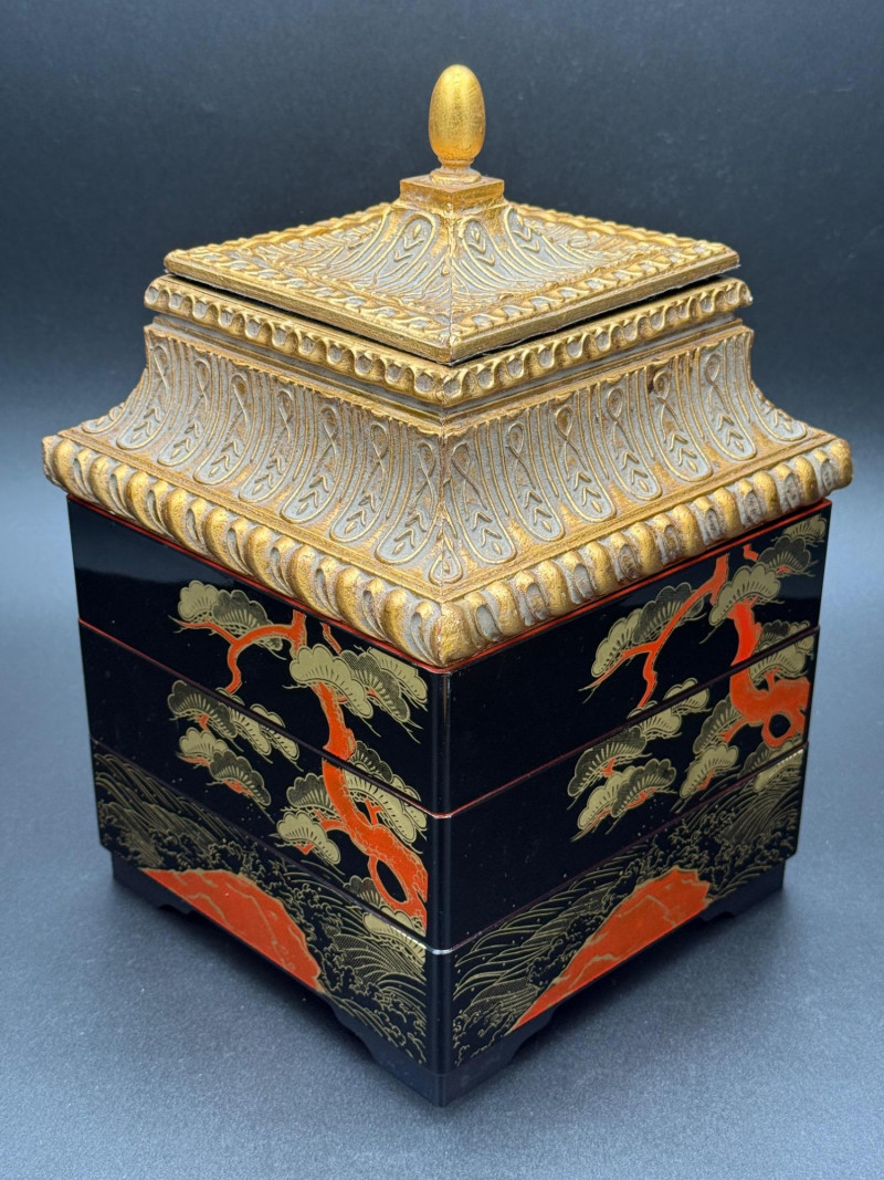 Japanese Lacquered Jubako Box with Temple Roof Lid Tiered Japanese jubako box composed of three stacking compartments and a removable lid shaped in the form of a traditional temple roof. The surface is decorated with pine trees, waves, and a red mountain motif, rendered in gold and vermilion against a black lacquered ground. The compartments are lined in red. The piece is marked “Made in Japan” on the base. Dimensions: