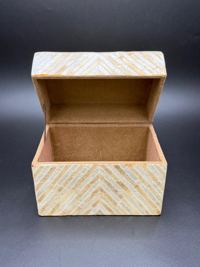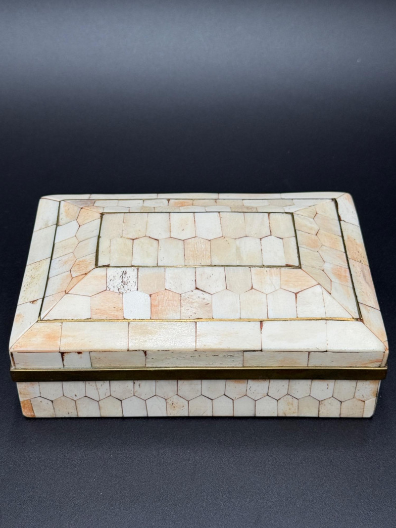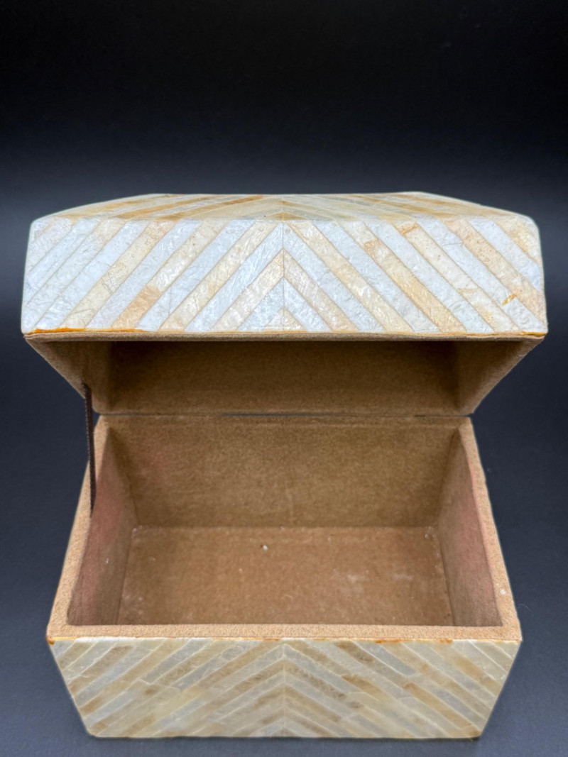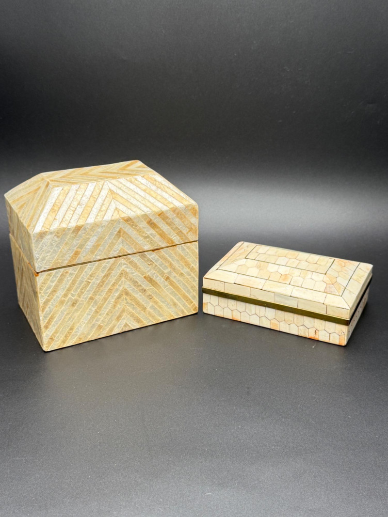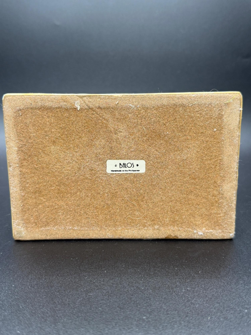 Two Vintage Inlaid Trinket Boxes Set of two vintage decorative trinket boxes featuring inlaid surface designs. One box has a sloped lid with a chevron pattern, a felt-lined interior, and is marked “BALOS Handmade in the Philippines” on the base. The other is a rectangular box with hexagonal inlay and a gold-tone metal interior. It is unmarked but similar in style and construction. Dimensions: