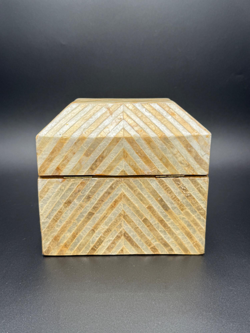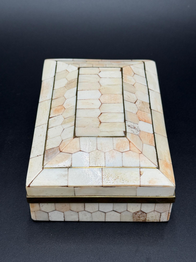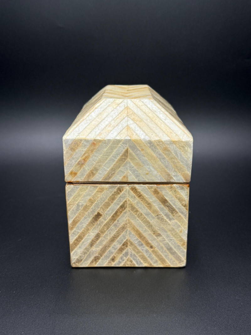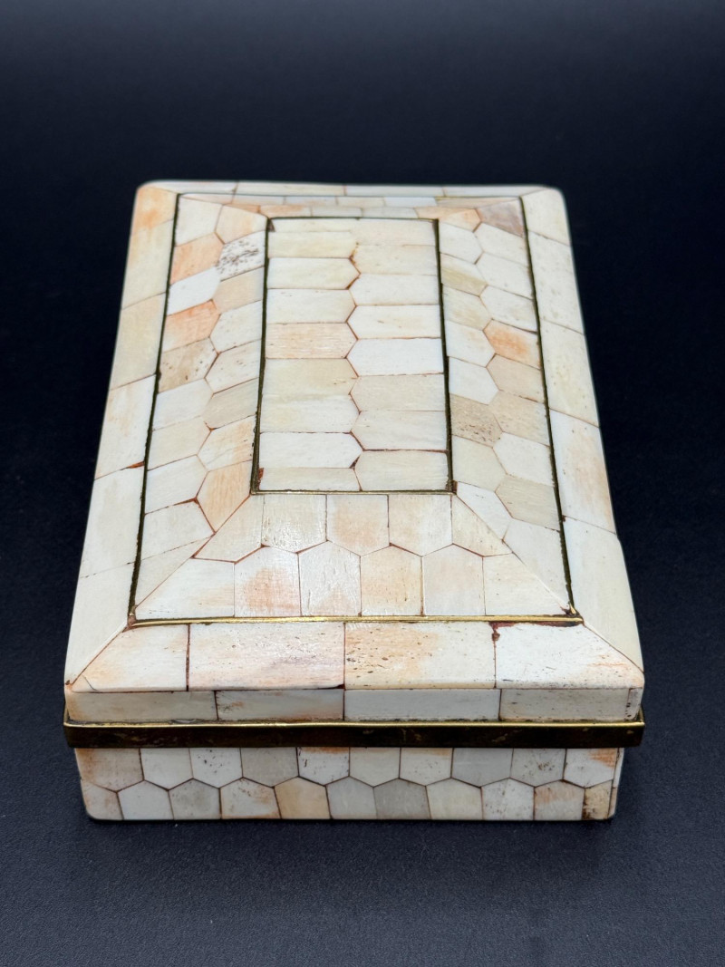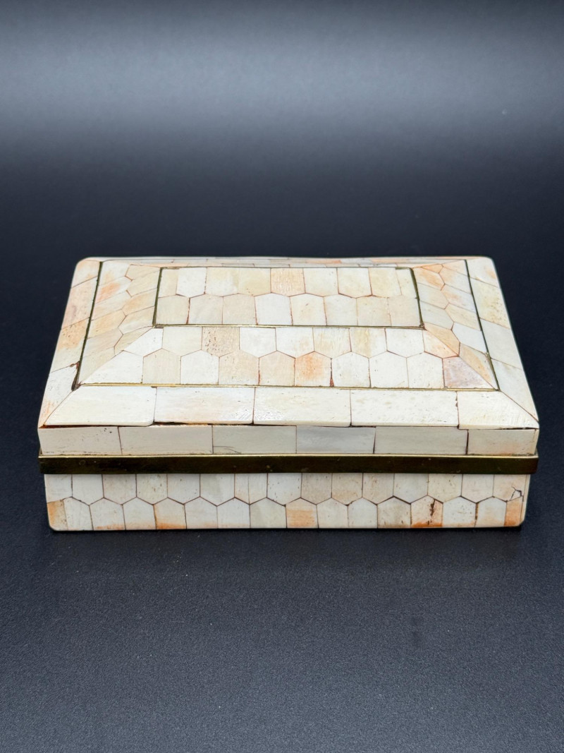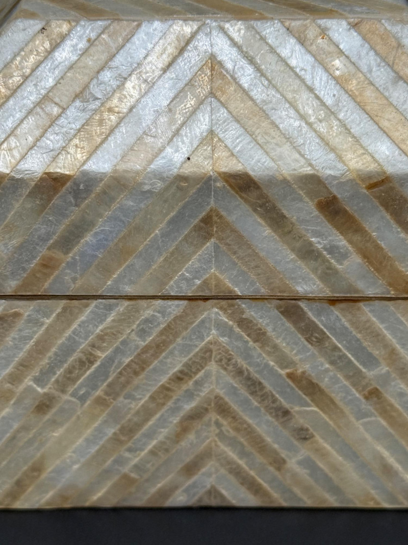 Two Vintage Inlaid Trinket Boxes Set of two vintage decorative trinket boxes featuring inlaid surface designs. One box has a sloped lid with a chevron pattern, a felt-lined interior, and is marked “BALOS Handmade in the Philippines” on the base. The other is a rectangular box with hexagonal inlay and a gold-tone metal interior. It is unmarked but similar in style and construction. Dimensions: