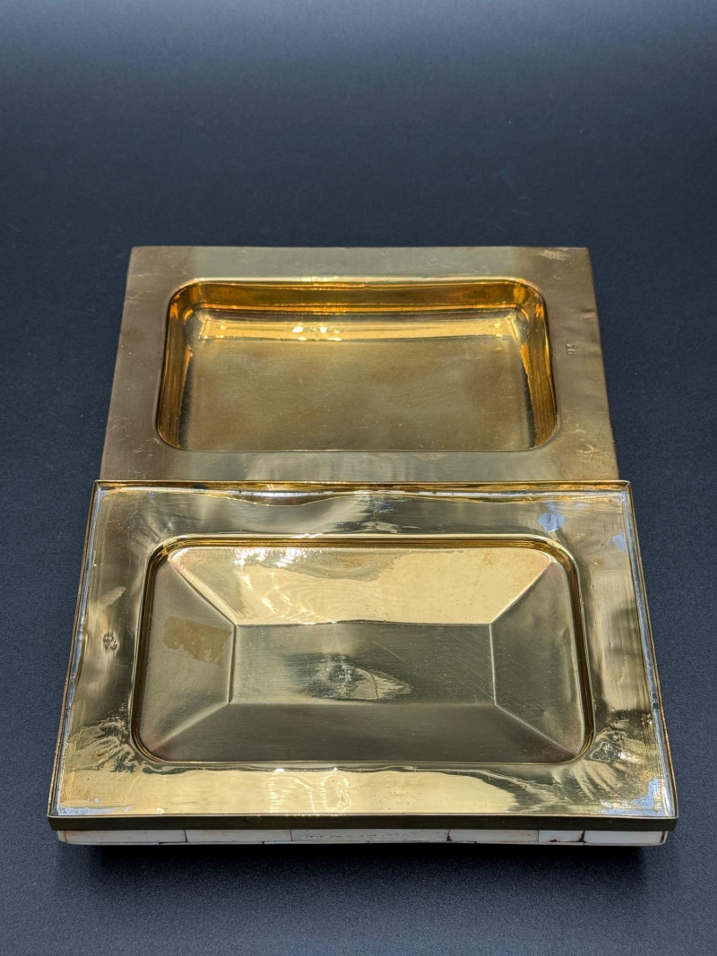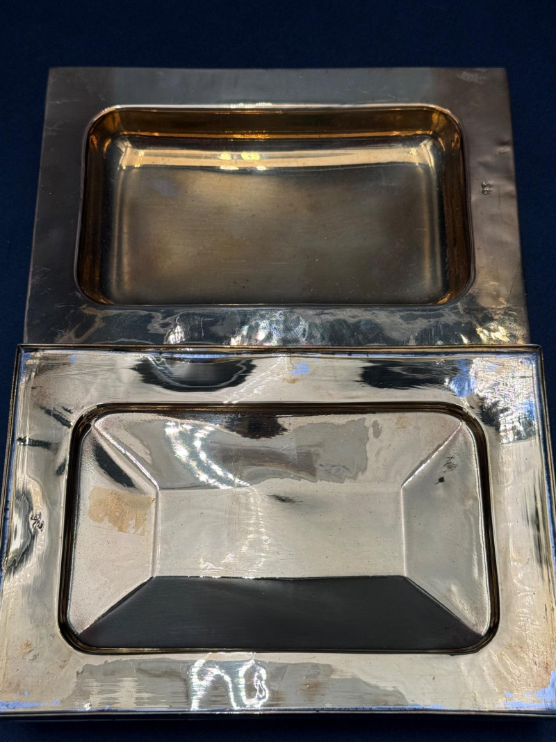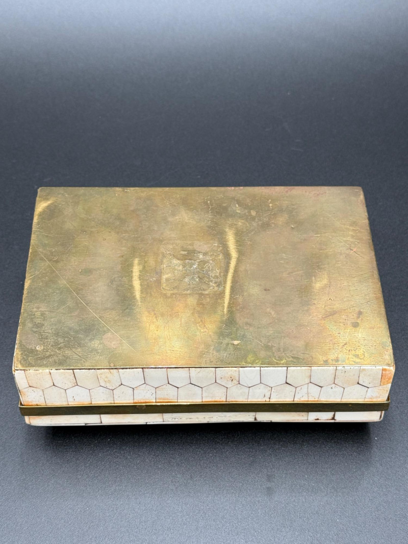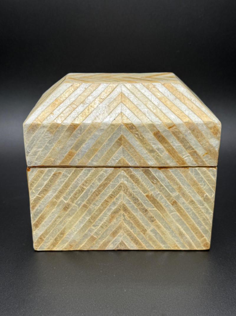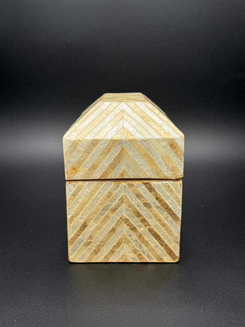 Two Vintage Inlaid Trinket Boxes Set of two vintage decorative trinket boxes featuring inlaid surface designs. One box has a sloped lid with a chevron pattern, a felt-lined interior, and is marked “BALOS Handmade in the Philippines” on the base. The other is a rectangular box with hexagonal inlay and a gold-tone metal interior. It is unmarked but similar in style and construction. Dimensions: