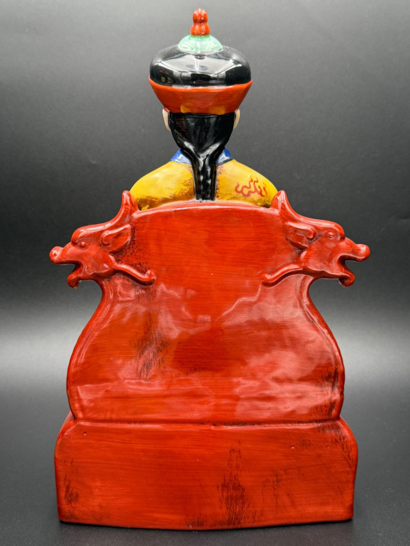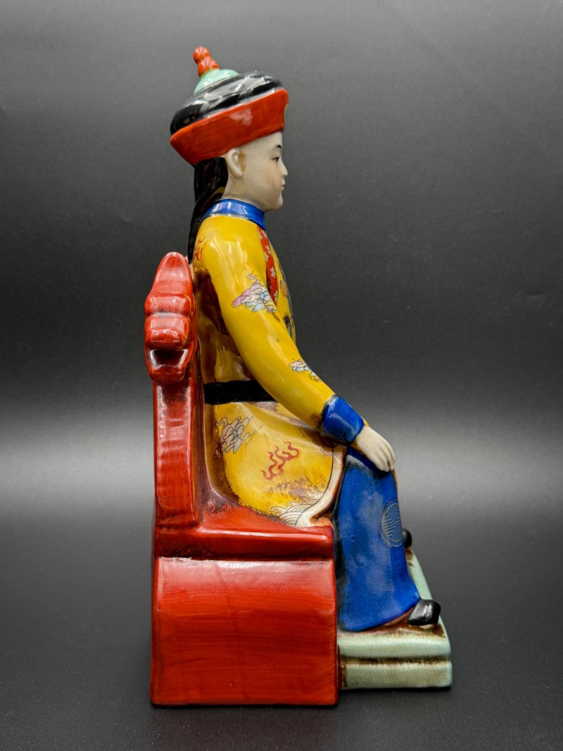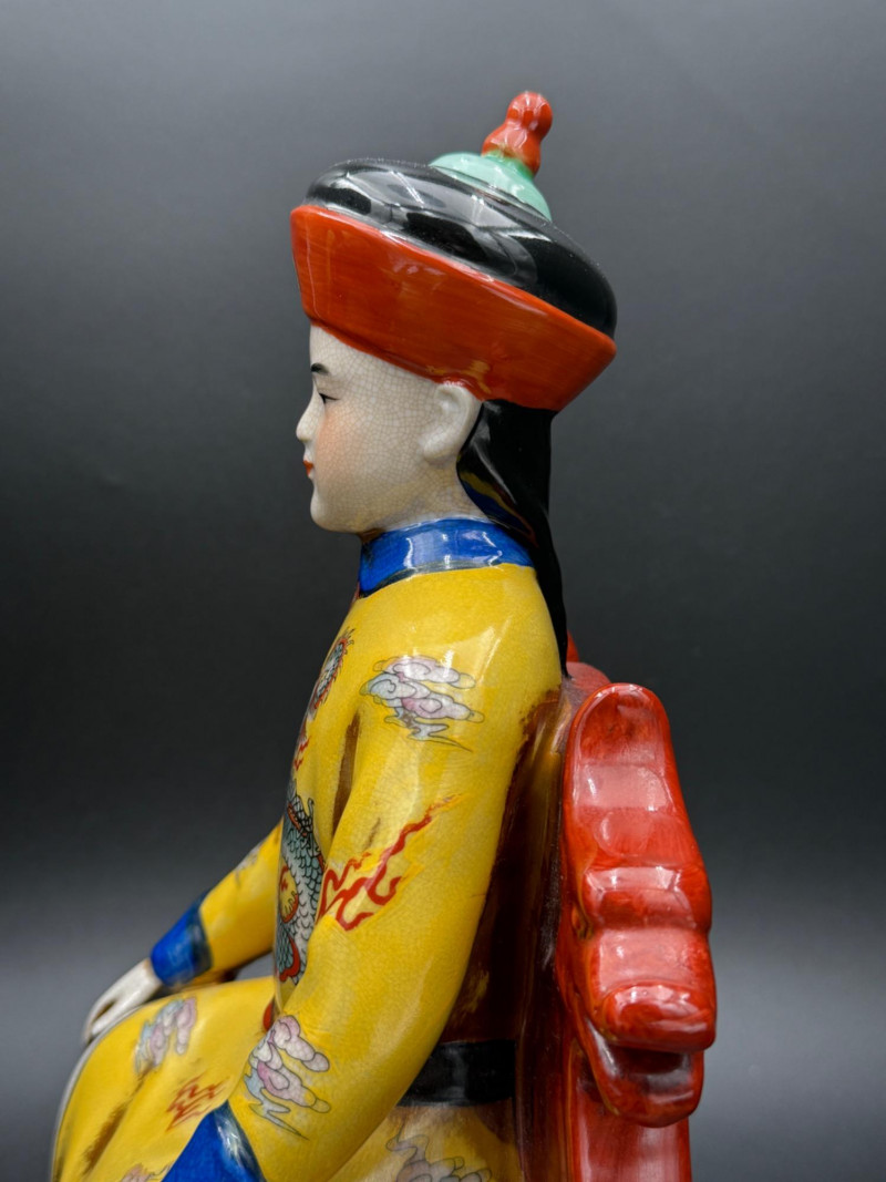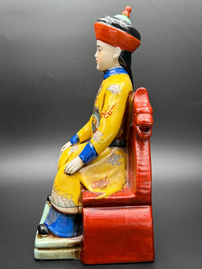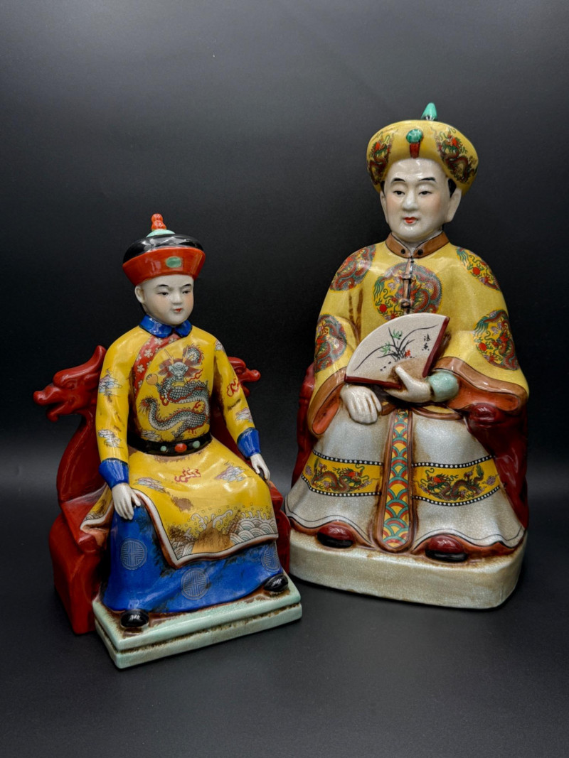 Vintage Chinese Emperor and Prince Porcelain Figures A pair of vintage Chinese porcelain figures representing an emperor and a prince. Both are seated on red thrones with molded detailing. The emperor holds a folding fan and wears a robe with floral and geometric patterns, a sash, and a rounded headdress with raised ornaments. The prince is dressed in a robe decorated with a dragon, with hands resting on the knees and a flat headdress with a top finial. Each figure has a long braided hairstyle and painted facial features. The undersides are unglazed and fitted with protective pads. Dimensions: