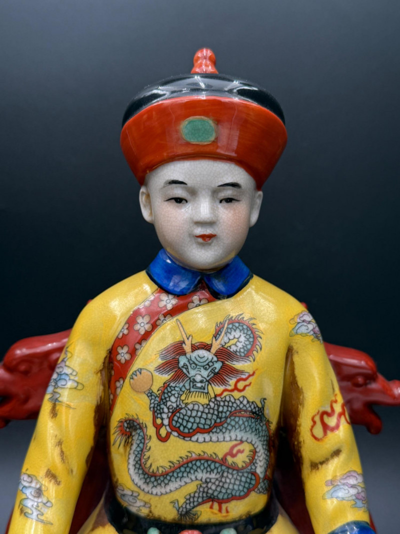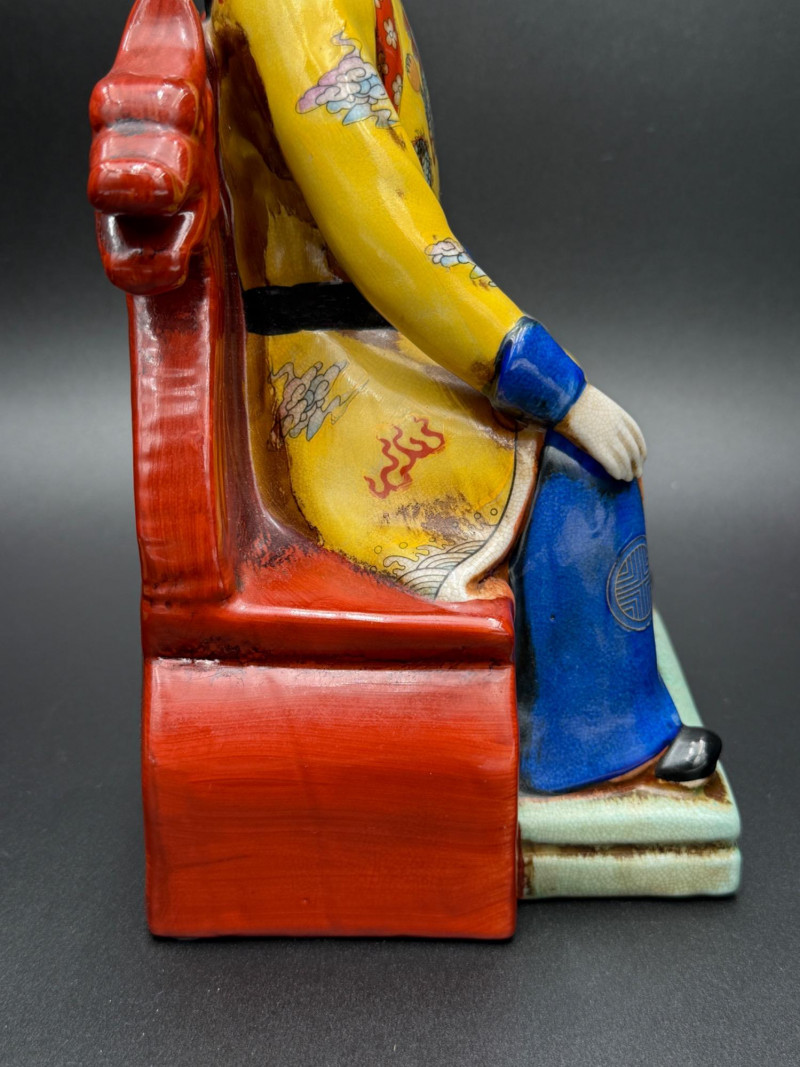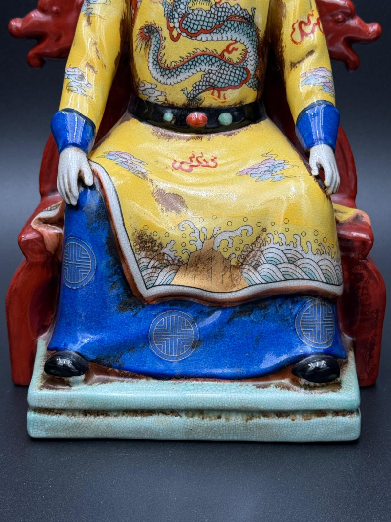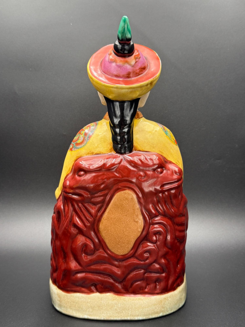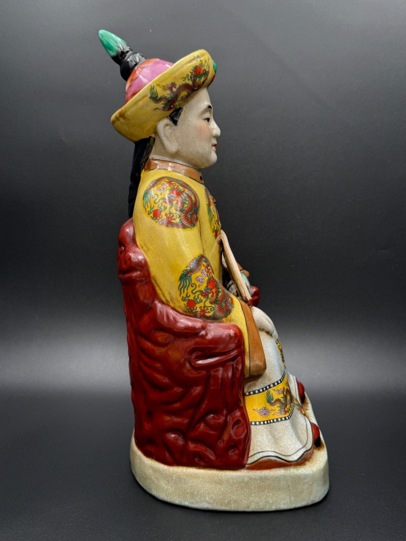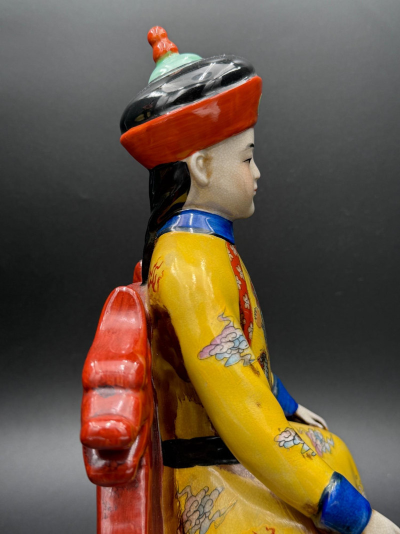 Vintage Chinese Emperor and Prince Porcelain Figures A pair of vintage Chinese porcelain figures representing an emperor and a prince. Both are seated on red thrones with molded detailing. The emperor holds a folding fan and wears a robe with floral and geometric patterns, a sash, and a rounded headdress with raised ornaments. The prince is dressed in a robe decorated with a dragon, with hands resting on the knees and a flat headdress with a top finial. Each figure has a long braided hairstyle and painted facial features. The undersides are unglazed and fitted with protective pads. Dimensions: