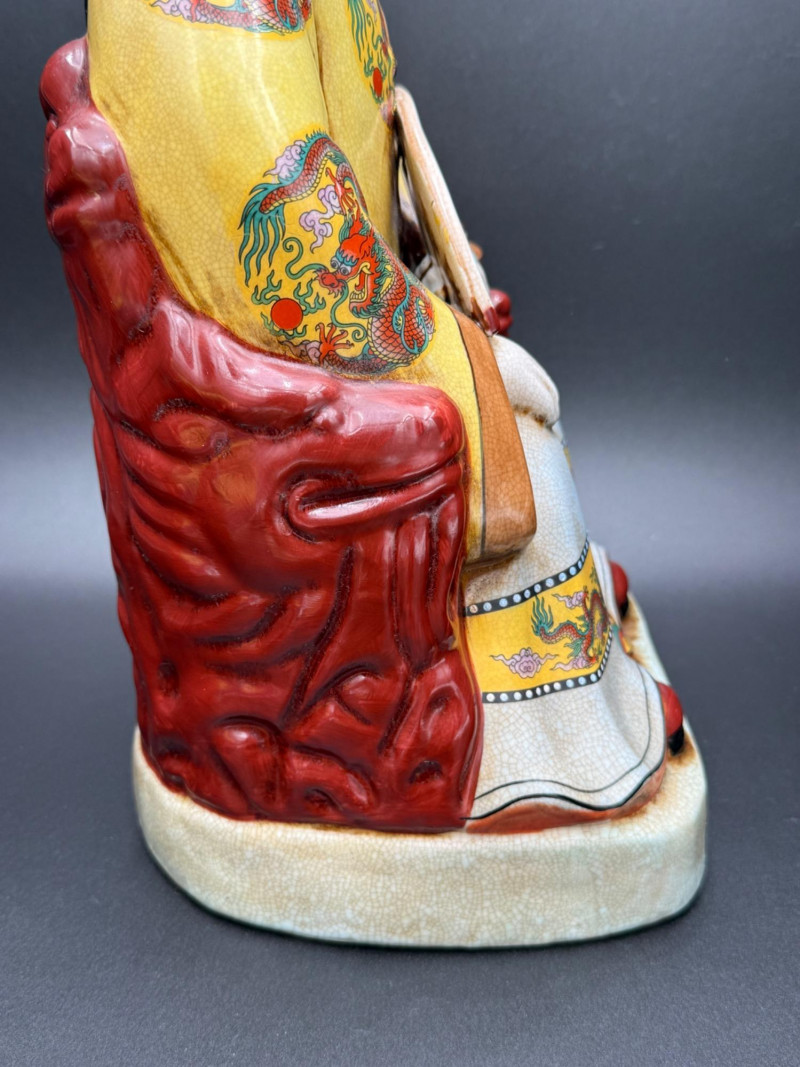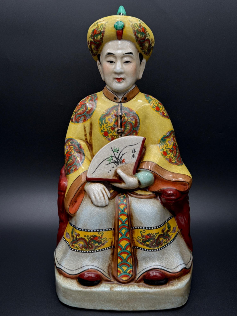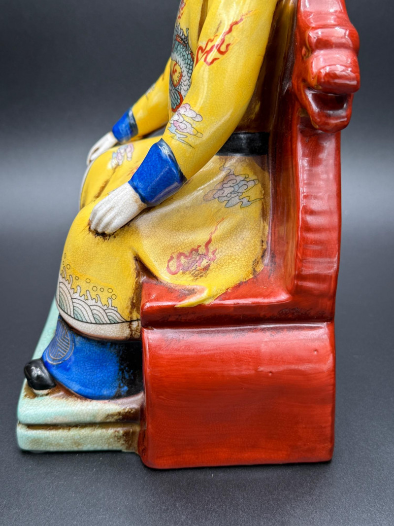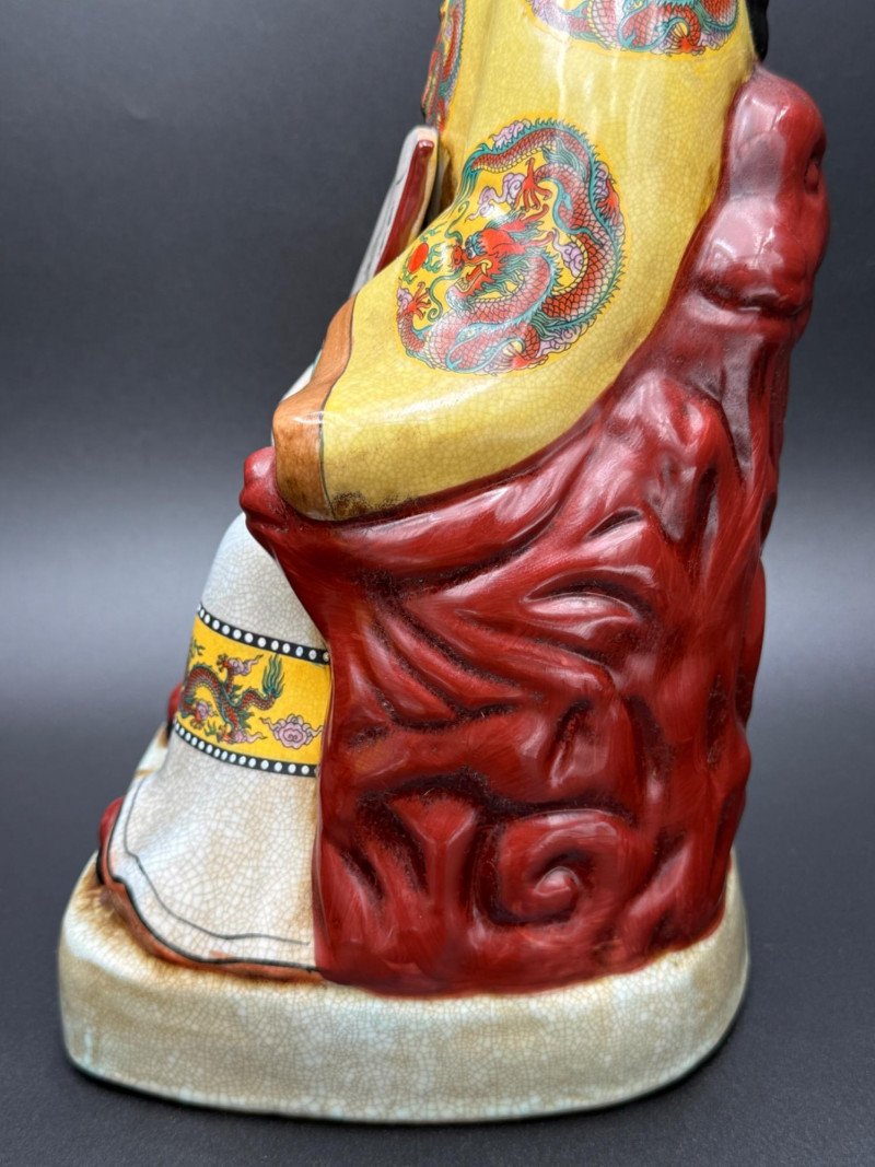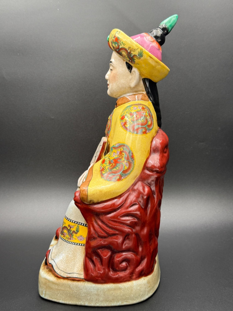 Vintage Chinese Emperor and Prince Porcelain Figures A pair of vintage Chinese porcelain figures representing an emperor and a prince. Both are seated on red thrones with molded detailing. The emperor holds a folding fan and wears a robe with floral and geometric patterns, a sash, and a rounded headdress with raised ornaments. The prince is dressed in a robe decorated with a dragon, with hands resting on the knees and a flat headdress with a top finial. Each figure has a long braided hairstyle and painted facial features. The undersides are unglazed and fitted with protective pads. Dimensions: