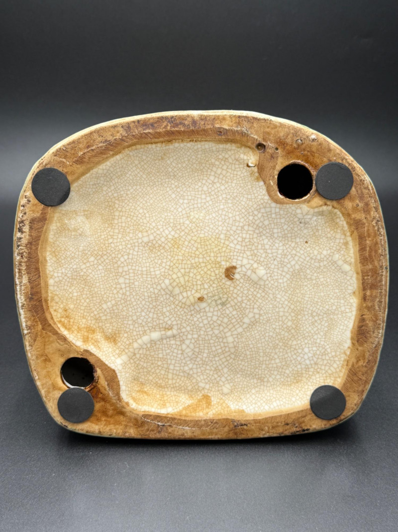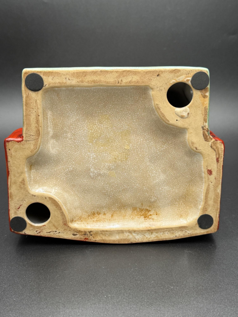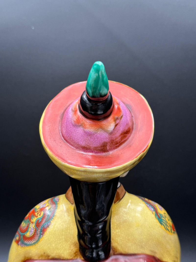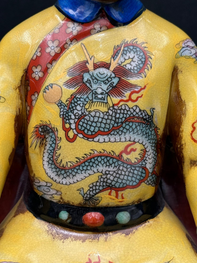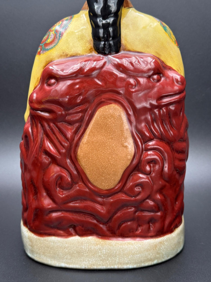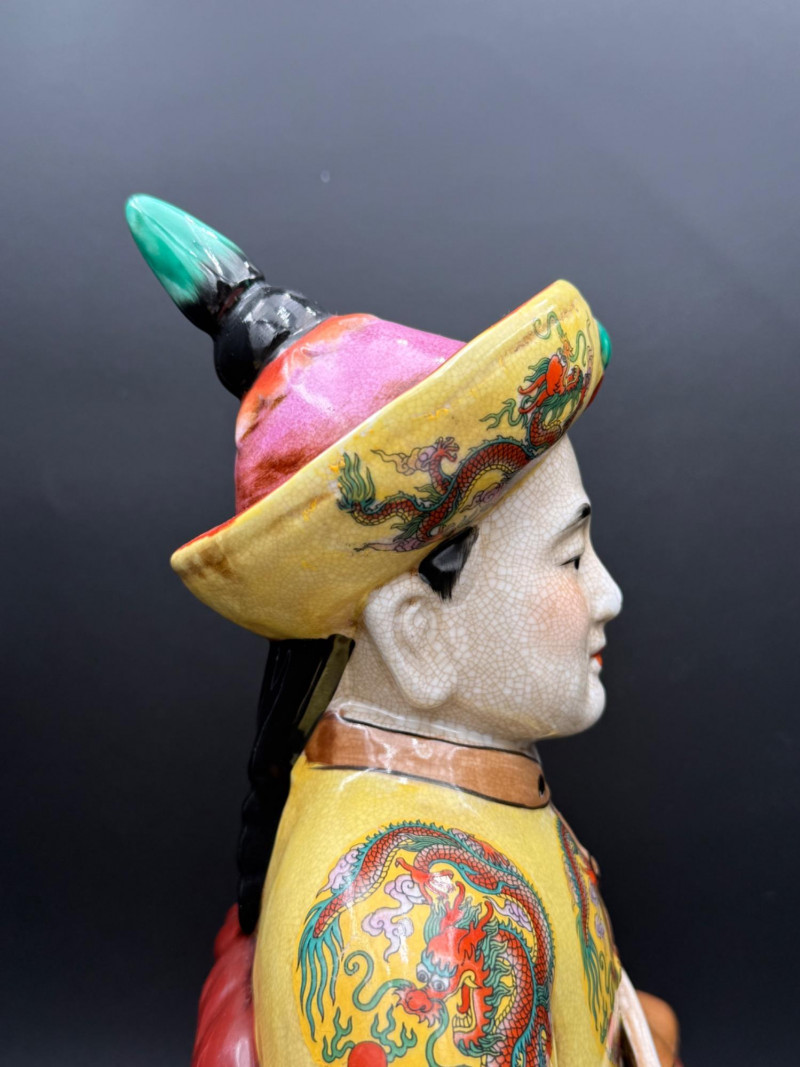 Vintage Chinese Emperor and Prince Porcelain Figures A pair of vintage Chinese porcelain figures representing an emperor and a prince. Both are seated on red thrones with molded detailing. The emperor holds a folding fan and wears a robe with floral and geometric patterns, a sash, and a rounded headdress with raised ornaments. The prince is dressed in a robe decorated with a dragon, with hands resting on the knees and a flat headdress with a top finial. Each figure has a long braided hairstyle and painted facial features. The undersides are unglazed and fitted with protective pads. Dimensions: