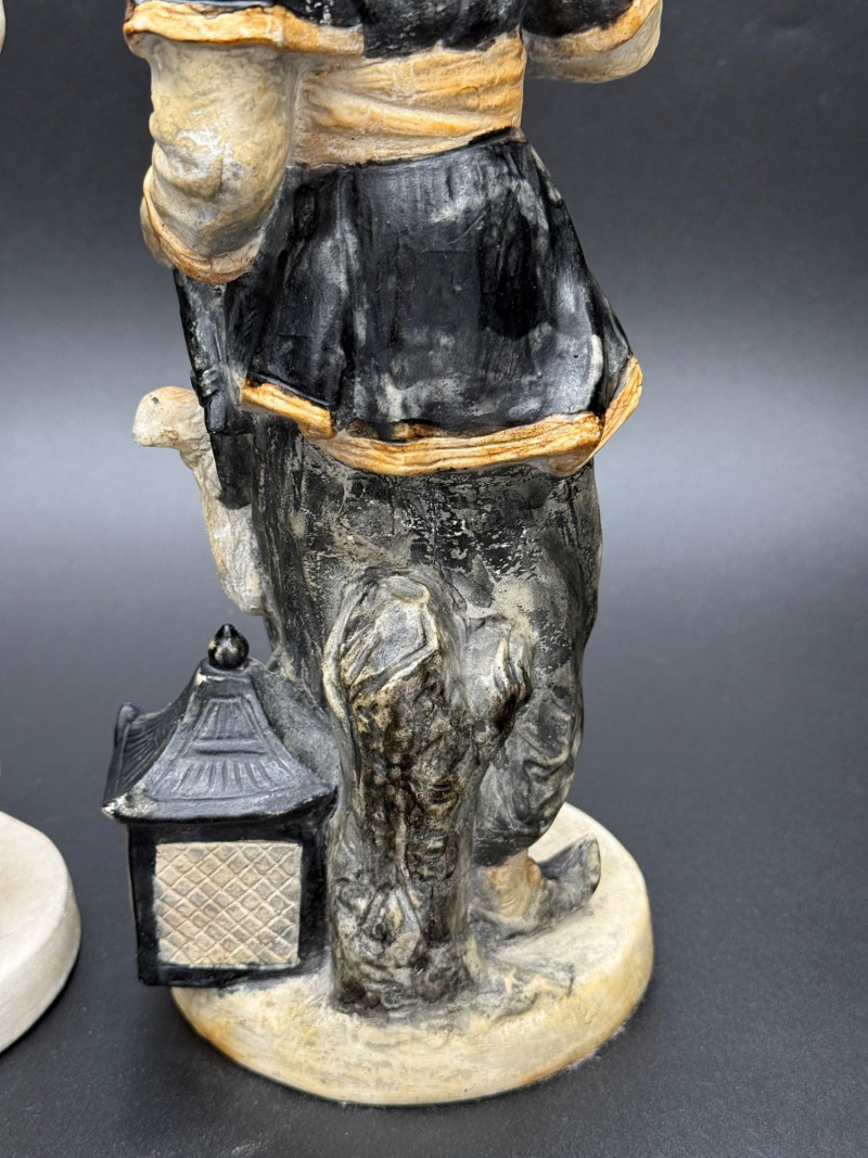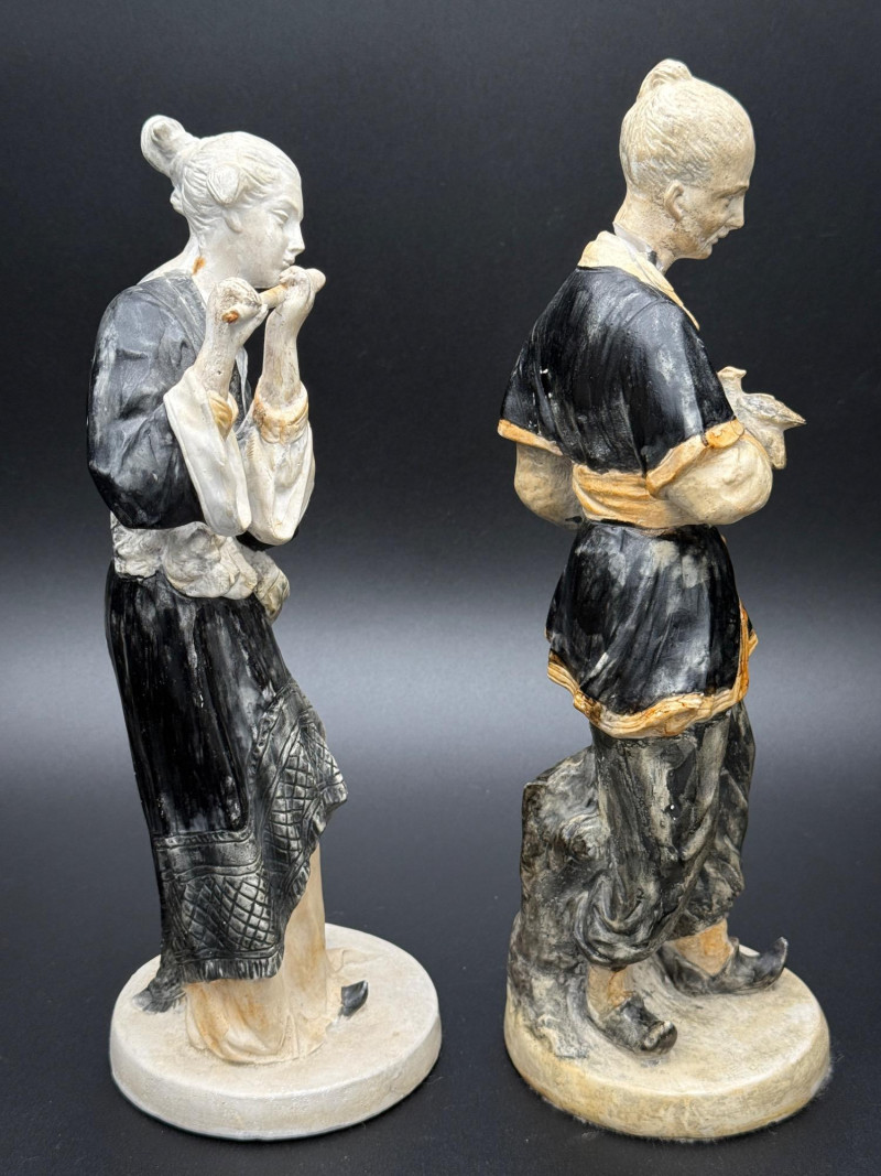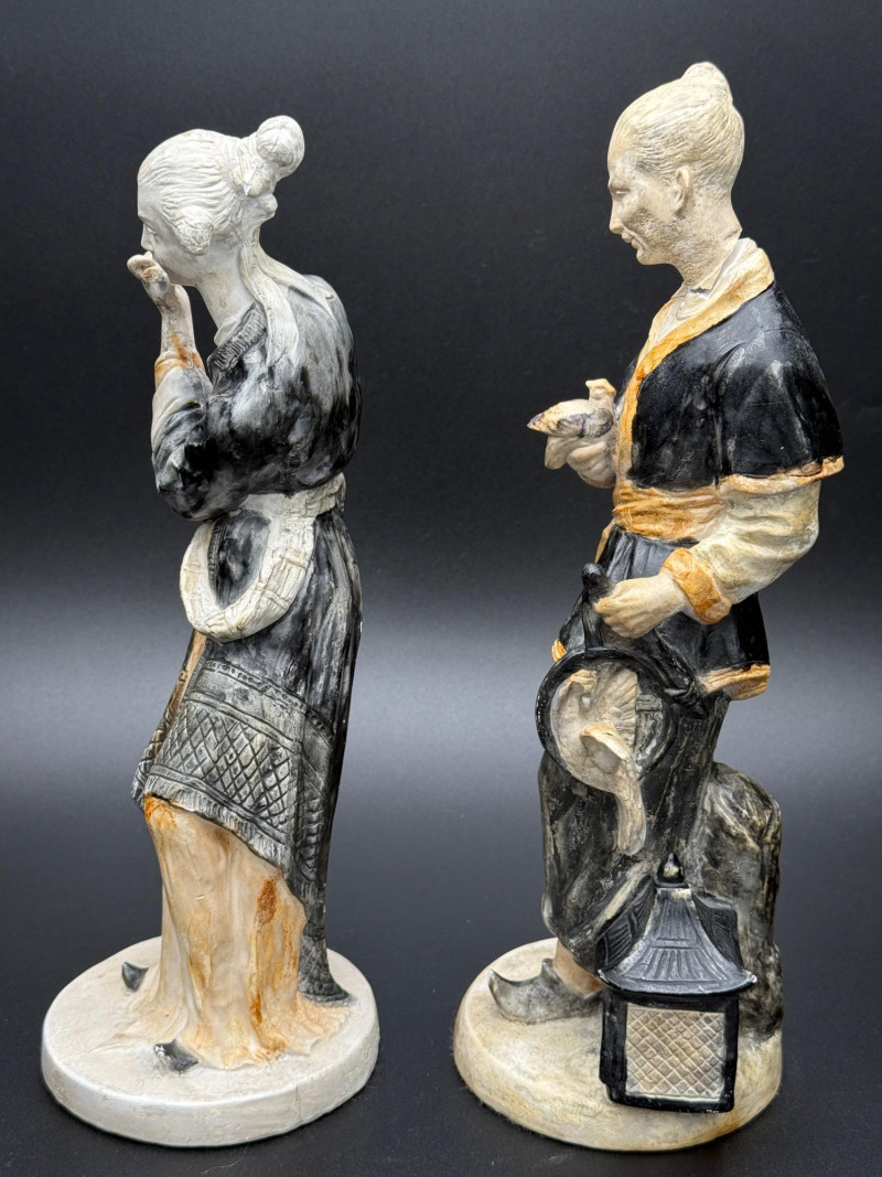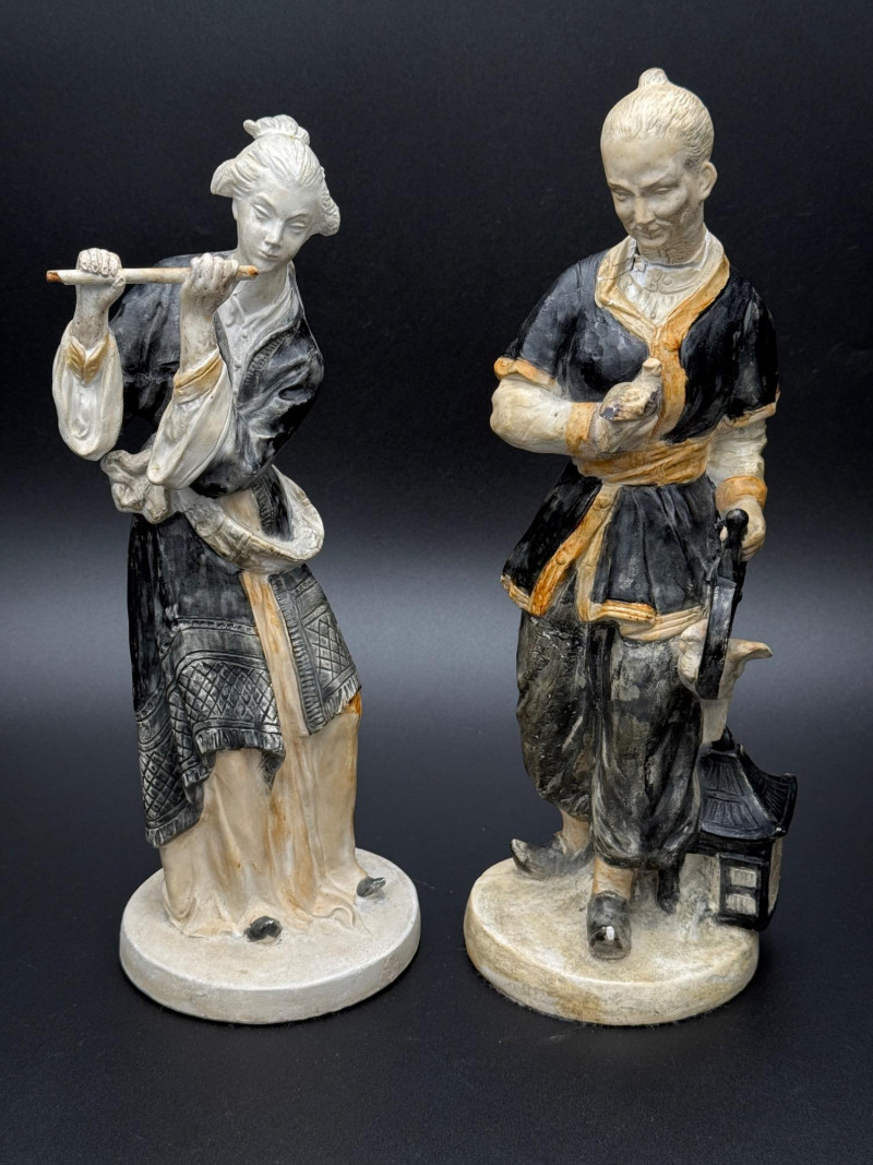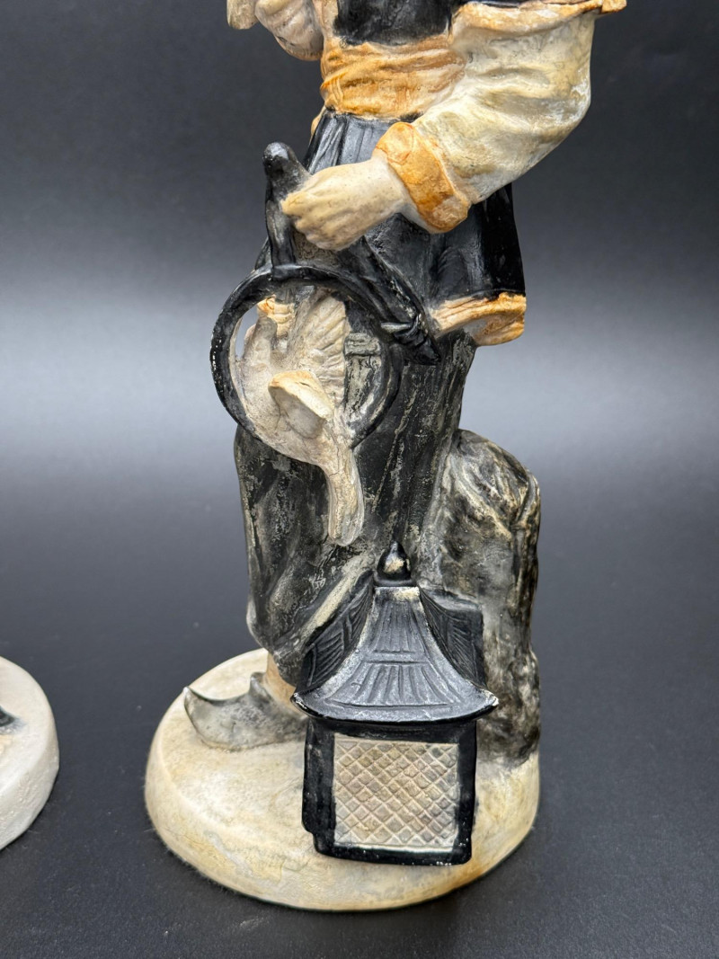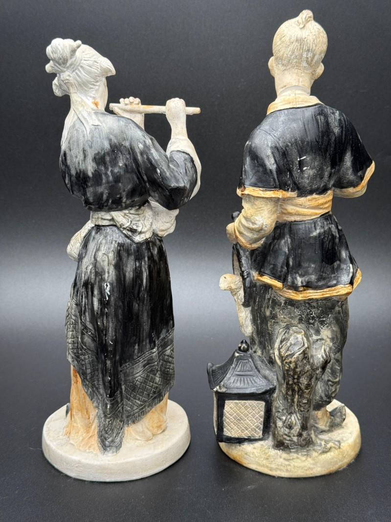 Pair of Asian-Inspired Ceramic Figures with Lantern and Flute Player Two standing ceramic figures designed in an Asian-inspired style. One figure holds a bird and a lantern, dressed in a belted robe and cropped trousers. The other figure is posed playing a flute, wearing a patterned garment with a tied sash. Both figures feature stylized facial expressions and detailed hair arrangements. Surfaces are finished in tones of black, cream, and ochre. The bases are felt-covered; one bears a label marked “Hecht’s.” Approximate Dimensions: