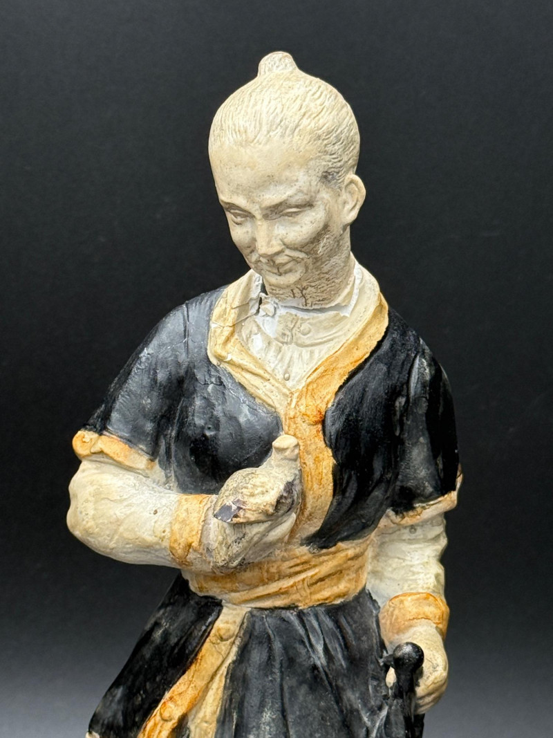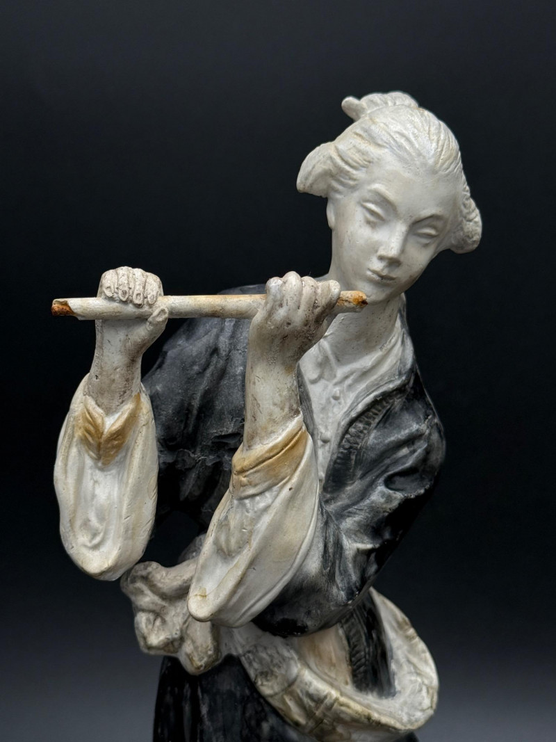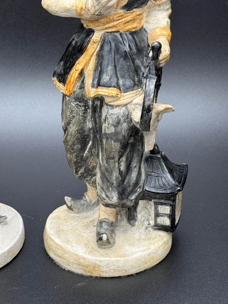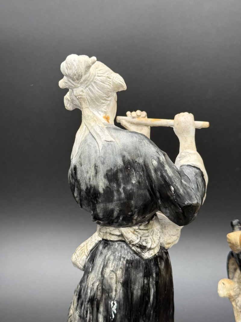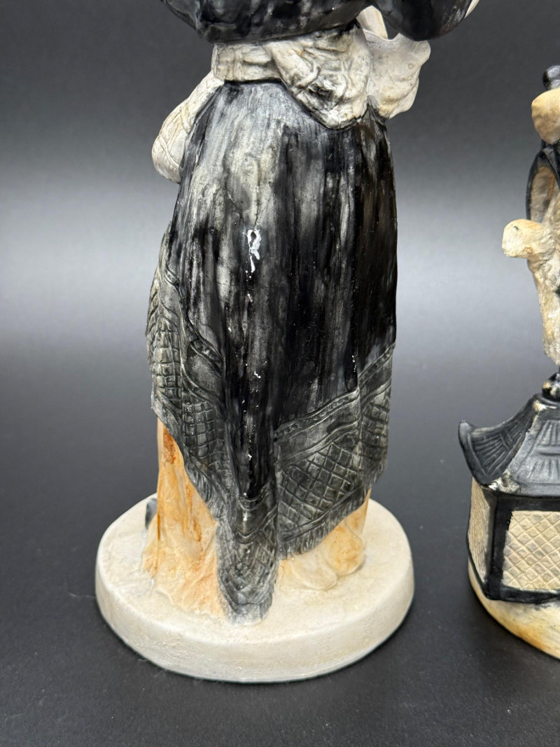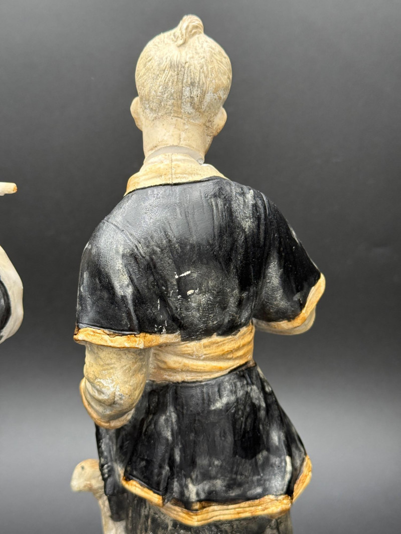 Pair of Asian-Inspired Ceramic Figures with Lantern and Flute Player Two standing ceramic figures designed in an Asian-inspired style. One figure holds a bird and a lantern, dressed in a belted robe and cropped trousers. The other figure is posed playing a flute, wearing a patterned garment with a tied sash. Both figures feature stylized facial expressions and detailed hair arrangements. Surfaces are finished in tones of black, cream, and ochre. The bases are felt-covered; one bears a label marked “Hecht’s.” Approximate Dimensions: