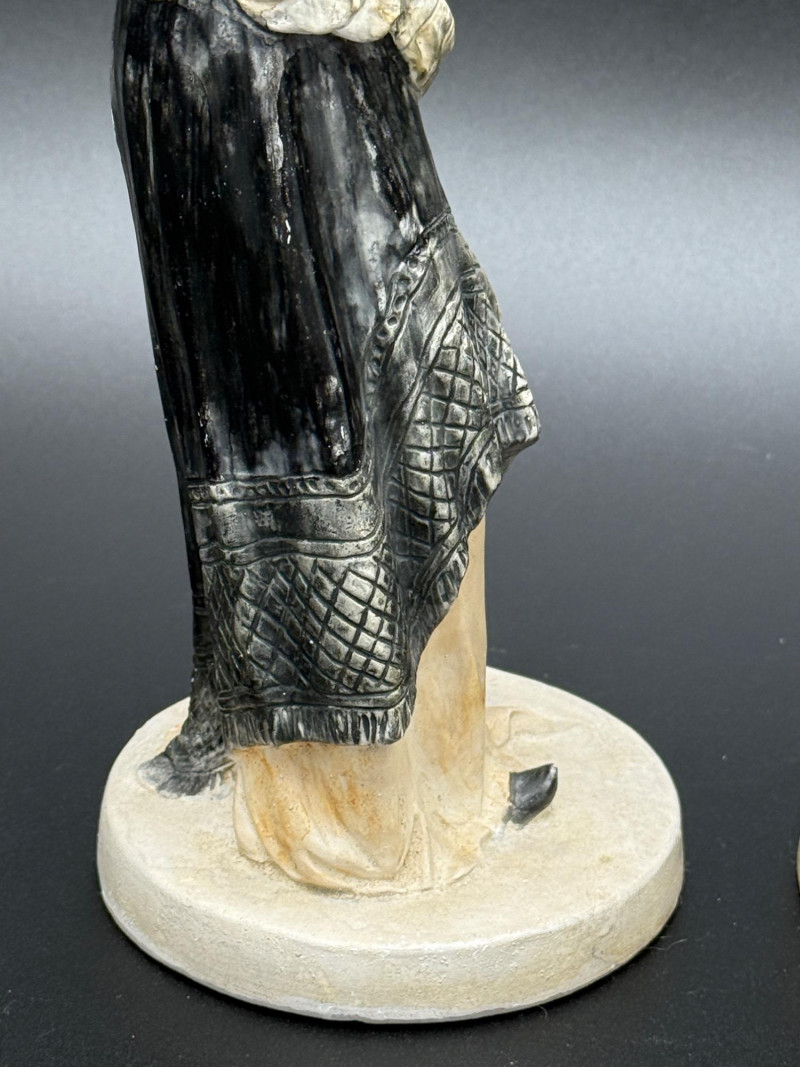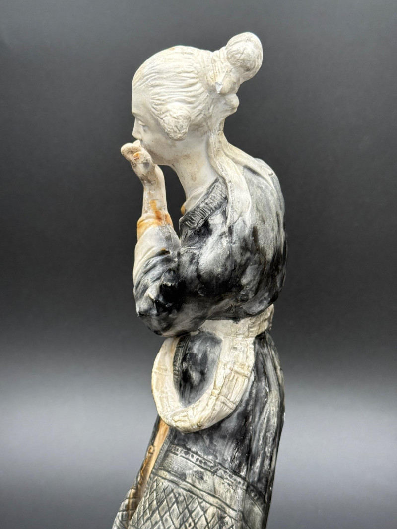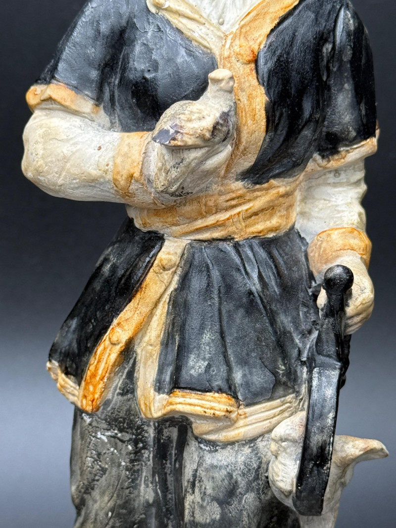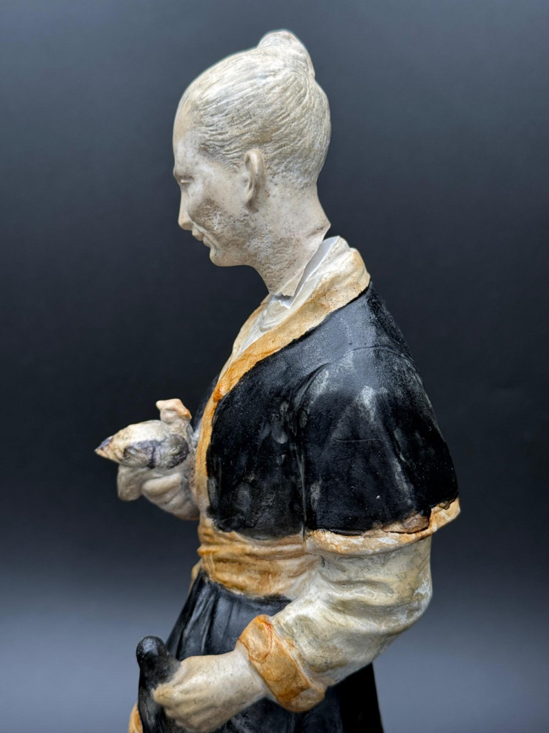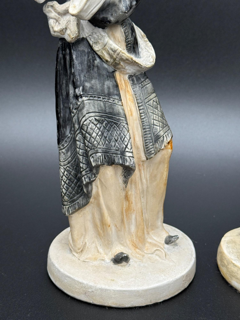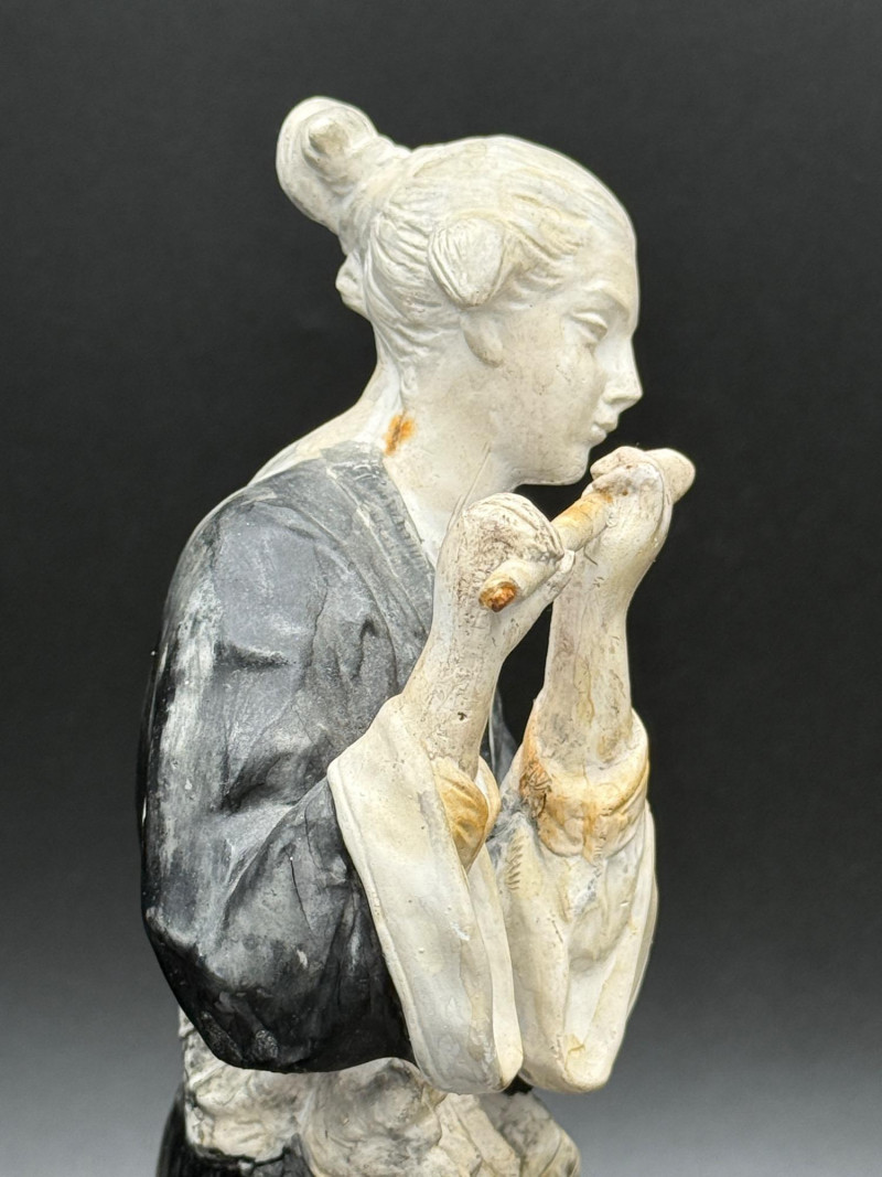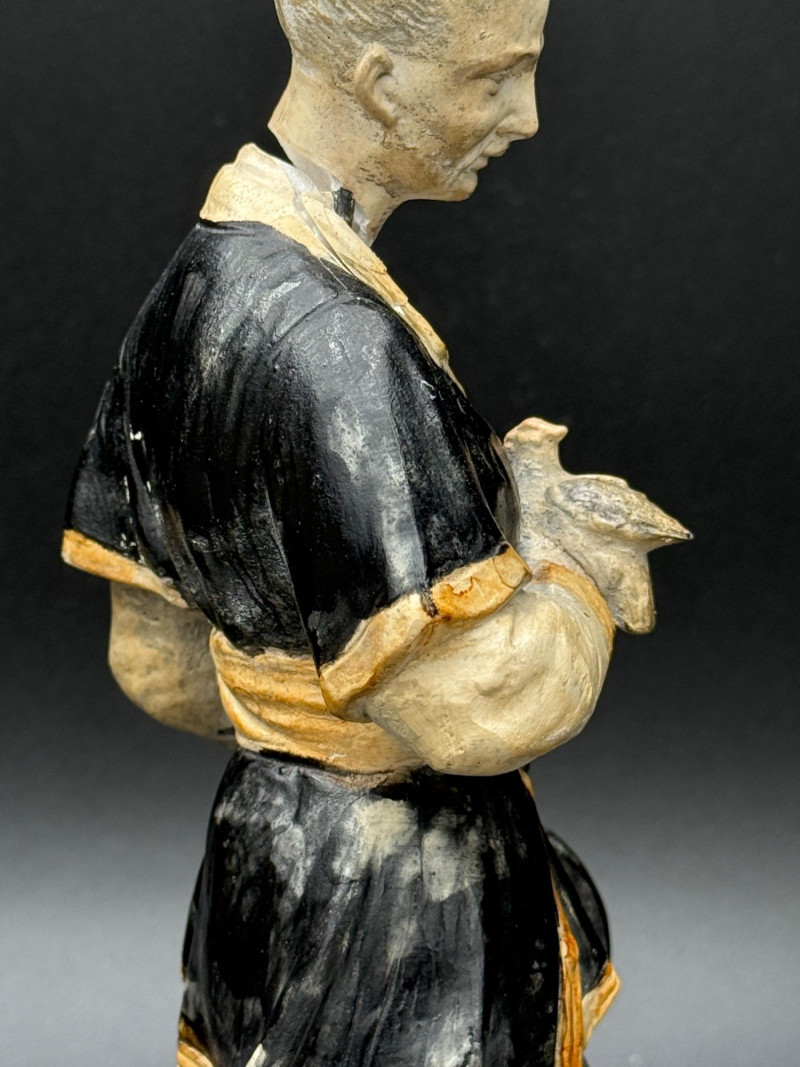 Pair of Asian-Inspired Ceramic Figures with Lantern and Flute Player Two standing ceramic figures designed in an Asian-inspired style. One figure holds a bird and a lantern, dressed in a belted robe and cropped trousers. The other figure is posed playing a flute, wearing a patterned garment with a tied sash. Both figures feature stylized facial expressions and detailed hair arrangements. Surfaces are finished in tones of black, cream, and ochre. The bases are felt-covered; one bears a label marked “Hecht’s.” Approximate Dimensions: