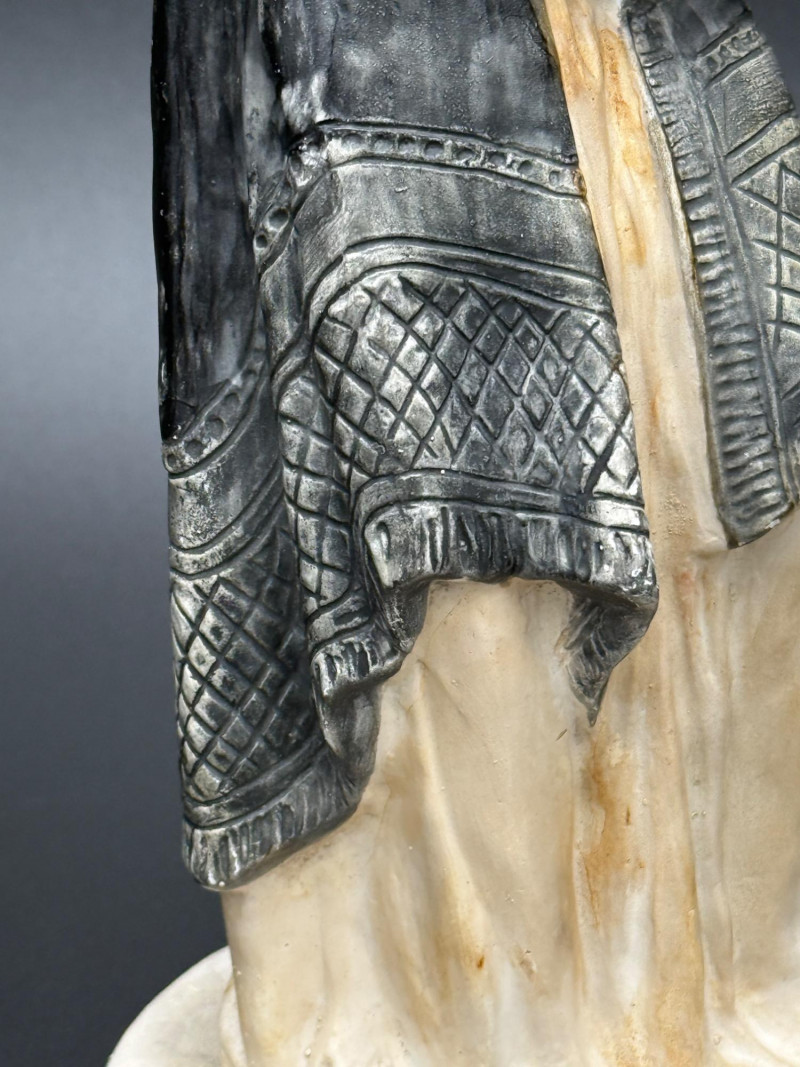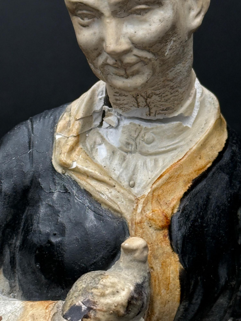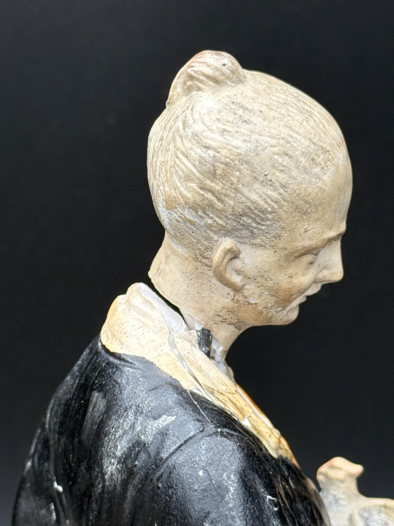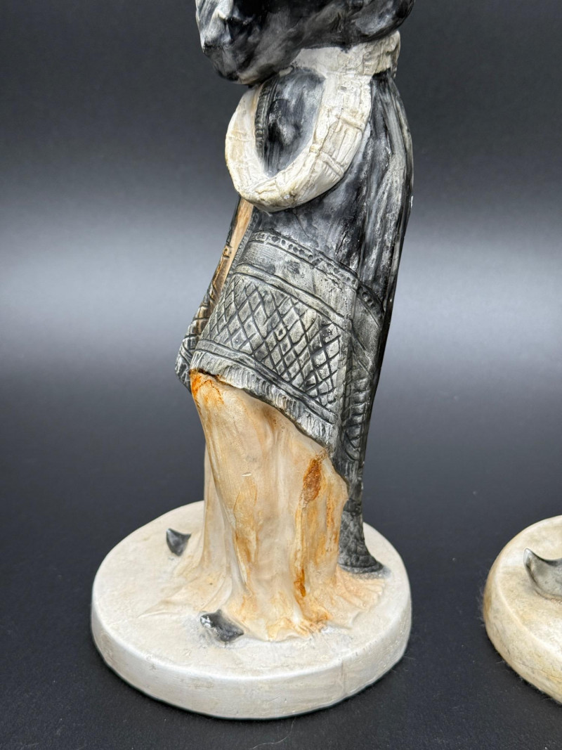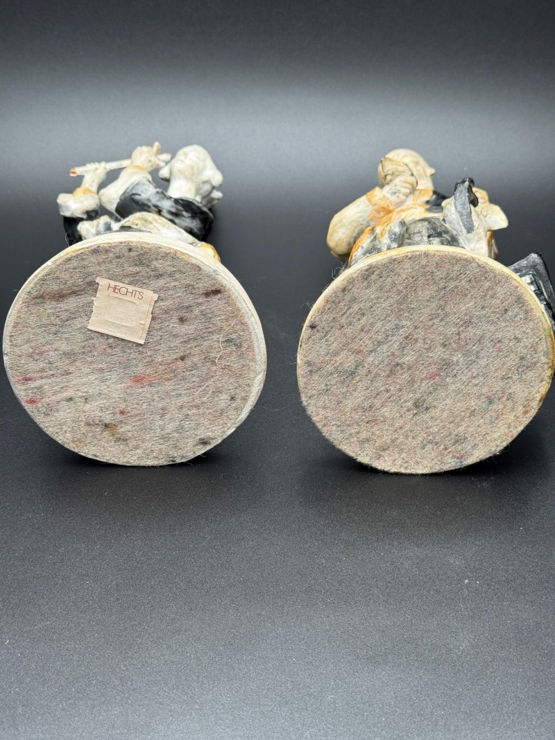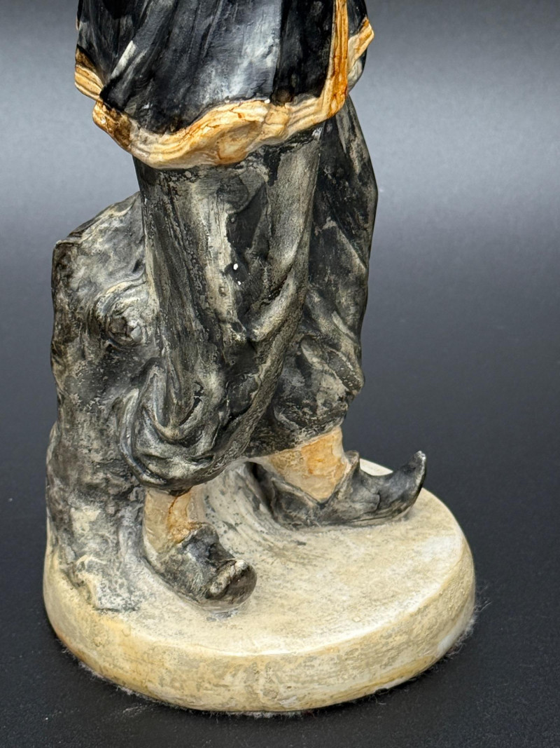 Pair of Asian-Inspired Ceramic Figures with Lantern and Flute Player Two standing ceramic figures designed in an Asian-inspired style. One figure holds a bird and a lantern, dressed in a belted robe and cropped trousers. The other figure is posed playing a flute, wearing a patterned garment with a tied sash. Both figures feature stylized facial expressions and detailed hair arrangements. Surfaces are finished in tones of black, cream, and ochre. The bases are felt-covered; one bears a label marked “Hecht’s.” Approximate Dimensions: