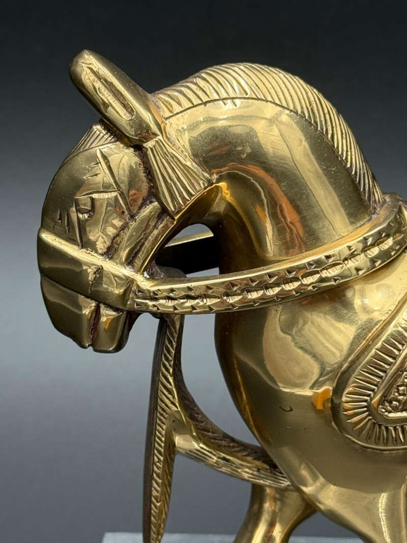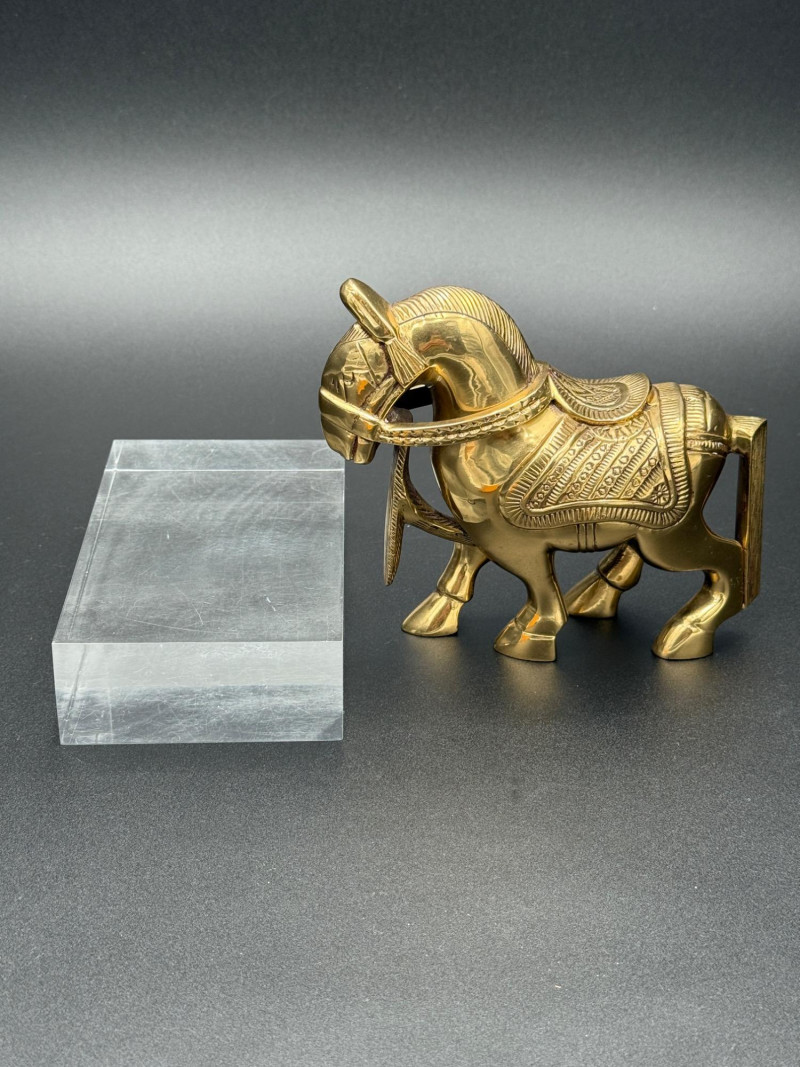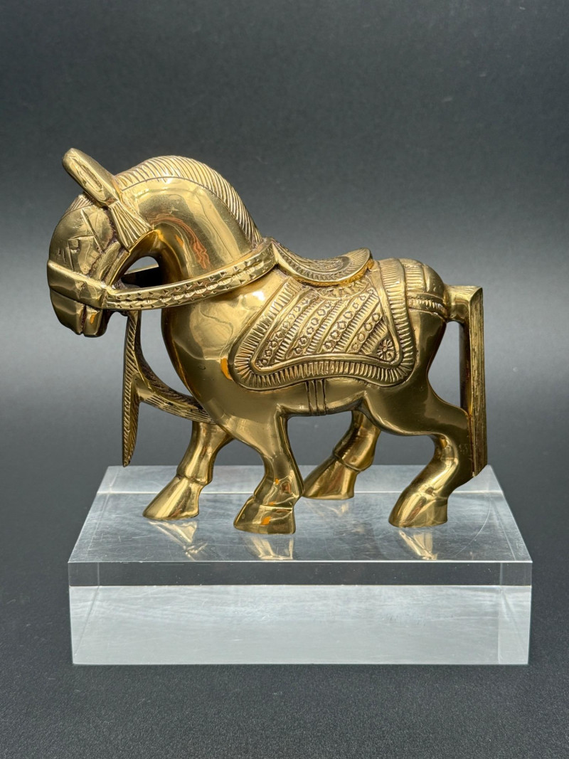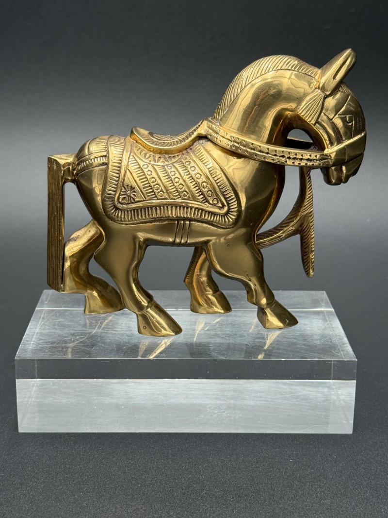 Brass Horse Sculpture on Clear Base Figurine depicting a bridled horse standing with head slightly lowered and tail hanging straight. The surface is detailed with a patterned saddle and tack, featuring repeated geometric designs on both sides. The horse stands on a rectangular clear block base. Material: Possibly brass