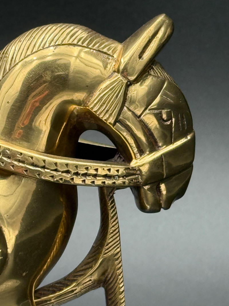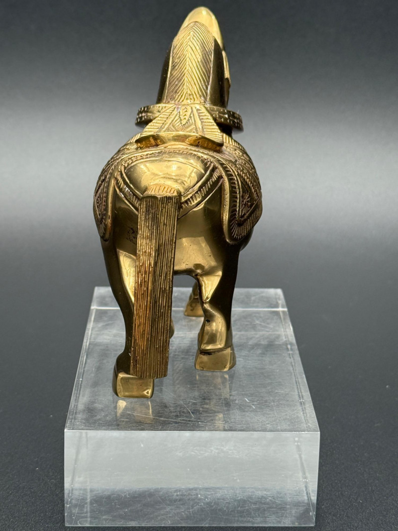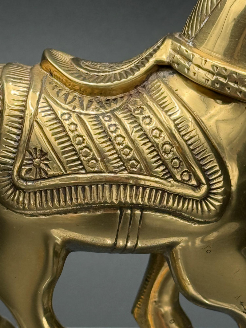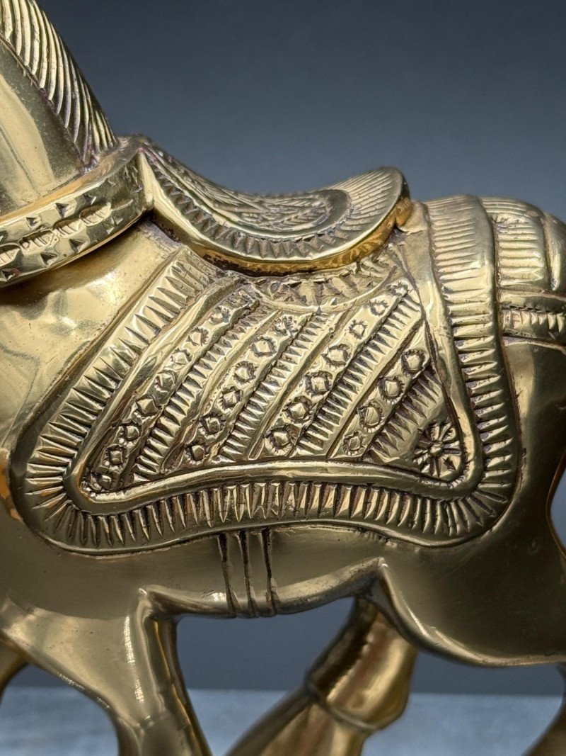 Brass Horse Sculpture on Clear Base Figurine depicting a bridled horse standing with head slightly lowered and tail hanging straight. The surface is detailed with a patterned saddle and tack, featuring repeated geometric designs on both sides. The horse stands on a rectangular clear block base. Material: Possibly brass
