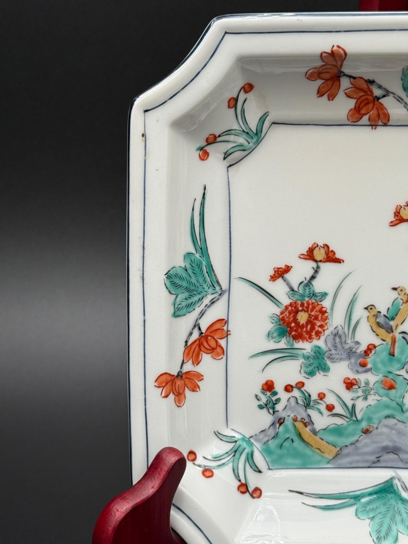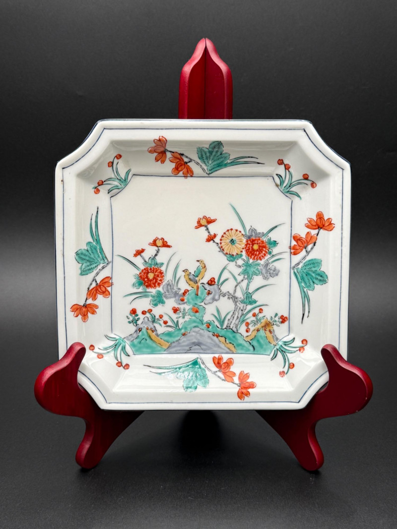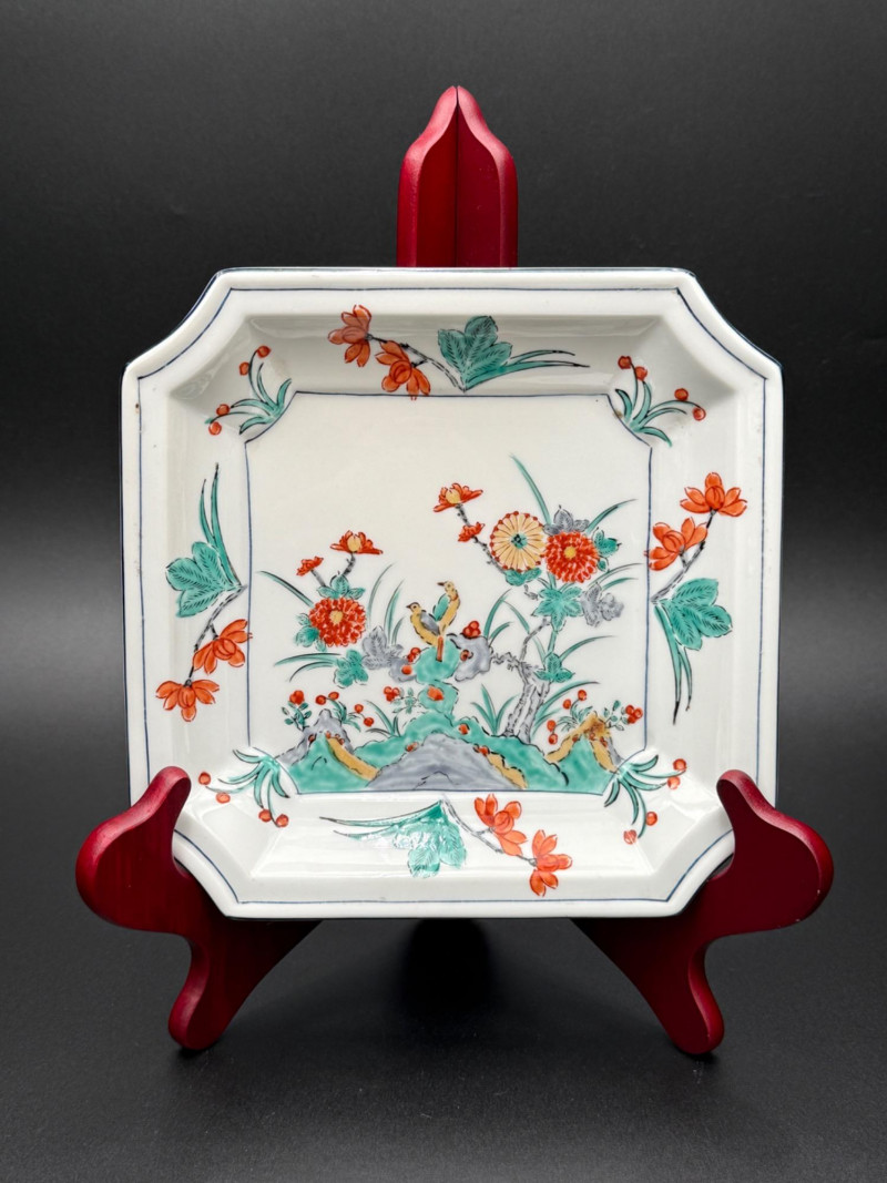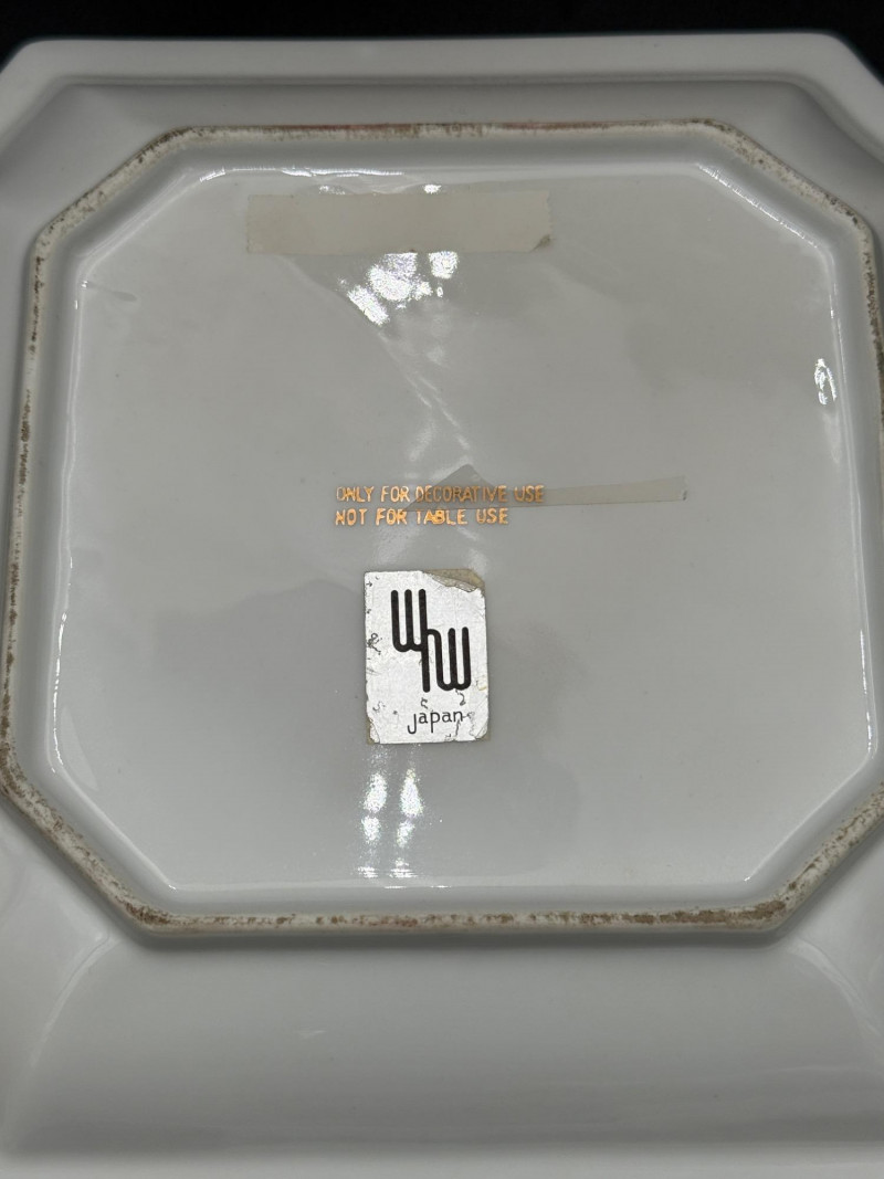 Japanese Decorative Plate by Uchida with Stand Octagonal plate featuring a scene of birds among flowering plants and rocks. The surface includes a bordered frame around the central motif. The underside bears a sticker marked “Uchida Japan” along with the note “Only for decorative use, not for table use.” The plate is displayed on a wooden stand. Dimensions: Plate: 12 inches Stand height: 7 inches