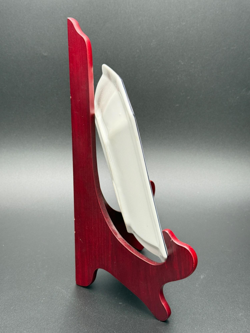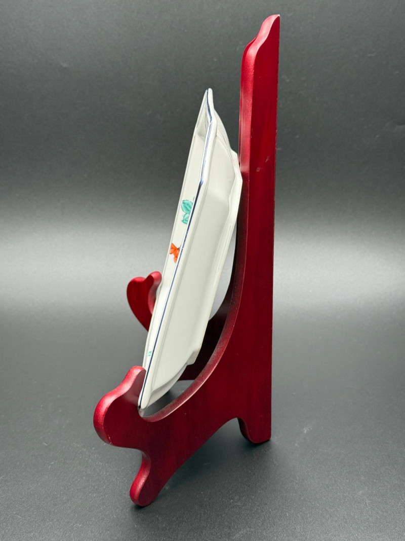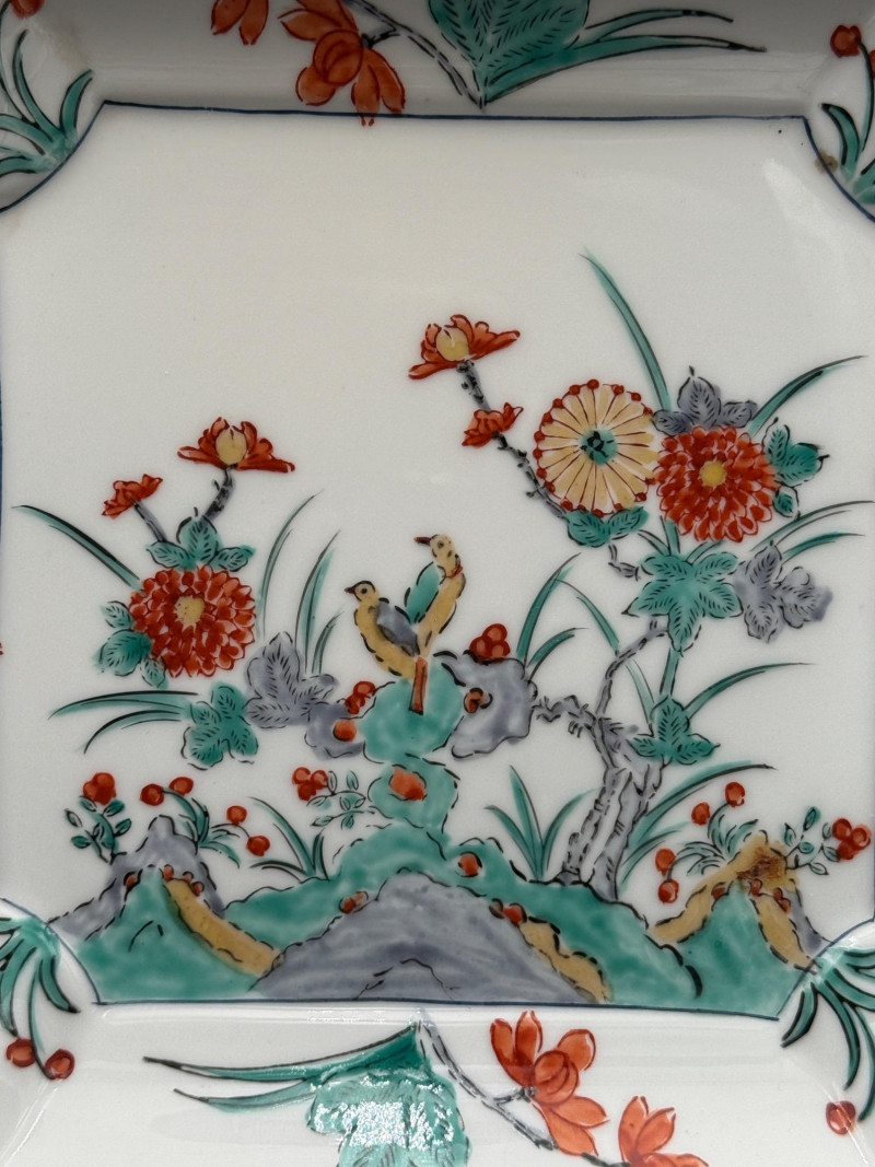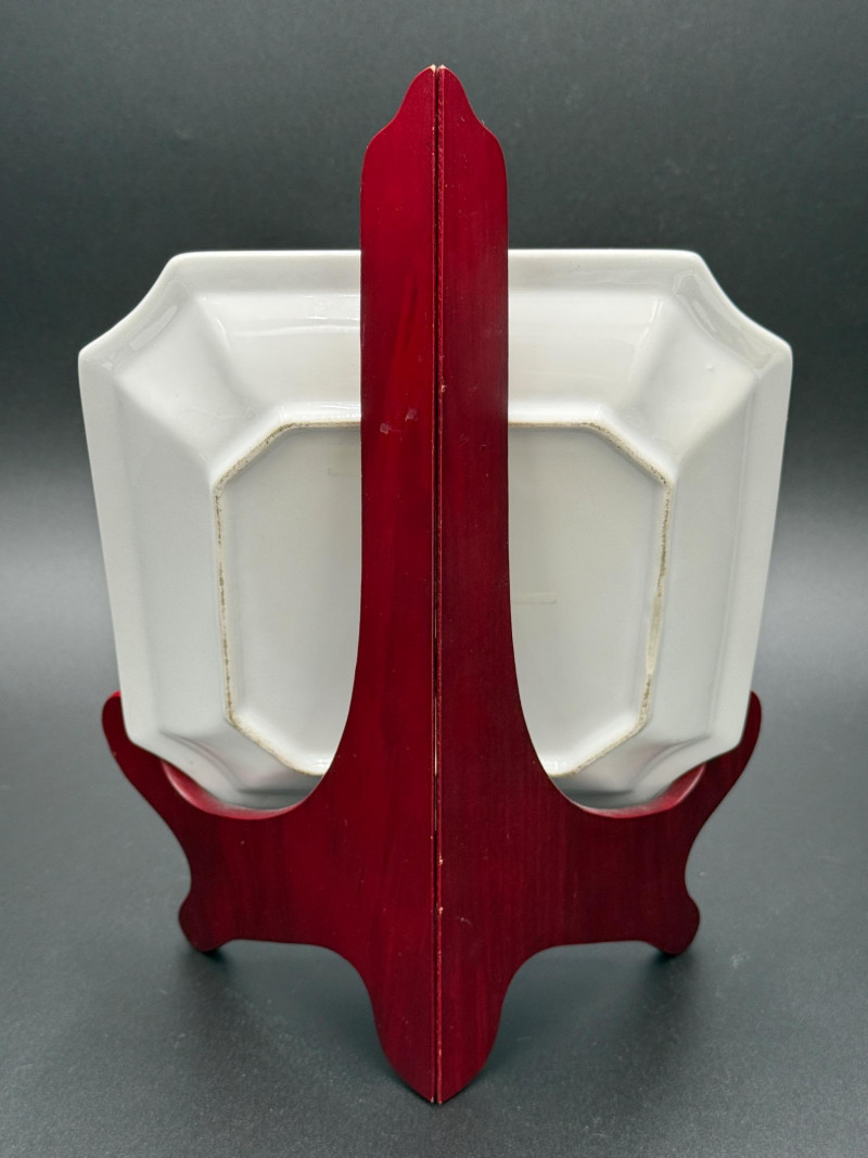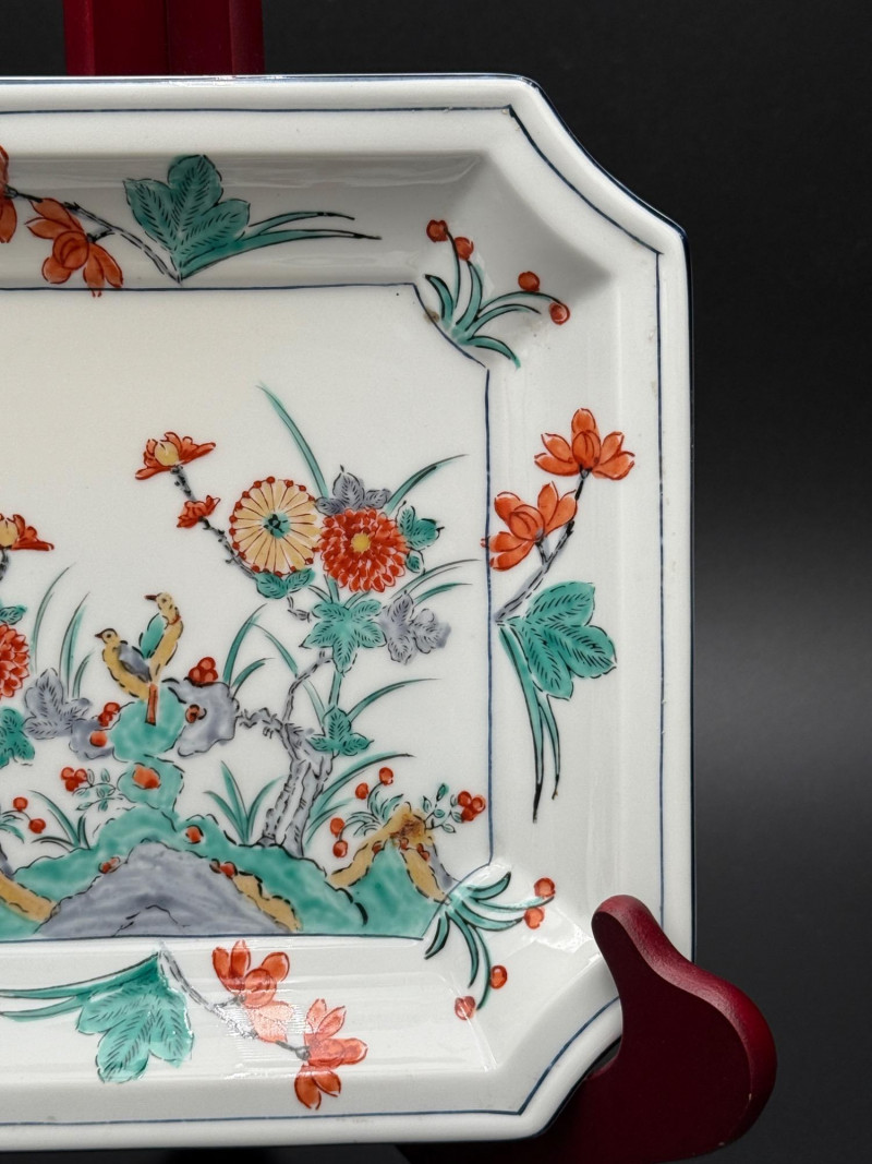 Japanese Decorative Plate by Uchida with Stand Octagonal plate featuring a scene of birds among flowering plants and rocks. The surface includes a bordered frame around the central motif. The underside bears a sticker marked “Uchida Japan” along with the note “Only for decorative use, not for table use.” The plate is displayed on a wooden stand. Dimensions: Plate: 12 inches Stand height: 7 inches